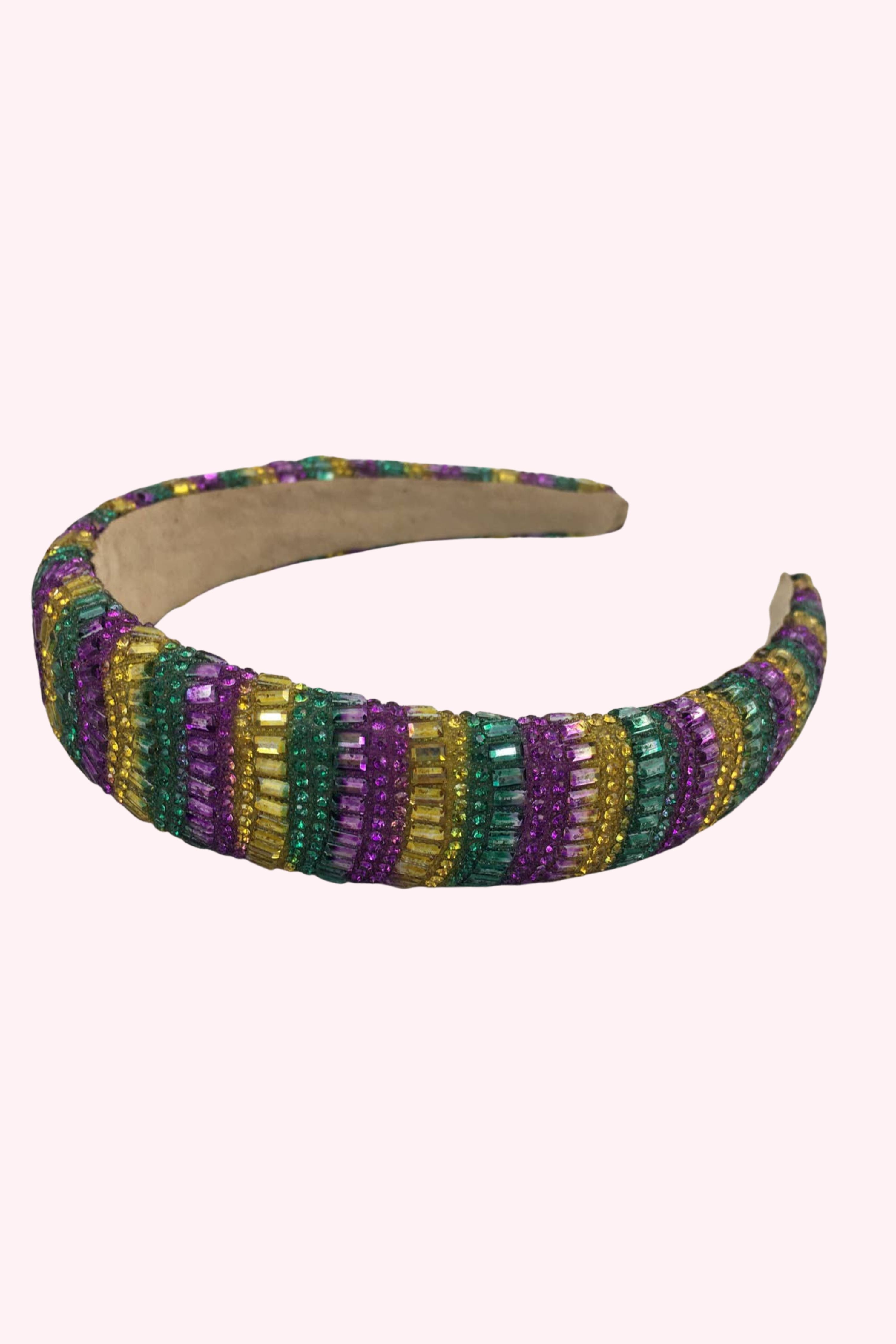 Elevate your Mardi Gras celebration with this stunning rhinestone headband that captures the spirit of the season. Adorned with glittering rhinestones that catch the light with every movement, this accessory transforms any outfit into a festive statement. Perfect for parades, parties, or themed events, it adds instant glamour and festive flair to your look. Comfortable to wear throughout the day or night, this headband ensures you'll shine brighter than the rest while celebrating in style.