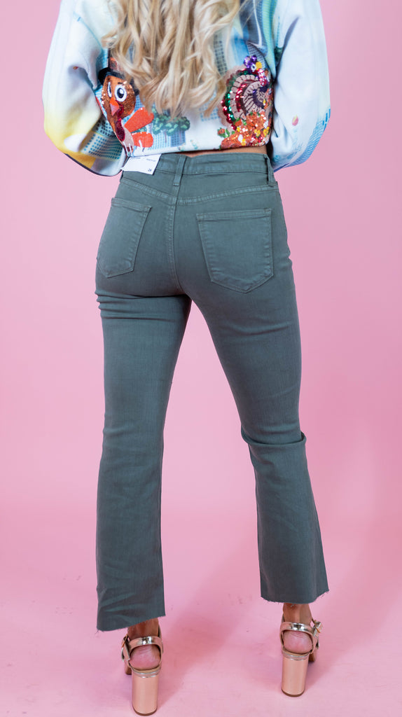The Cropped Demi Flare Jeans combine a flattering slim fit from hip to thigh with a gentle flare that hits just above the ankle, perfect for showcasing your favorite shoes. Crafted with just the right amount of stretch, they offer all-day comfort without sacrificing style. Finished in a timeless vintage olive, these jeans are a versatile wardrobe staple destined to become a fast favorite.