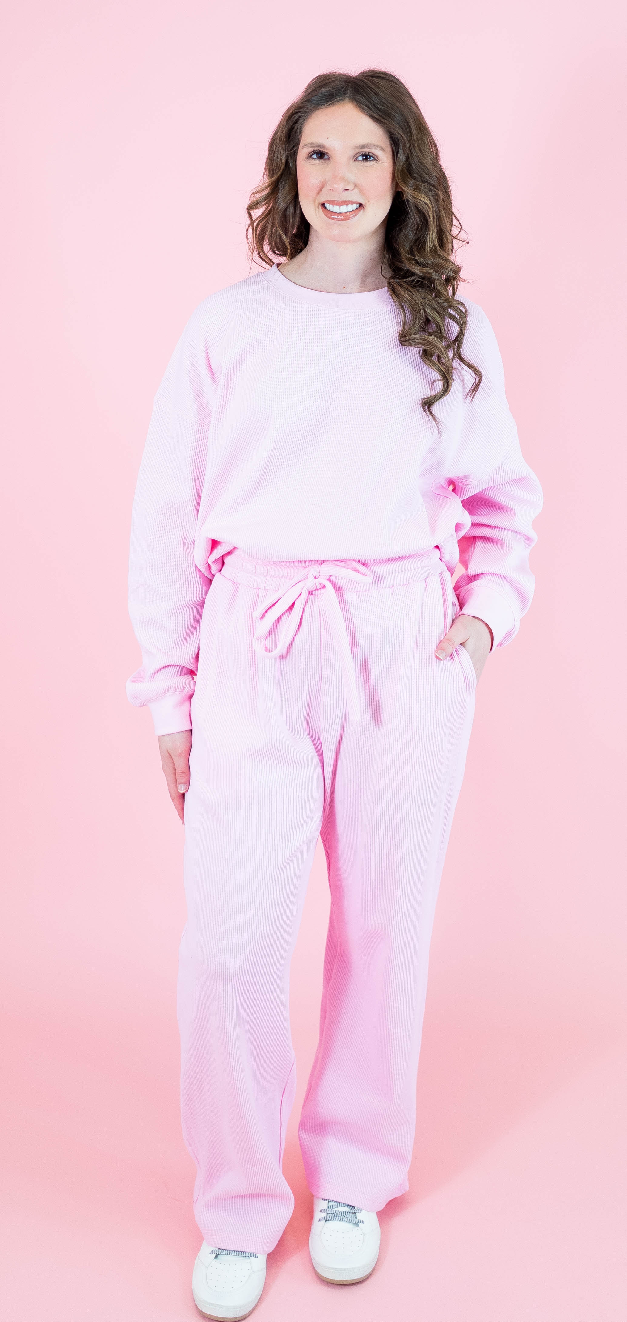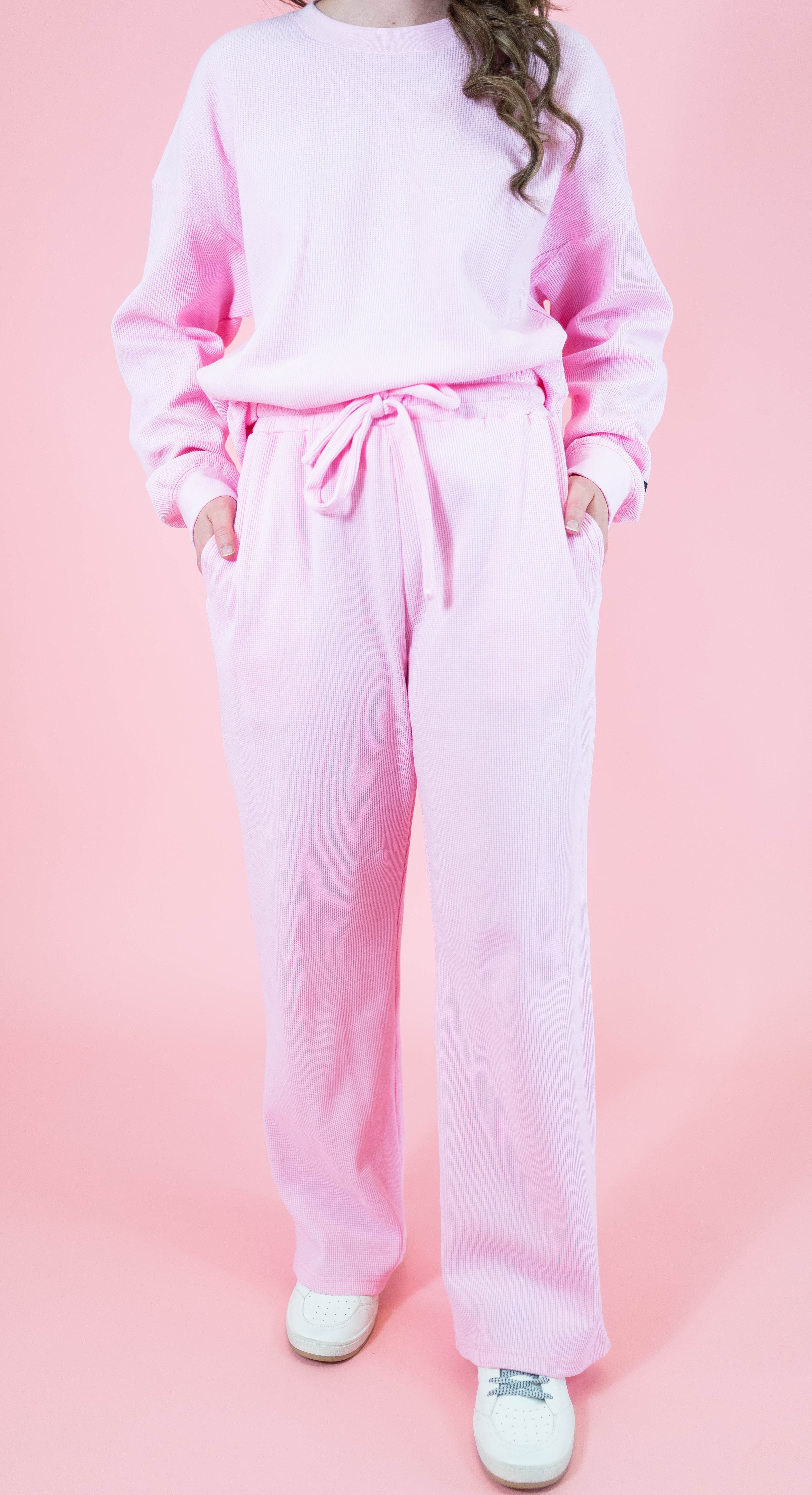 Cozy meets cute in our Waffle Pop Collection! Made from ultra-soft waffle knit fabric (95% Cotton and 5% Spandex), these pants are designed for all-day comfort with a relaxed, wide-leg fit. The ribbed waistband with a functional drawcord gives you the perfect adjustable fit, while pockets (yes, pockets!) add the practicality you’ll love. Pair them with the matching top to complete the coziest set ever.