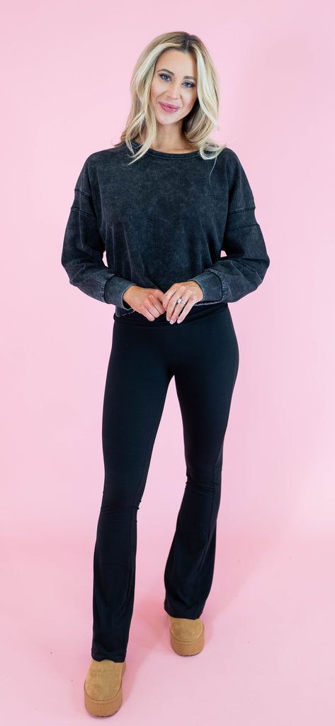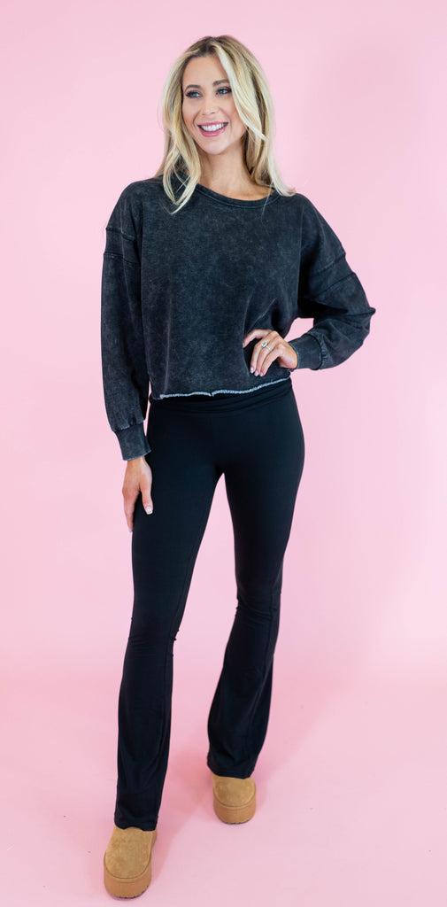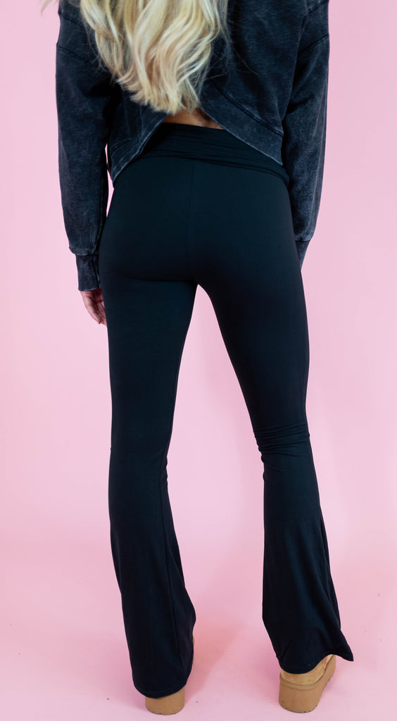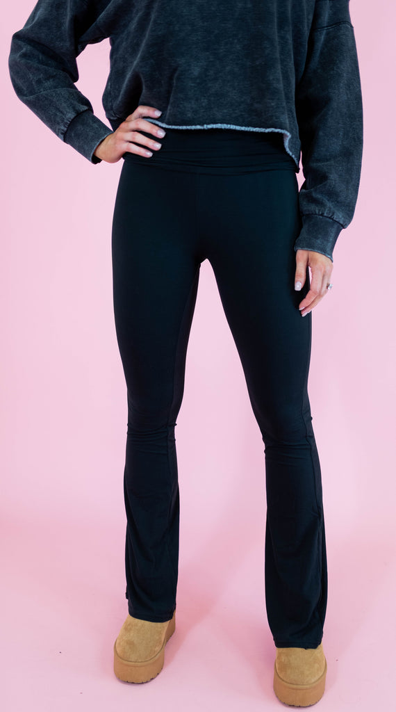 Effortlessly chic and incredibly comfortable, these Soft Knit Foldover Flare Pants deliver the perfect blend of style and ease. The luxuriously soft knit fabric moves with you throughout your day, while the flattering foldover waistband adds a touch of modern sophistication. Flared legs create an elegant silhouette that works perfect with sneakers. Available in classic black, these versatile pants transition seamlessly from casual outings to elevated everyday wear. A wardrobe essential that feels as good as it looks.