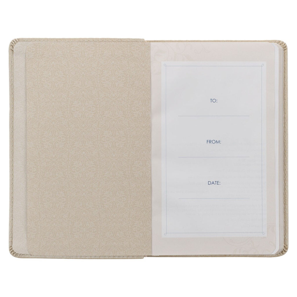 The prayer book is covered in soft gold-toned faux leather that is slightly textured. The gold-foiled title on the front page is sandwiched between two ornate filigree designs.