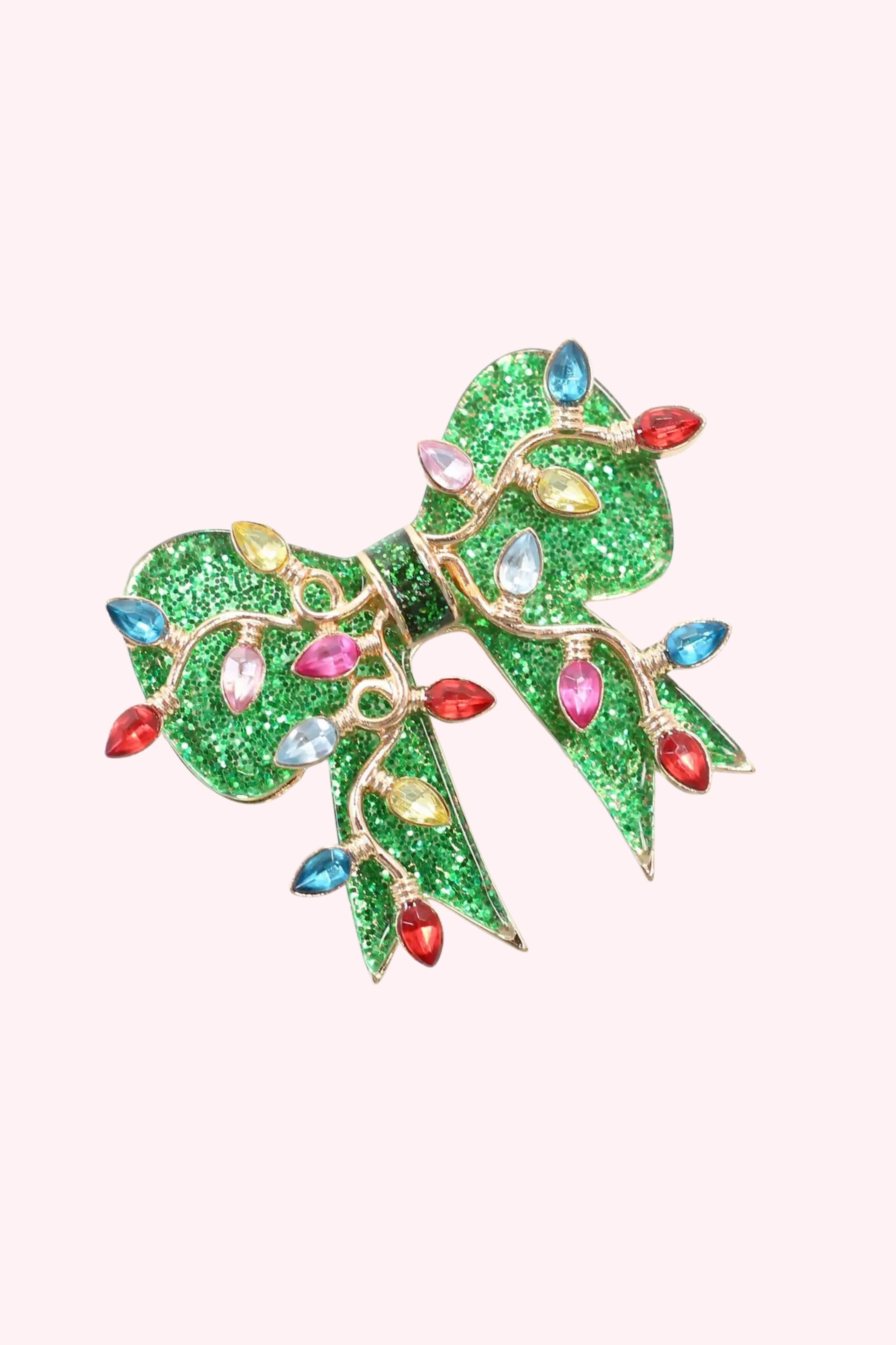Add a festive touch to any outfit with the Bright and Merry Bow Brooch in Green. This glittered acetate bow pin features colorful crystals and gold accents that mimic the sparkle of Christmas lights, making it a chic accessory for holiday celebrations. Perfect for adding a stylish, joyful glow to your seasonal look.
