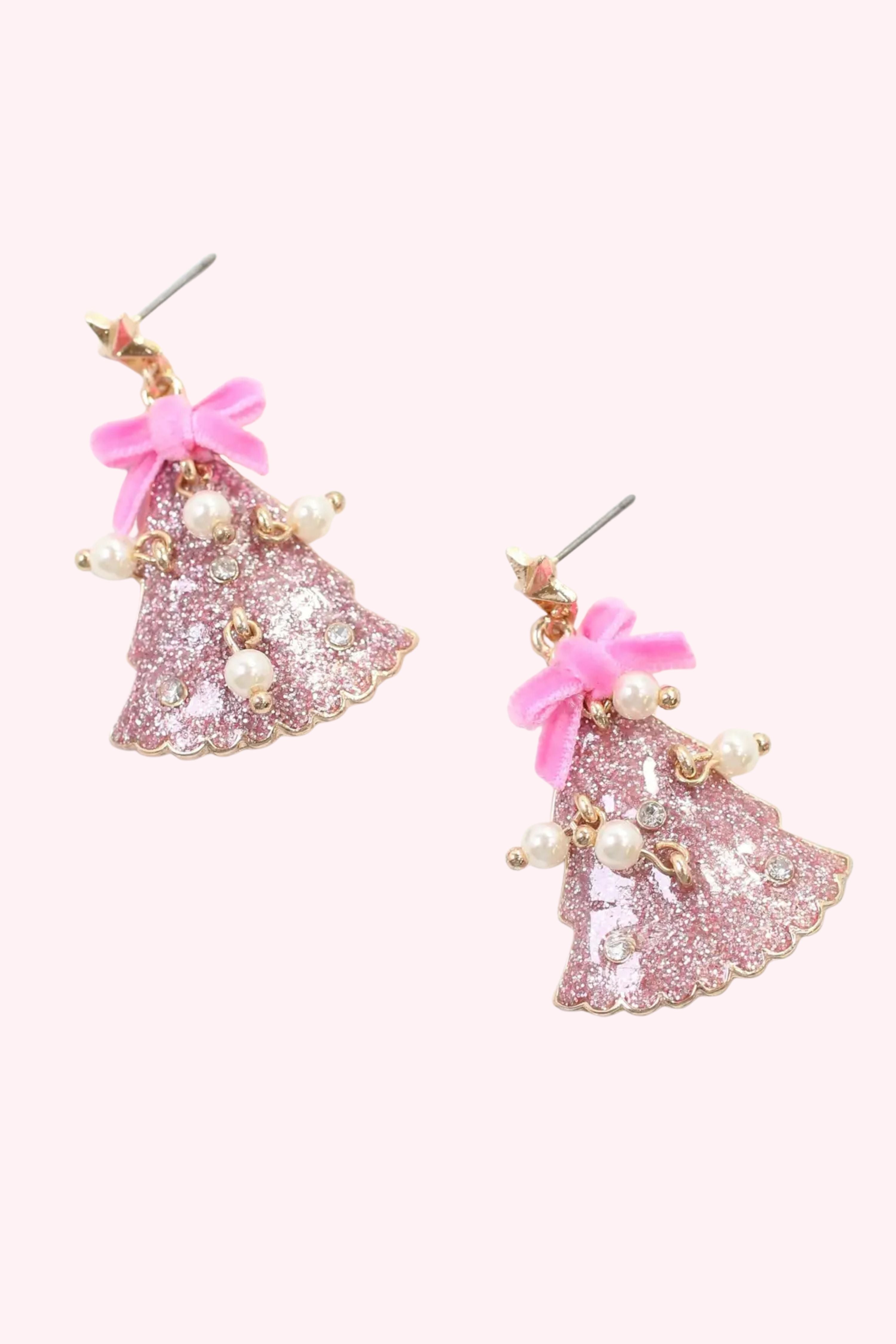 Christmas Tree Earrings with Bow & Pearls - Pink