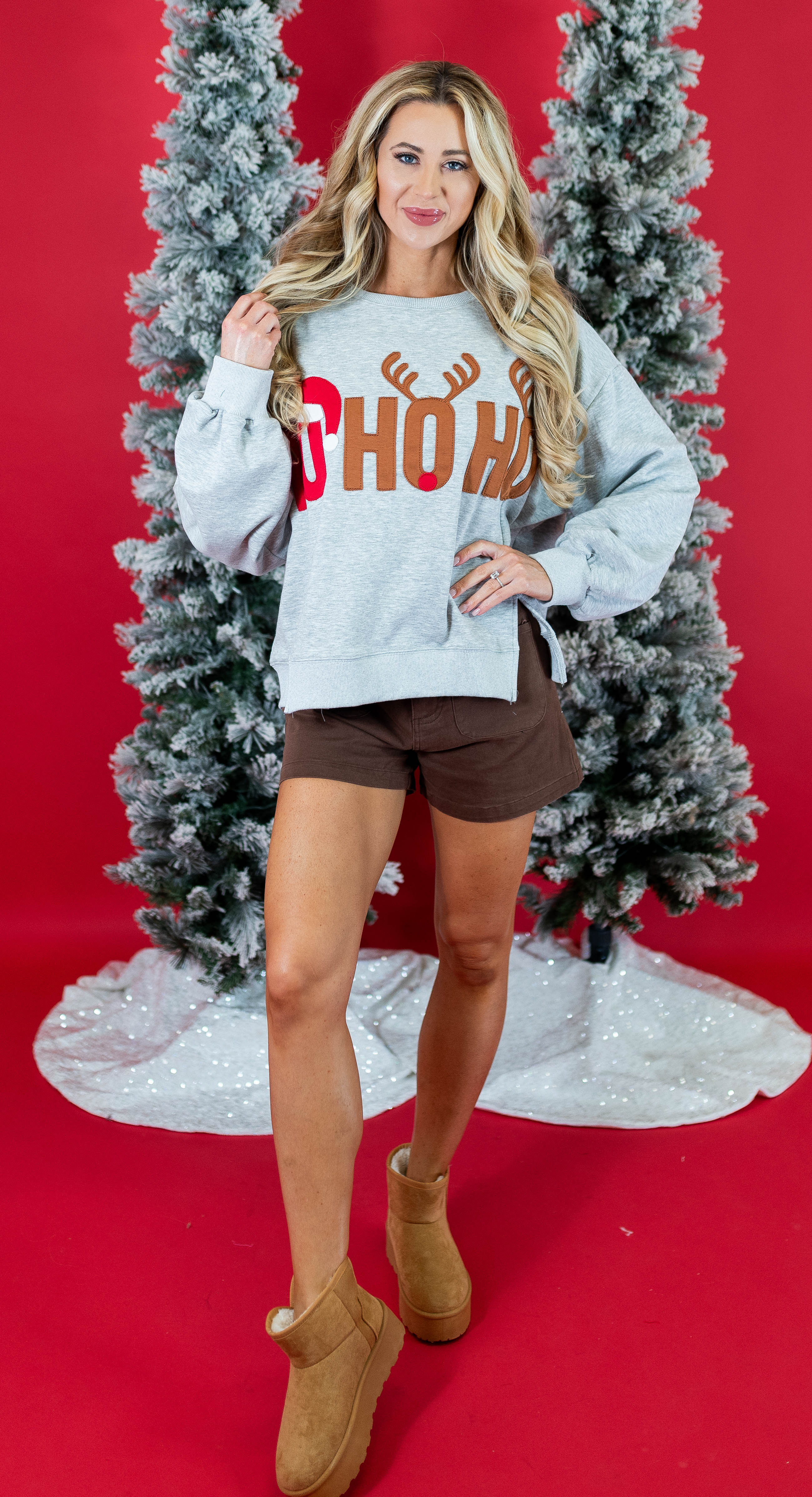 Get into the holiday spirit with our HO HO HO Holiday Sweatshirt! This cozy grey pullover features bold "HO HO HO" lettering with festive Santa hat and reindeer details for a playful seasonal touch. Perfect for Christmas parties, family gatherings, or cozy winter days.
