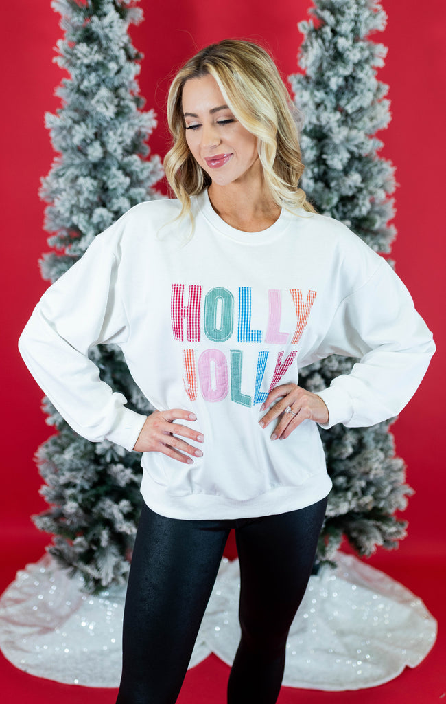 Stay cheerful this season with our Holly Jolly Holiday Sweatshirt! Featuring bold multicolor embroidered lettering on a crisp white base, this cozy pullover brings playful holiday spirit to Christmas parties, family gatherings, and everyday winter outfits. Perfect for seasonal gifting.