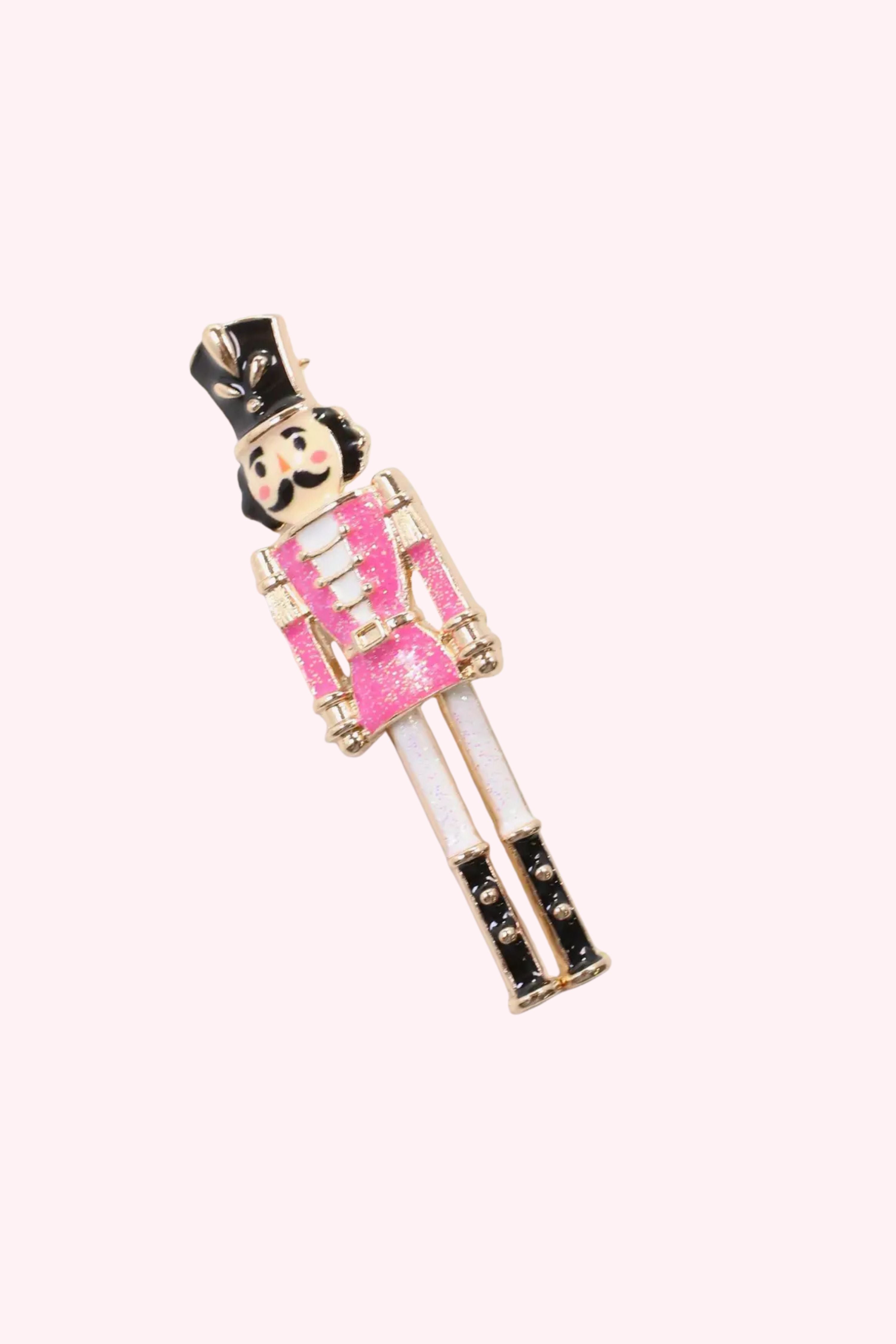 The Naughty or Nice Nutcracker Brooch in Pink combines playful charm with fashionable flair. Featuring vibrant hot pink glittery enamel and dangling legs that add lively movement, this unique pin brings fun and style to your holiday look.