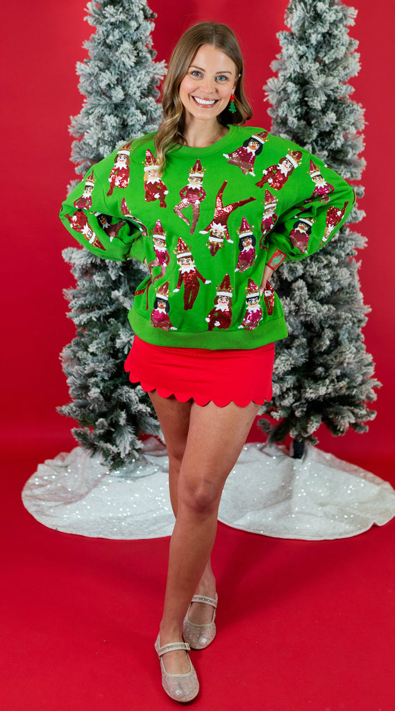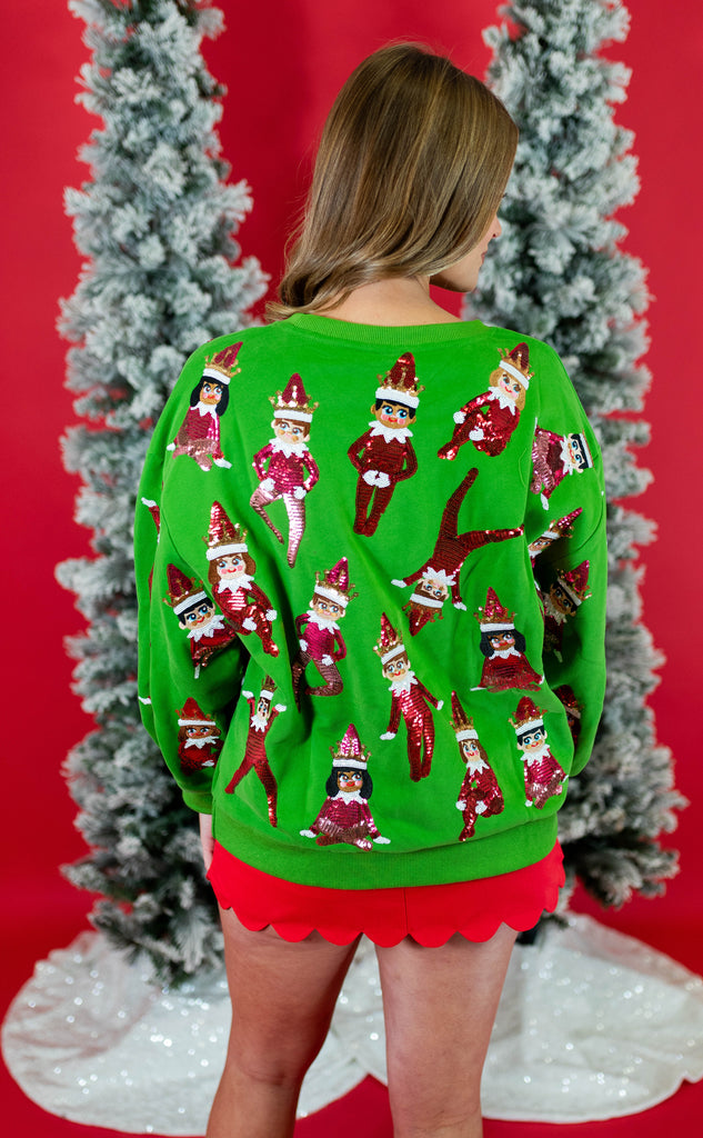 Step up your holiday style with the Queen Of Sparkles: Green Elf Sweatshirt. Embrace the festive spirit in this vibrant green sweatshirt, featuring a playful twist on the classic elf character. Perfect for spreading cheer and joy, this cozy sweatshirt will make you the life of the holiday party!