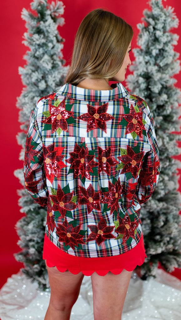Queen Of Sparkles: Plaid Poinsettia Button Up Top