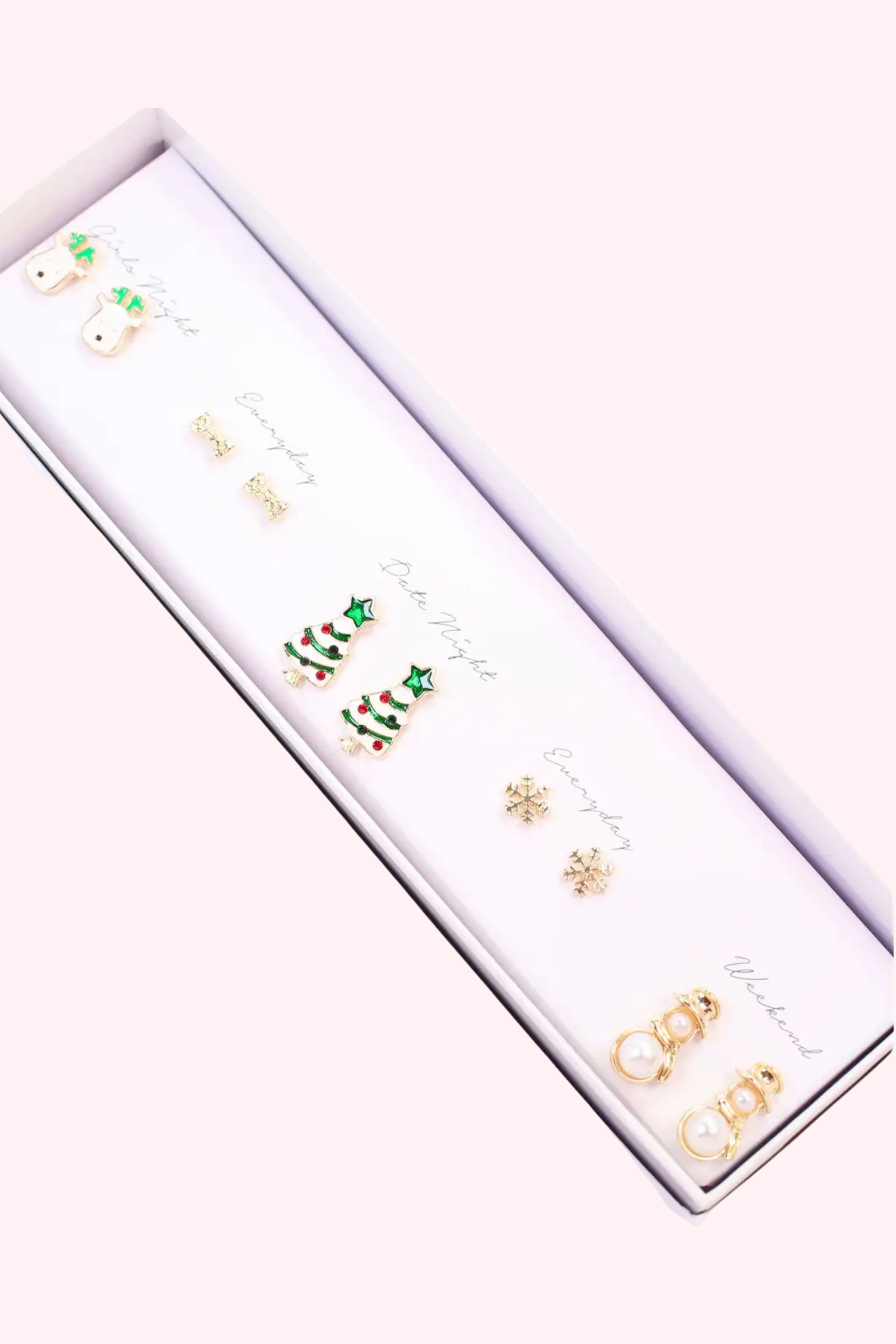 Celebrate the holidays in style with the Rockin Around the Christmas Tree Earring Set in Green. This playful set includes five stud earrings featuring a pearl snowman, gold snowflake and bow, and enamel Christmas tree and reindeer. Perfect for gifting or adding festive charm to any look.