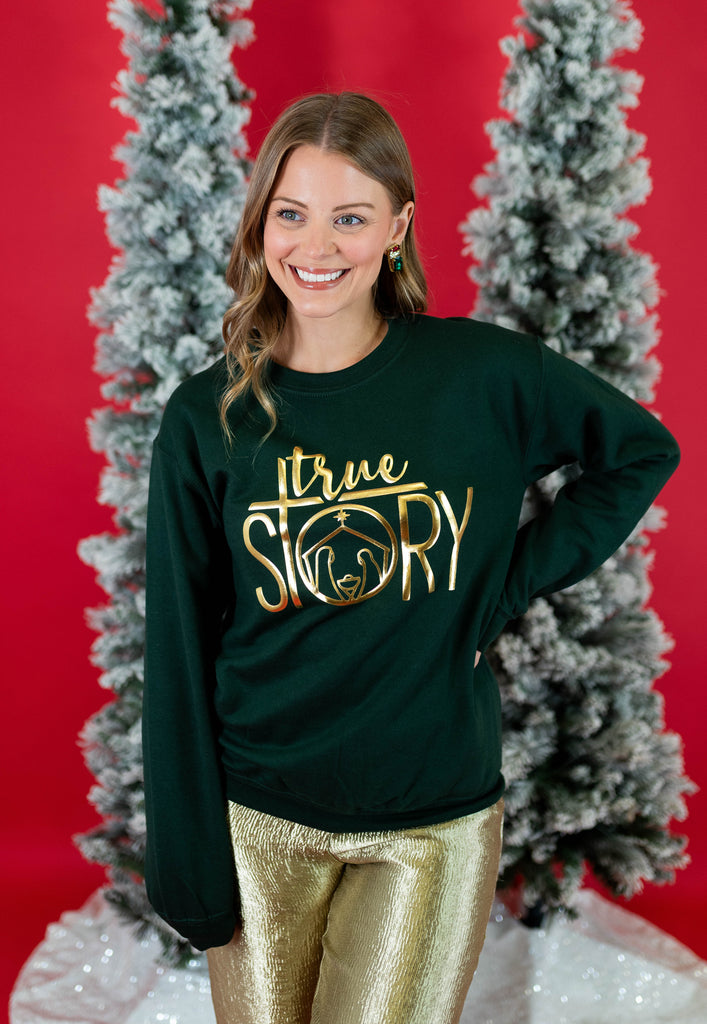 Celebrate the true meaning of the season with the True Story Christmas Sweatshirt in Forest Green. Featuring a classic nativity scene, this cozy sweatshirt combines comfort with heartfelt holiday spirit. Its rich green shade adds festive warmth to your wardrobe while reminding everyone of the timeless story behind Christmas. Perfect for gatherings or casual wear, it’s a meaningful way to share joy and tradition throughout the holidays.