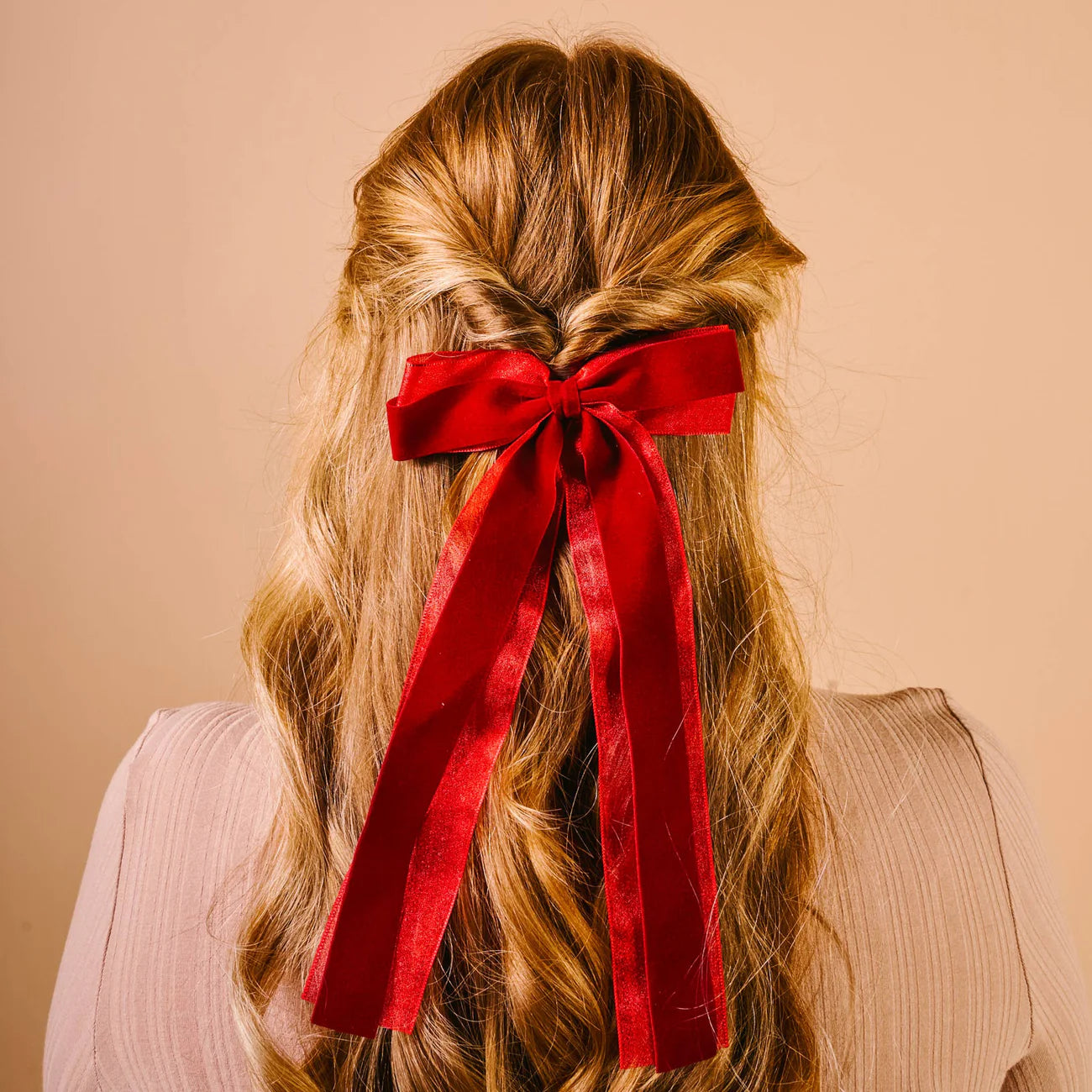 Elevate your everyday with the Velvet Luxe Layered Hair Bow—a modern take on timeless elegance. Designed with rich velvet ribbon and a delicate sheer underlay, this layered bow brings a polished finish to any hairstyle. Its sleek silhouette and luxe textures make it perfect for special occasions or everyday glam, while the gold barrette clip ensures a secure, comfortable hold.