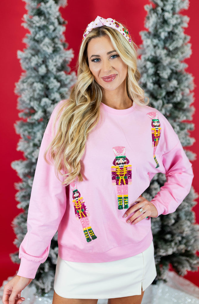 Sequin Nutcracker Embroidery Christmas Pullover - Light Pink