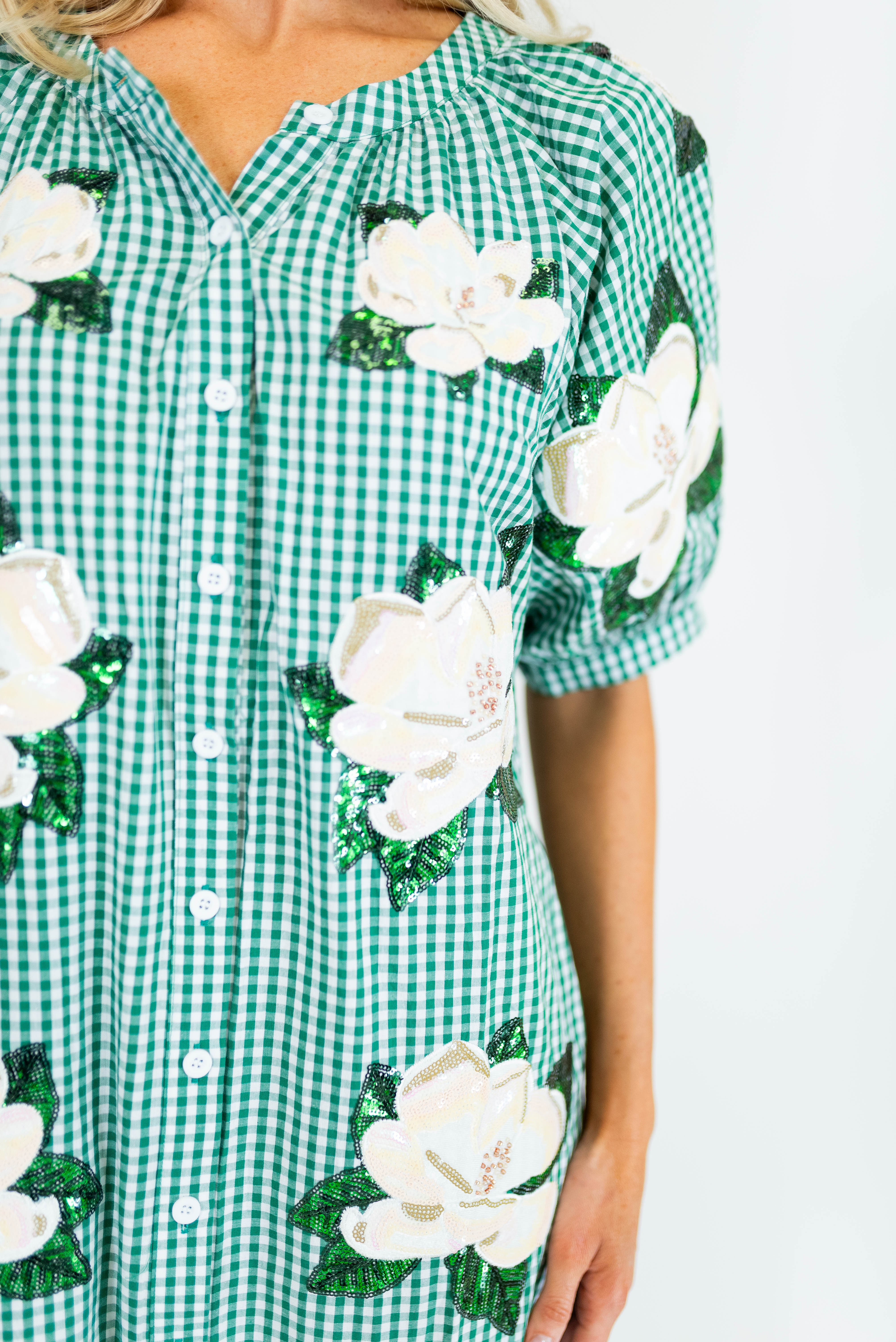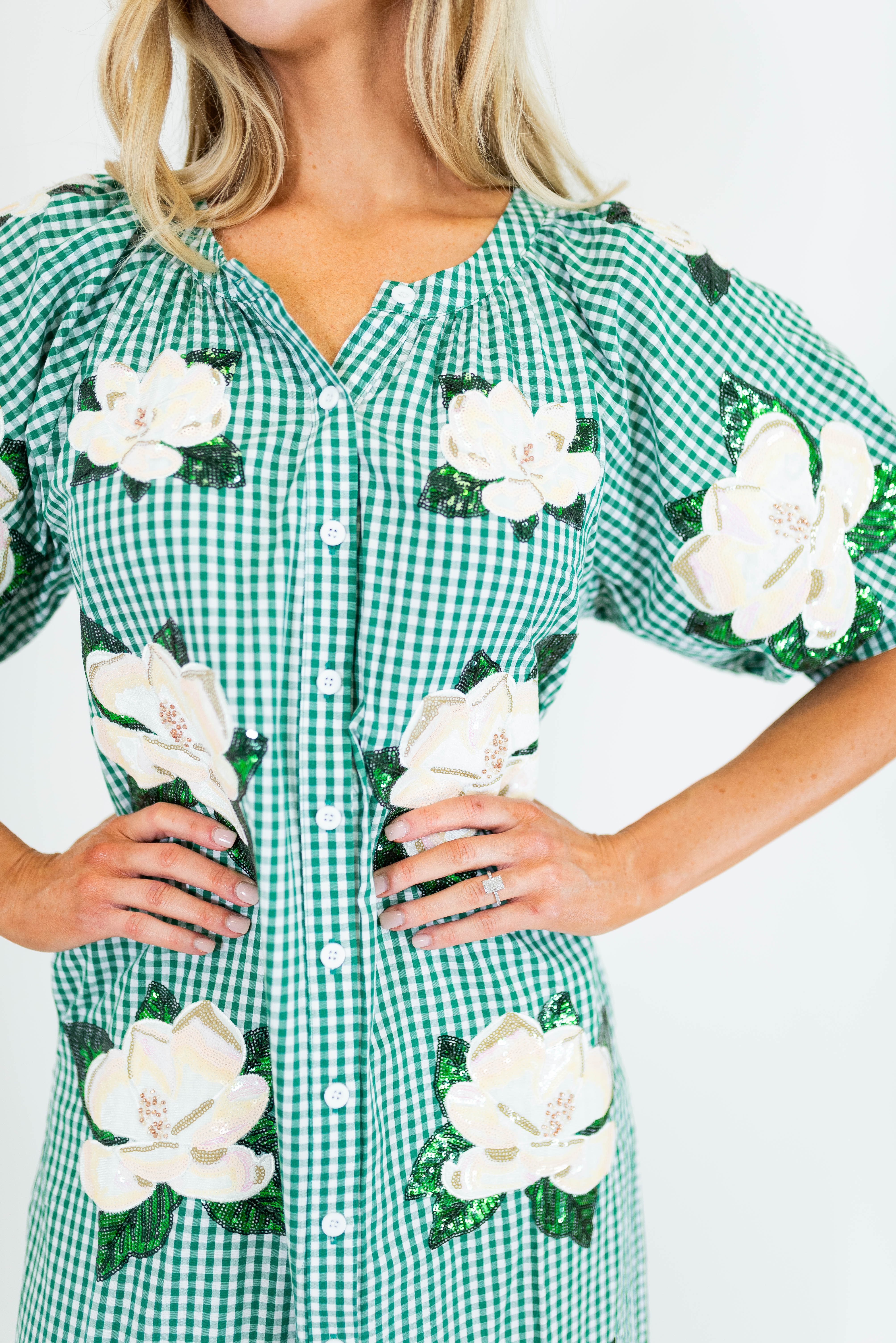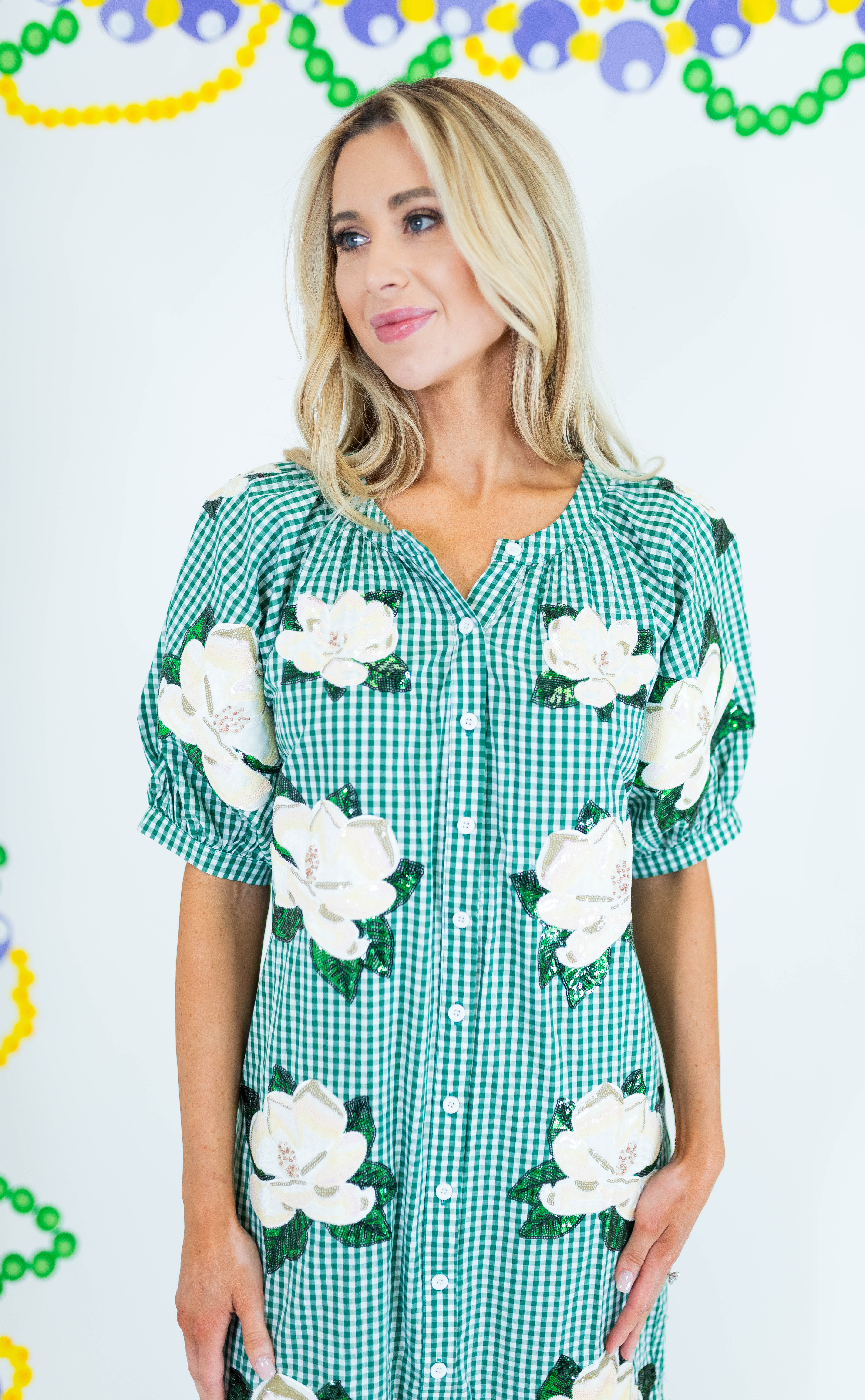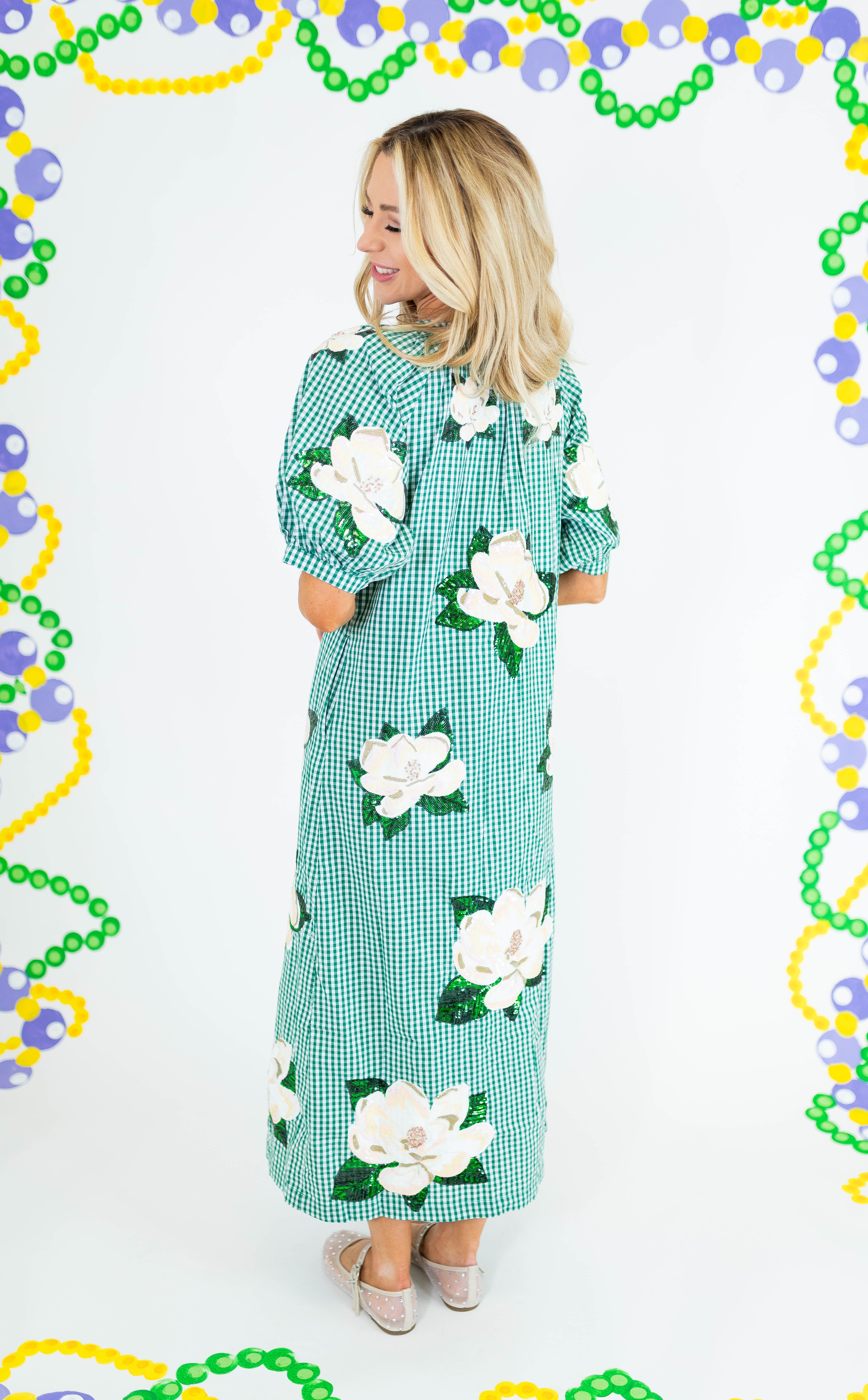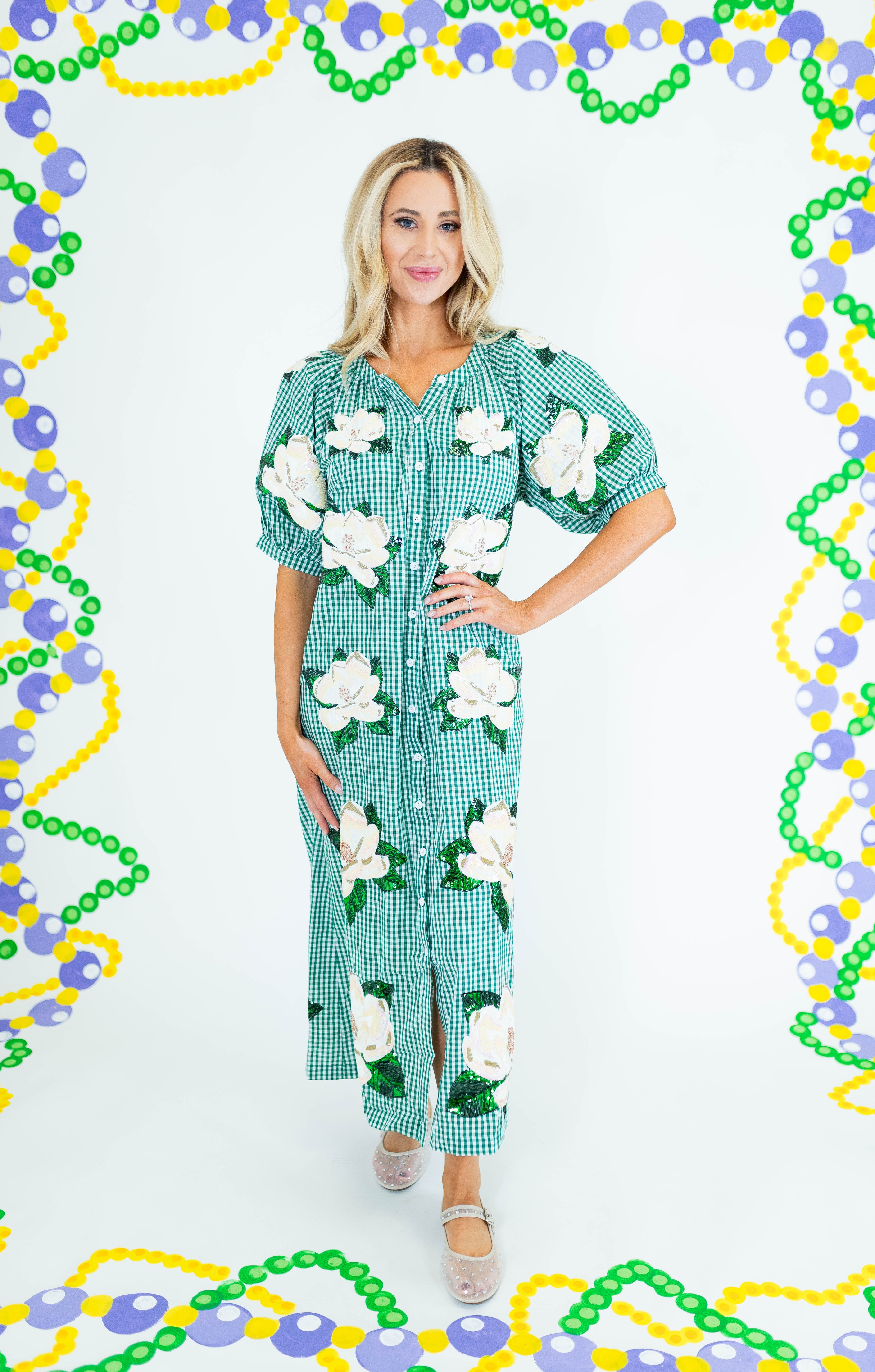 Elevate your Mardi Gras wardrobe with this stunning Queen Of Sparkles green and white gingham Magnolia midi dress. The classic gingham pattern pairs beautifully with delicate magnolia detailing, creating a refined yet festive look perfect for the season's celebrations. The midi length offers elegant sophistication while maintaining the playful spirit of the occasion. Ideal for parades, parties, and special events where you want to stand out with timeless style and understated glamour.