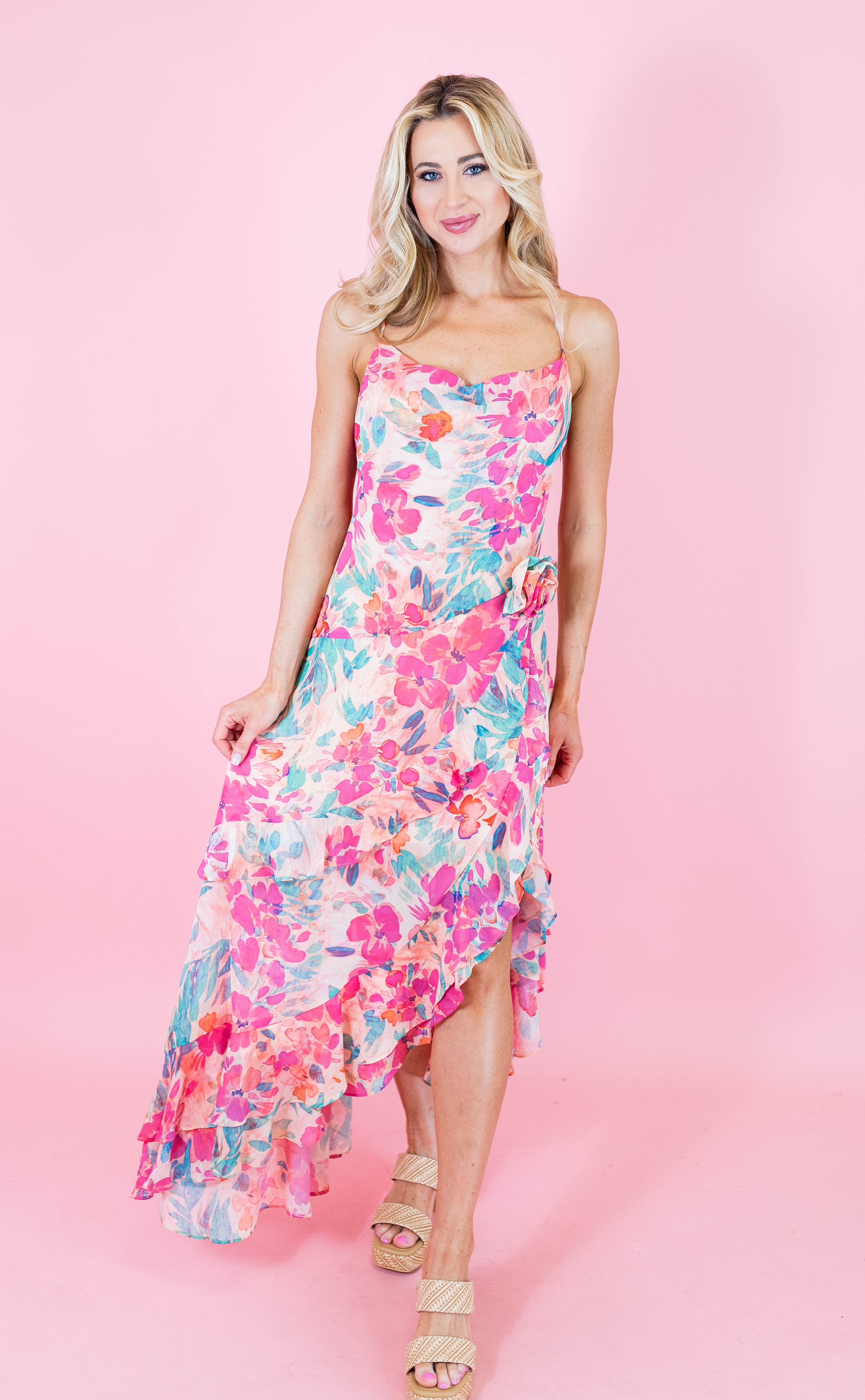 Elevate your warm-weather wardrobe with the Steve Madden Sadie Dress in Tropical Breeze. This stunning piece features adjustable tie-back straps and a graceful draped neckline that flatters every frame. The asymmetrical hem with delicate ruffle detail and side rosette accent create movement and visual interest, while the convenient side zipper ensures easy dressing. Crafted from 100% polyester with strategic half-lining for comfort and coverage, this dress transitions effortlessly from day to night.