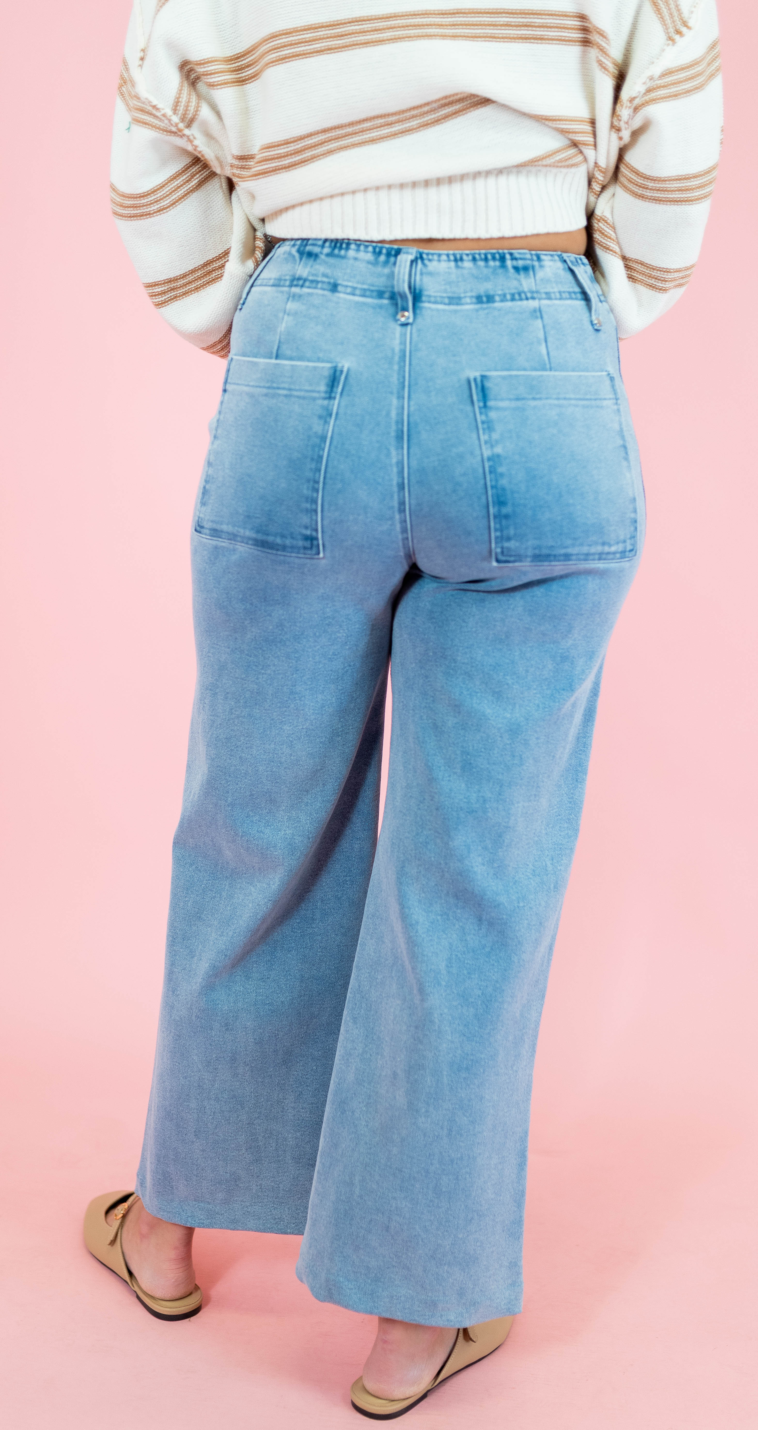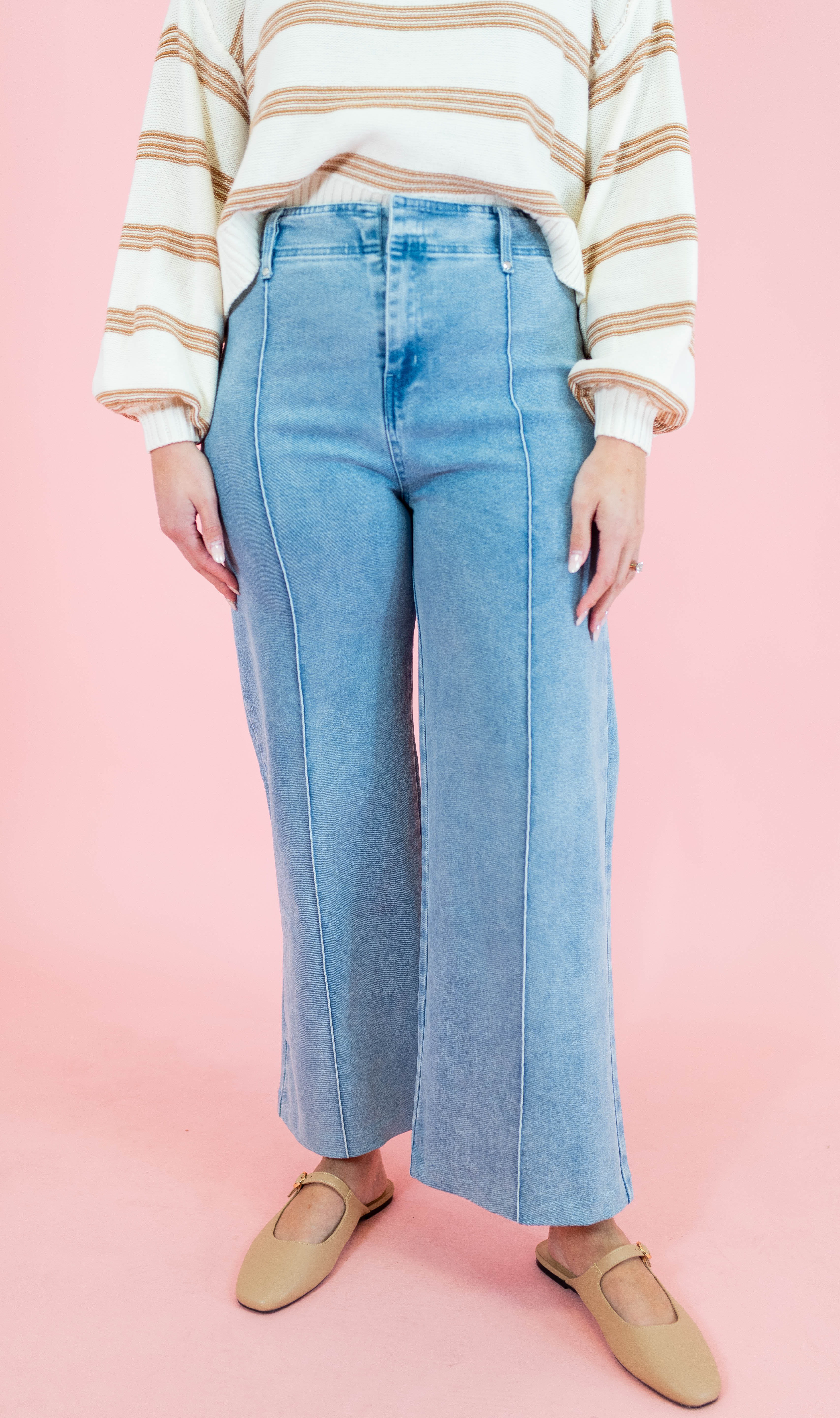 Elevate your everyday style with these Front Seam High Rise Wide Leg Pants—the perfect blend of comfort and contemporary flair. Designed with a flattering high rise and flowing wide legs, they create a sleek silhouette that works for any occasion. The distinctive front seam detail adds visual interest and dimension to your look. Available in breezy light blue, denim, spring pink and soft seafoam, these pants are your new go-to for effortless, chic dressing. Pair them with your favorite top and watch heads turn!