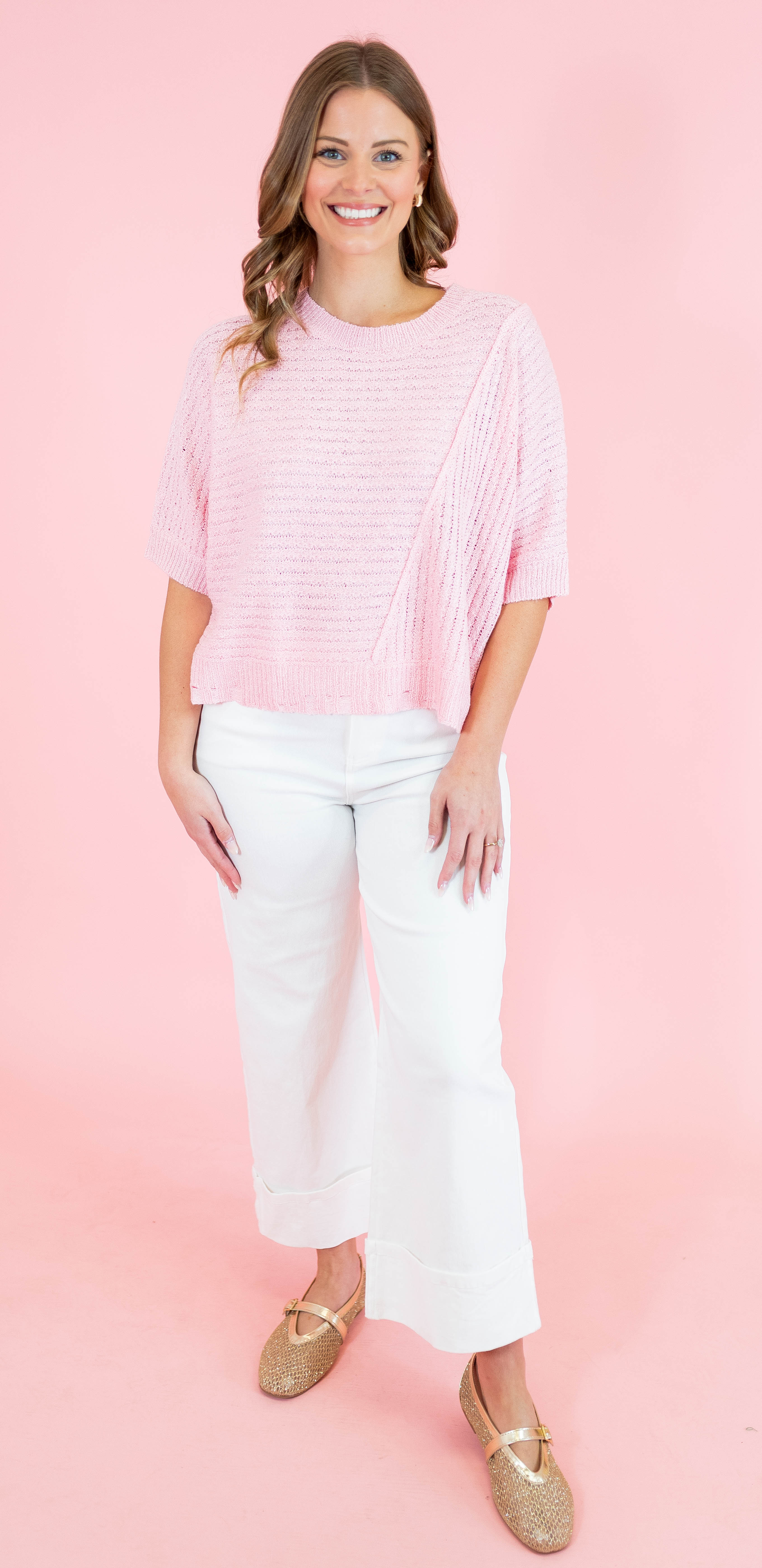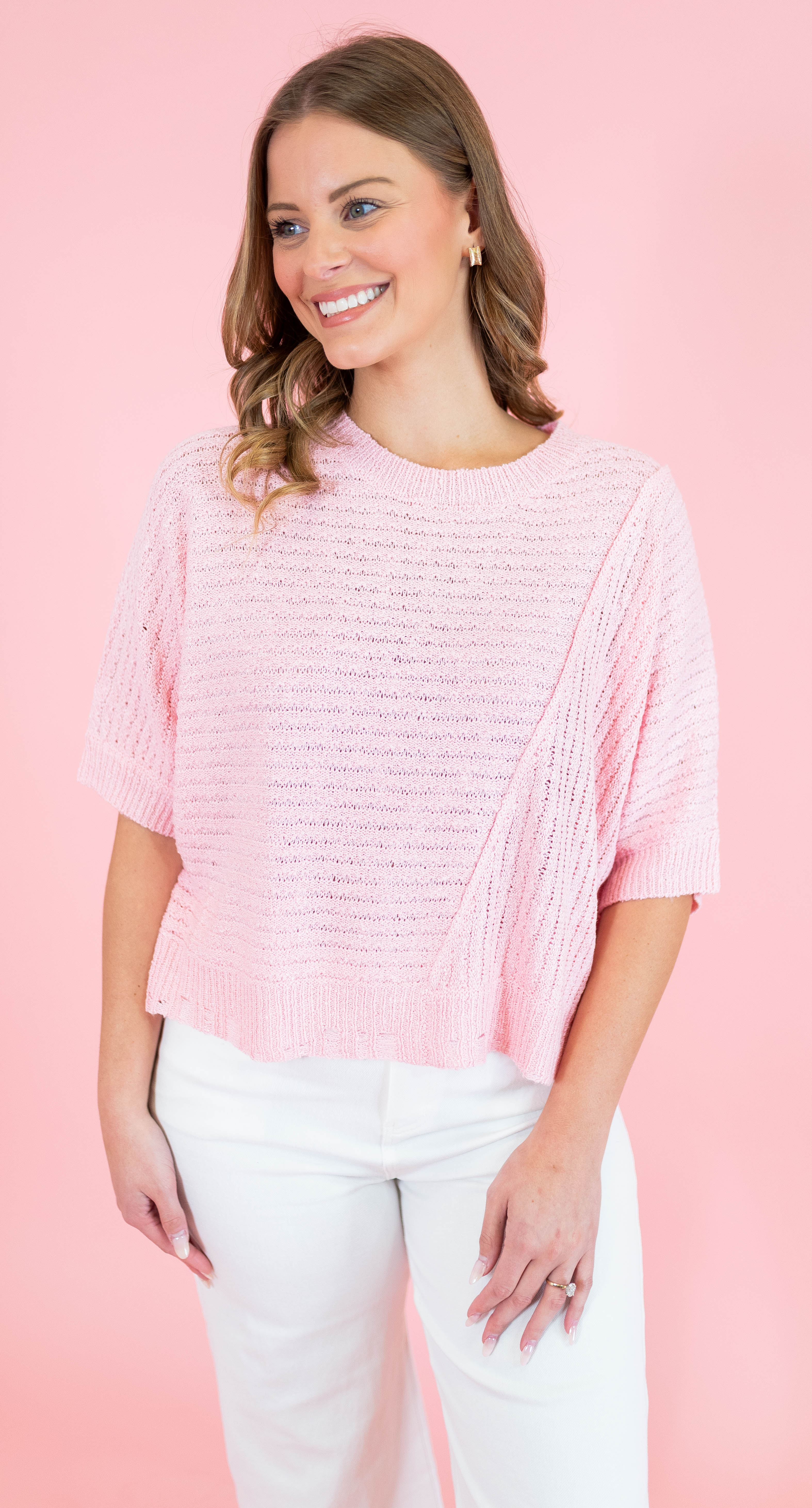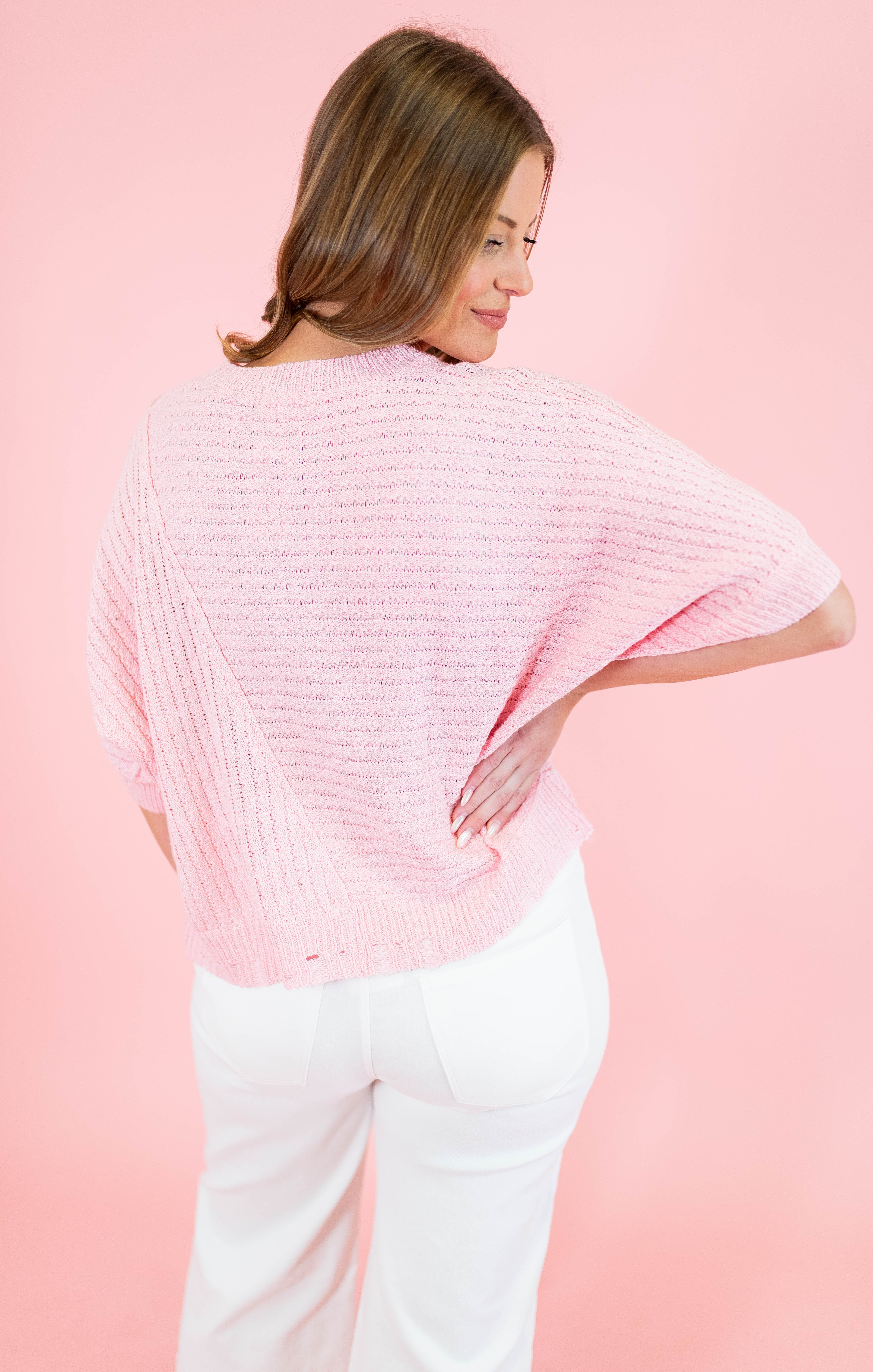 Cozy up in this light pink ribbed sweater top that's got all the right moves. The distressed hem adds an effortlessly cool edge to your everyday look, while the ribbed knit keeps things snug and comfortable. Perfect for layering over your favorite tee or styling solo with high-waisted jeans. This piece is your new go-to for casual vibes with just a hint of attitude.