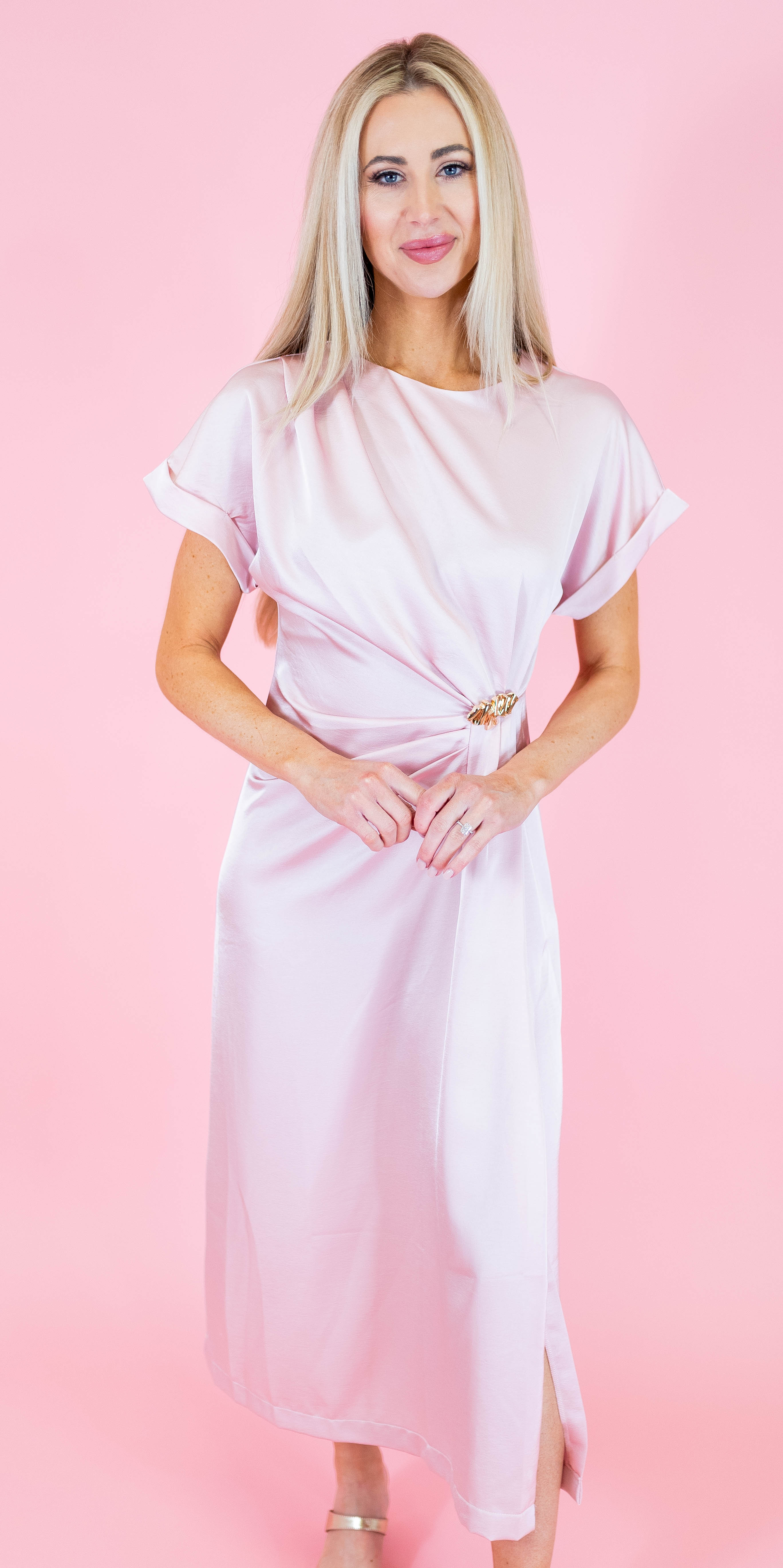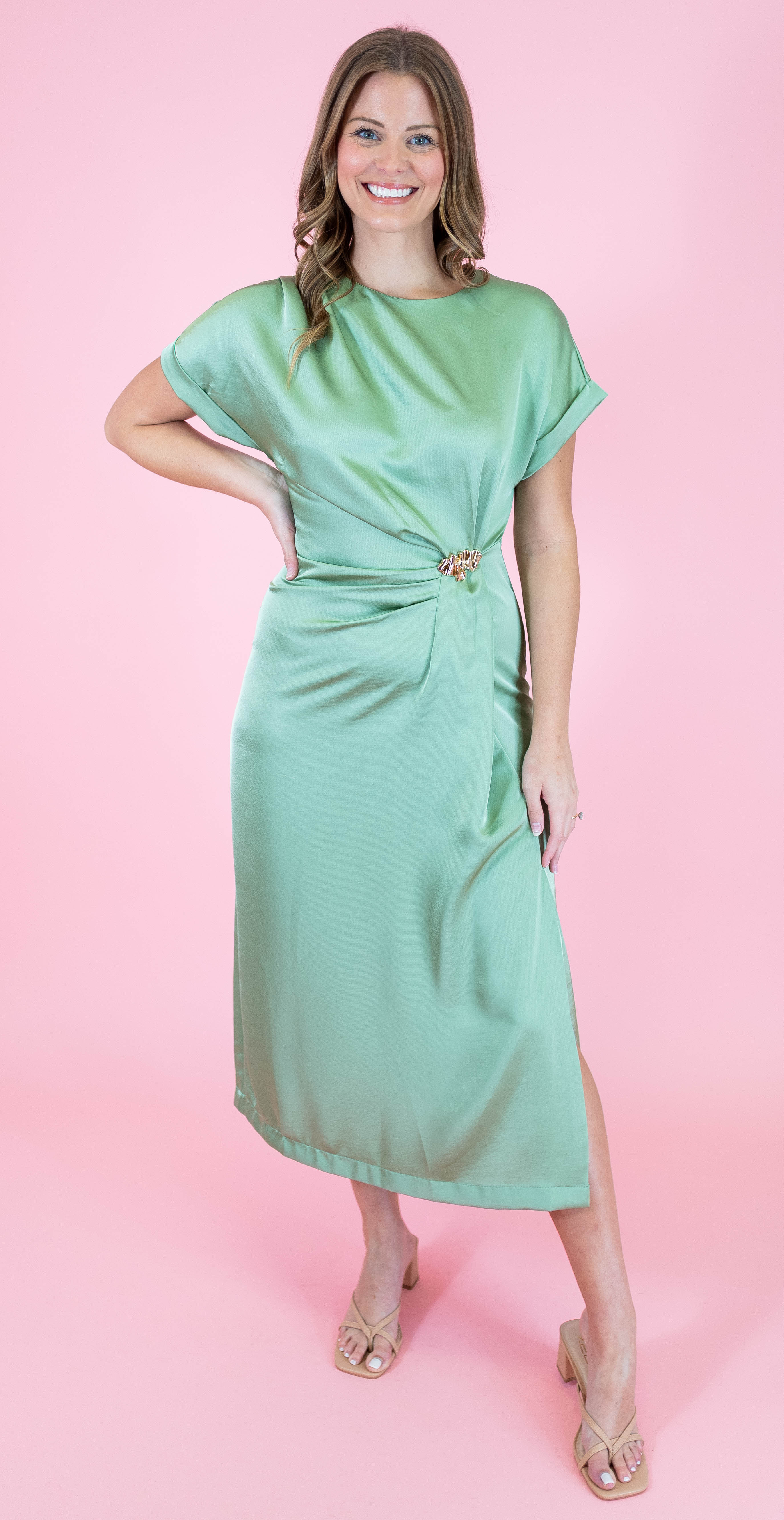 Effortless elegance meets fun with this gathered midi dress, featuring delicate metal trim detailing that catches the light just right. The relaxed short sleeves keep things breezy and comfortable, while the midi length offers a sophisticated silhouette perfect for everything from brunch dates to evening outings. Available in soft pink and calming sage, this versatile piece transitions seamlessly through seasons and occasions. Slip it on and let the gathered fabric do the talking.