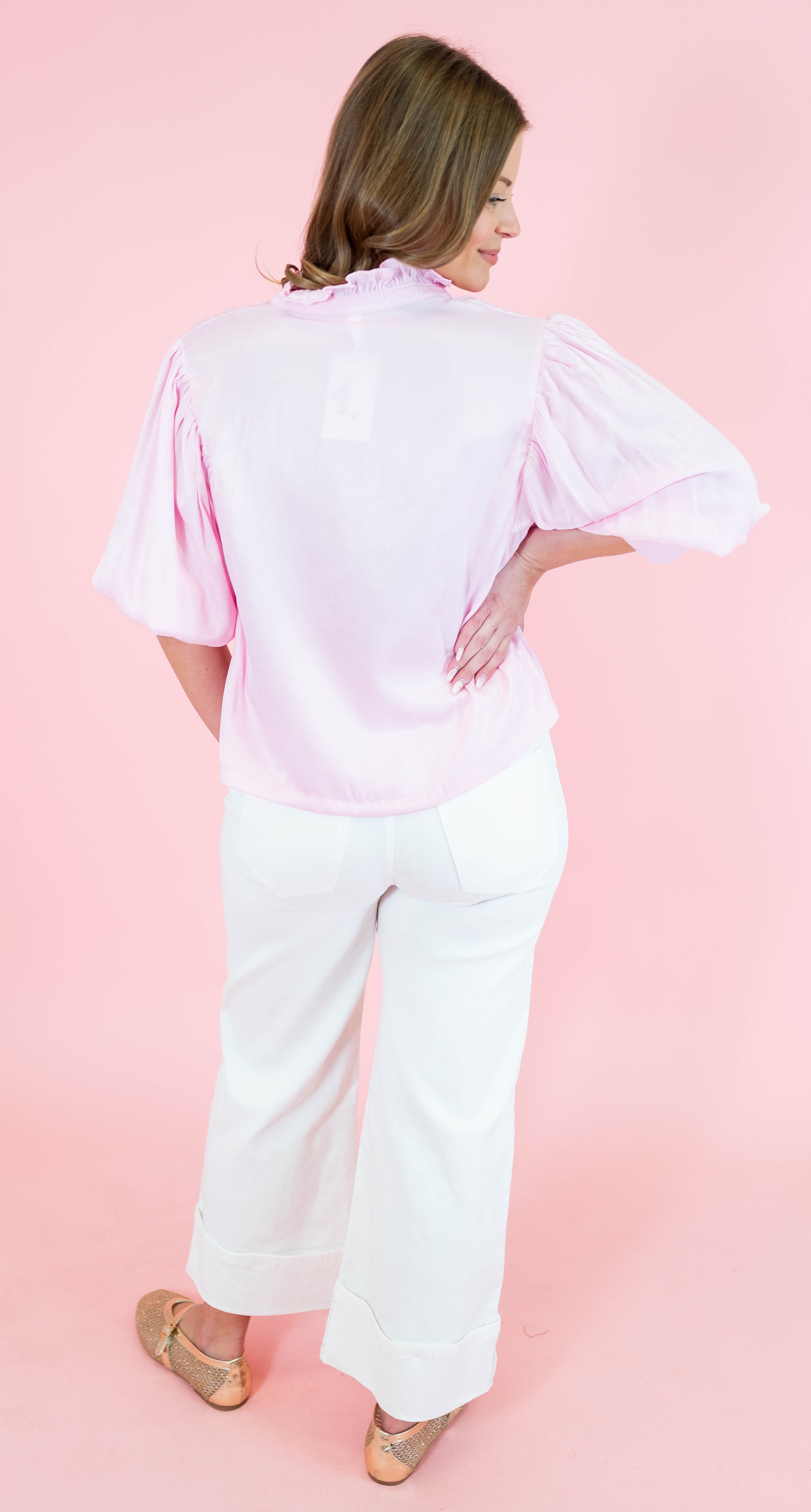 Elevate your everyday style with this charming ruffle neck puff sleeve blouse in soft pink. The delicate ruffled neckline adds a touch of romantic flair, while voluminous puff sleeves create an effortlessly chic silhouette. Perfect for dressing up casual outfits or adding personality to your work wardrobe, this blouse pairs beautifully with jeans, skirts, or tailored trousers. A playful piece that brings instant sophistication and fun to any occasion.