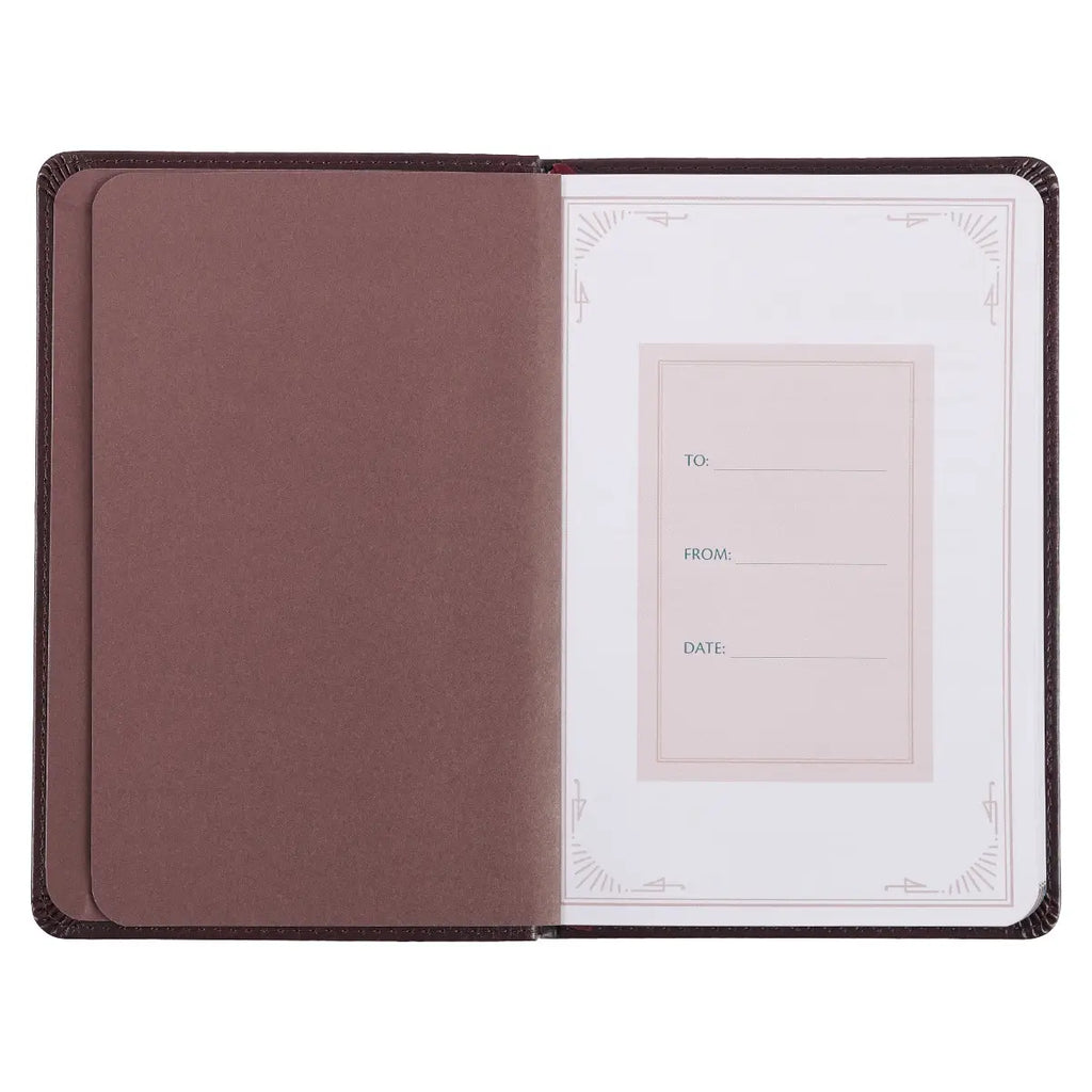 The brown faux leather cover features the title and supporting Scripture verse in simple gold-foiled letters.