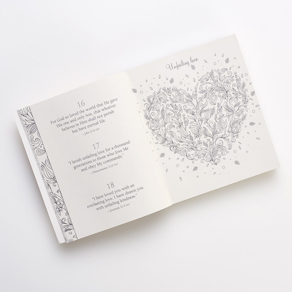 At the front of the coloring book, you'll find a presentation page adorned with delicate, gossamer-winged butterflies that can be personalized when given as a gift. With each cream-colored page turn, you'll be greeted with three reassuring promises from Scripture and a beautiful ink line drawing that can be filled with color. The promises from Scripture will fill your heart and inspire you, while the stunning artwork will thoroughly draw you in.