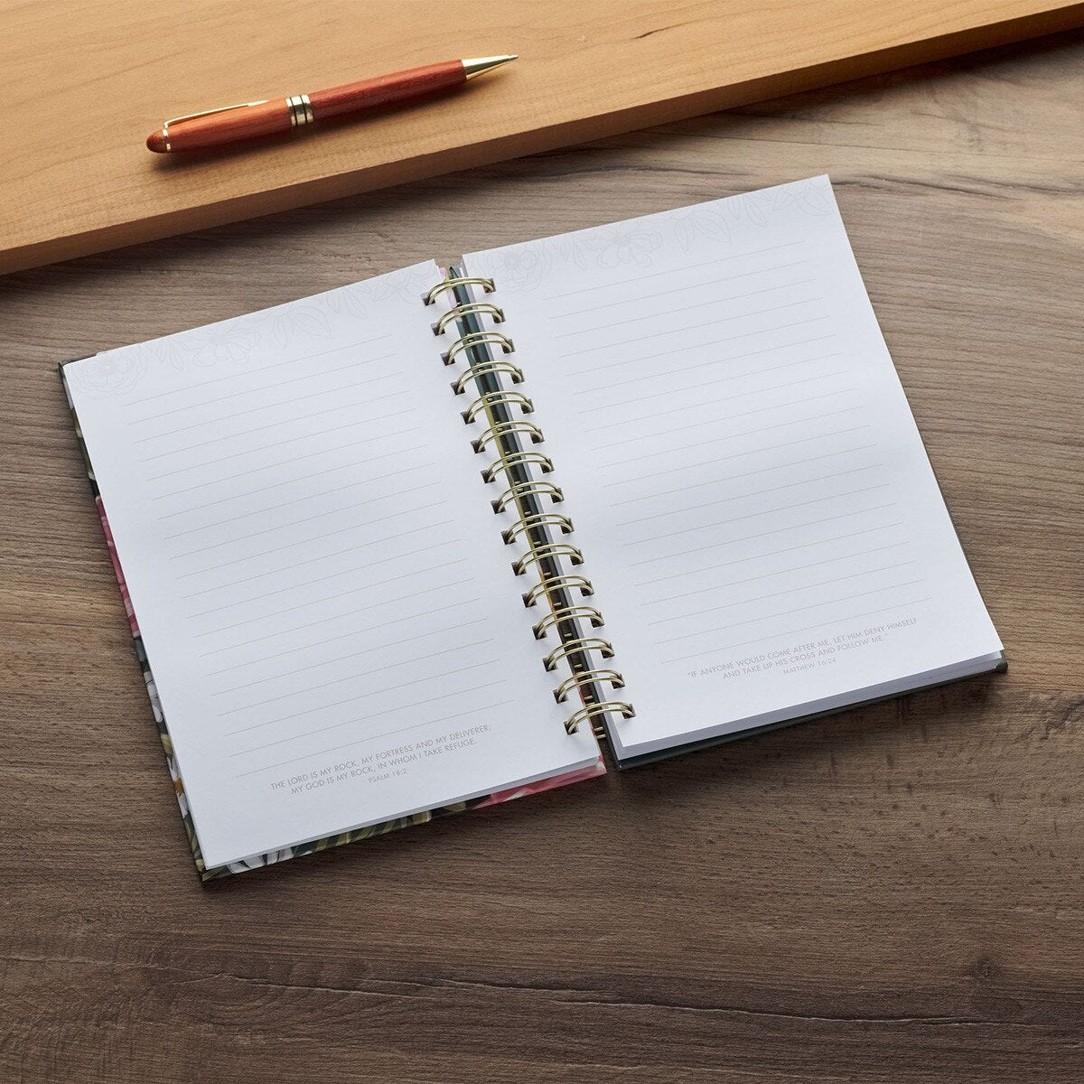 The teal back cover features a gorgeous flower arrangement that is comprised of the individual flowers on the front cover. The spiral journal has a hard cover that doubles as a sturdy writing surface. Its gold-toned wire binding makes it easy to turn each of the 192 lined pages. Each page has an additional Scripture verse printed at the bottom and a watermarked teal floral banner at the top. It features a presentation page that is ideal for adding a personal message or marking a special occasion.