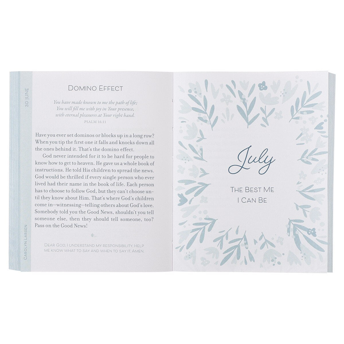 The entries for each month are organized around a theme. Each daily entry includes a Scripture verse combined with a child-oriented, real-life situational devotional passage and a simple prayer.