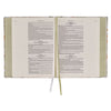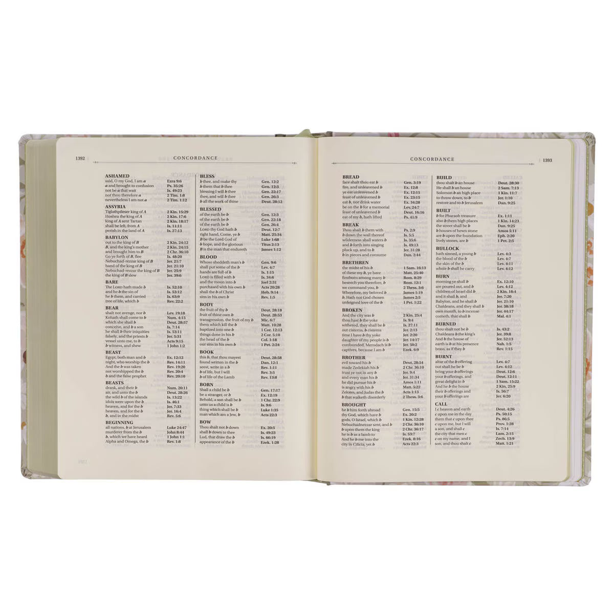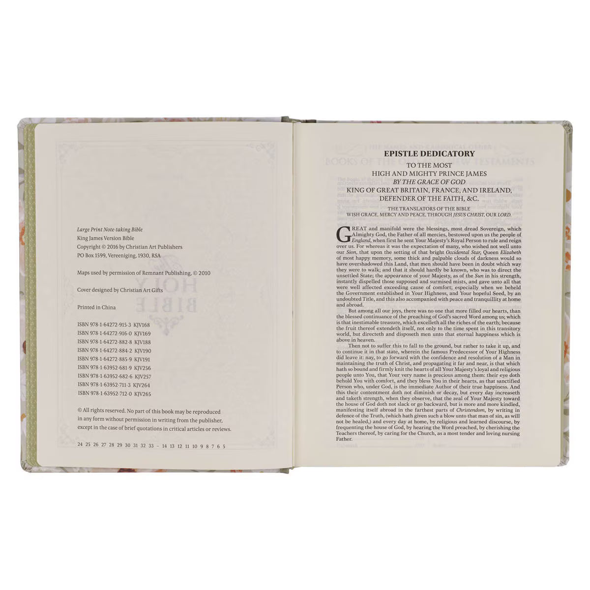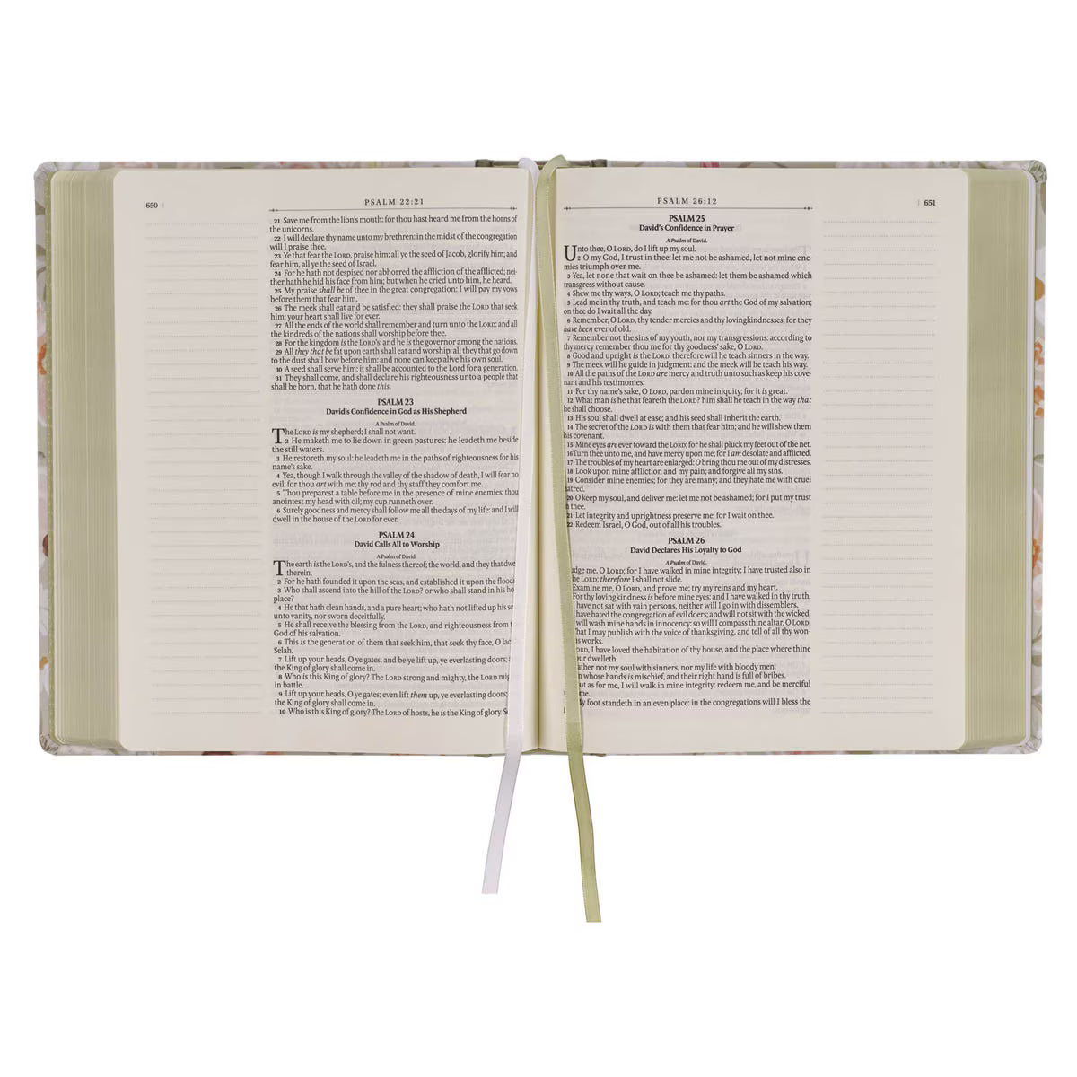 Enhance your understanding of the biblical text by noting your insights in the margins of the Sage Green Floral Hardcover Amelia Collection Large Print King James Version Note-taking Bible. This gorgeous Bible with easy-to-read text and lined margins is a beautiful and functional way to study the Bible by adding notes, cross-references, and connections between passages.