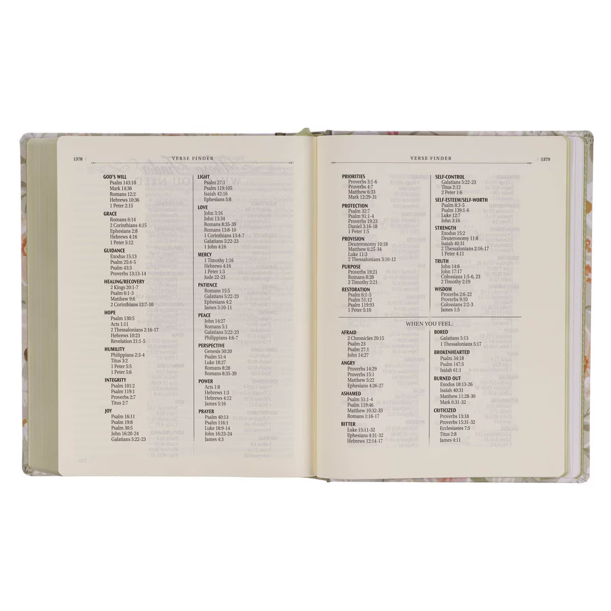 The covers of the KJV note-taking Bible are wrapped in linen decorated with soft pastel floral motifs in a harmonious blend of sage greens, soft pinks, rich creams, and bright oranges. The sentiment is printed in white letters in a handwritten font.
