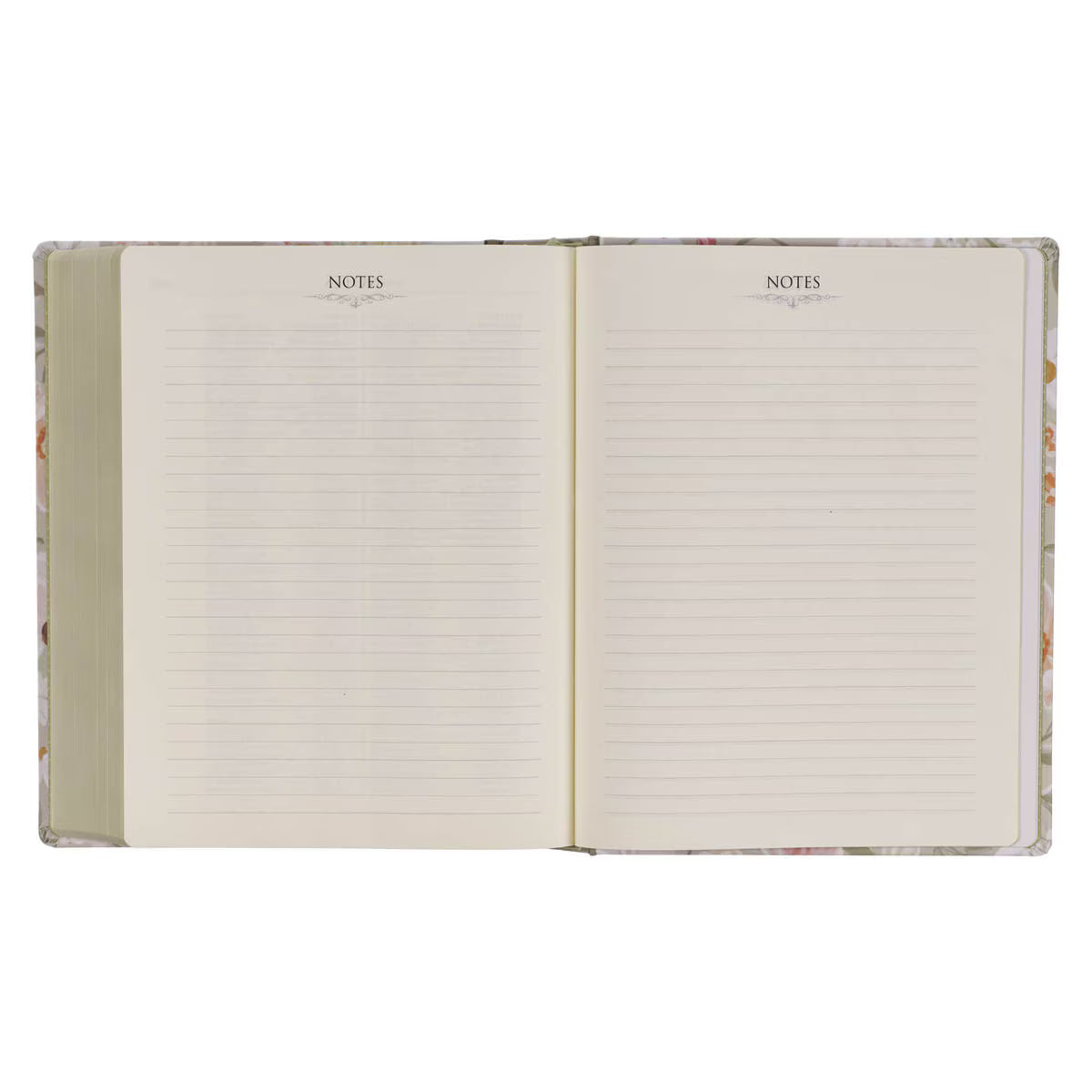 The sentiment of the Sage Green Floral Hardcover Amelia Collection Large Print King James Version Note-taking Bible reflects a heart of submission and trust in God's perfect will. This sentiment, paired with the Bible's larger print, makes it the ideal gift for your mom or aunt who has surrendered her life to Christ. Wrap the Sage Green Floral Hardcover Amelia Collection Large Print King James Version Note-taking Bible as a Christmas or birthday gift for your beloved mom or aunt.