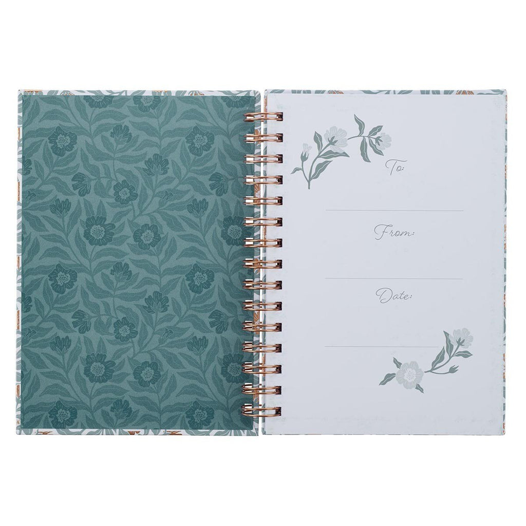 Each page is lined in teal and features a Scripture verse. An added teal floral decorative design is placed in the outer top corners of each page spread. The front of the spiral-bound journal holds a presentation page that can be personalized or inscribed with a heartfelt message when it is given as a gift.