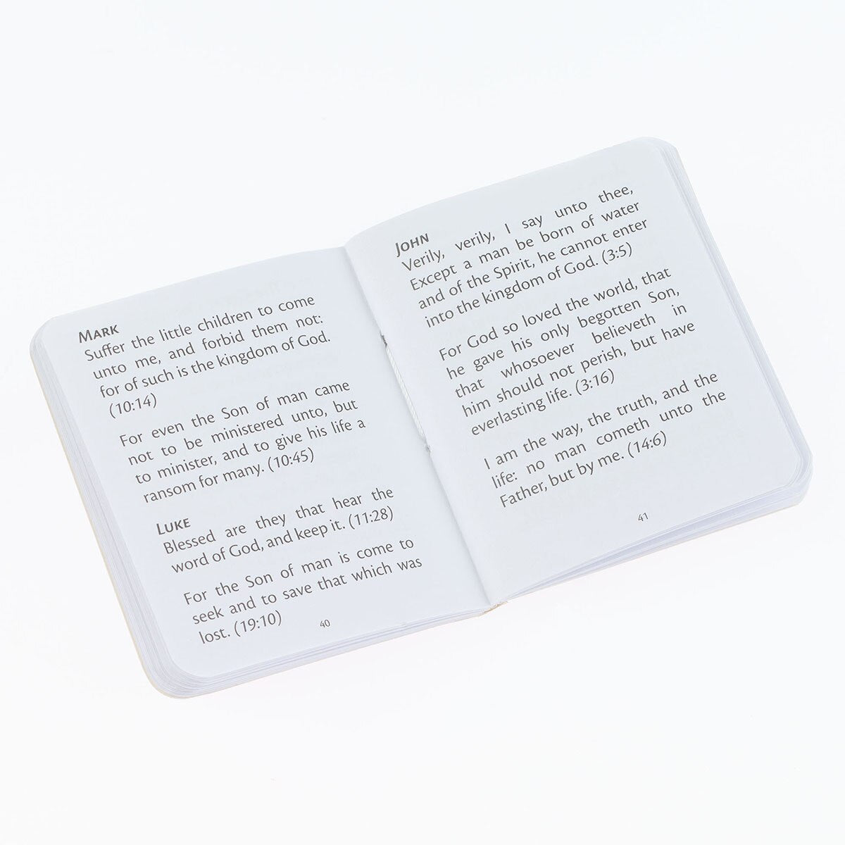 The White My Little Bible is a tiny booklet filled with the most important verses from each book of the KJV Bible, and it will be an endearing gift for a baptism or first communion.