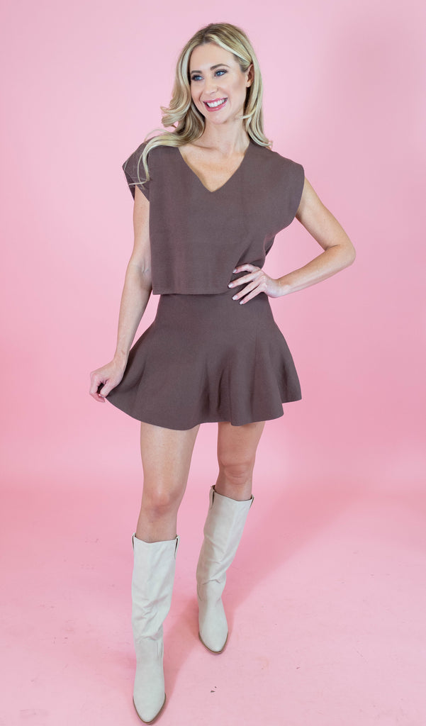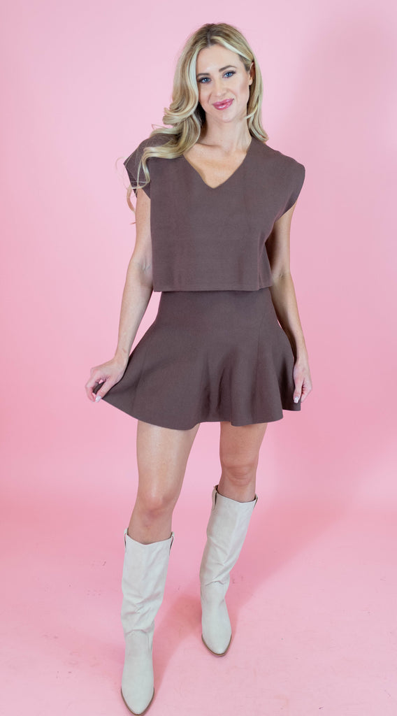 Sleeveless V-Neck Sweater & Flared Mini Skirt - Brown
