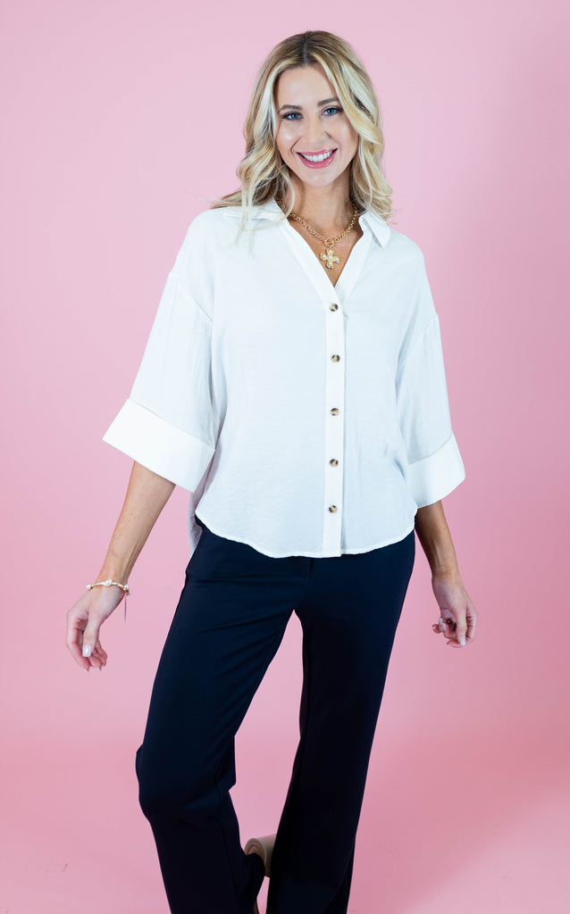 Polished and effortlessly chic, this ¾ Sleeve Wide Cuff Button-Up Top in rich hunter green, garnet red and classic off white is a versatile staple for any wardrobe. Crafted from a lightweight woven fabric, it features a classic spread collar, wide cuff sleeves, and a clean button-front closure for a tailored look. Unlined and non-sheer, it’s perfect for layering or wearing on its own—ideal for the office, dinner, or everyday sophistication.