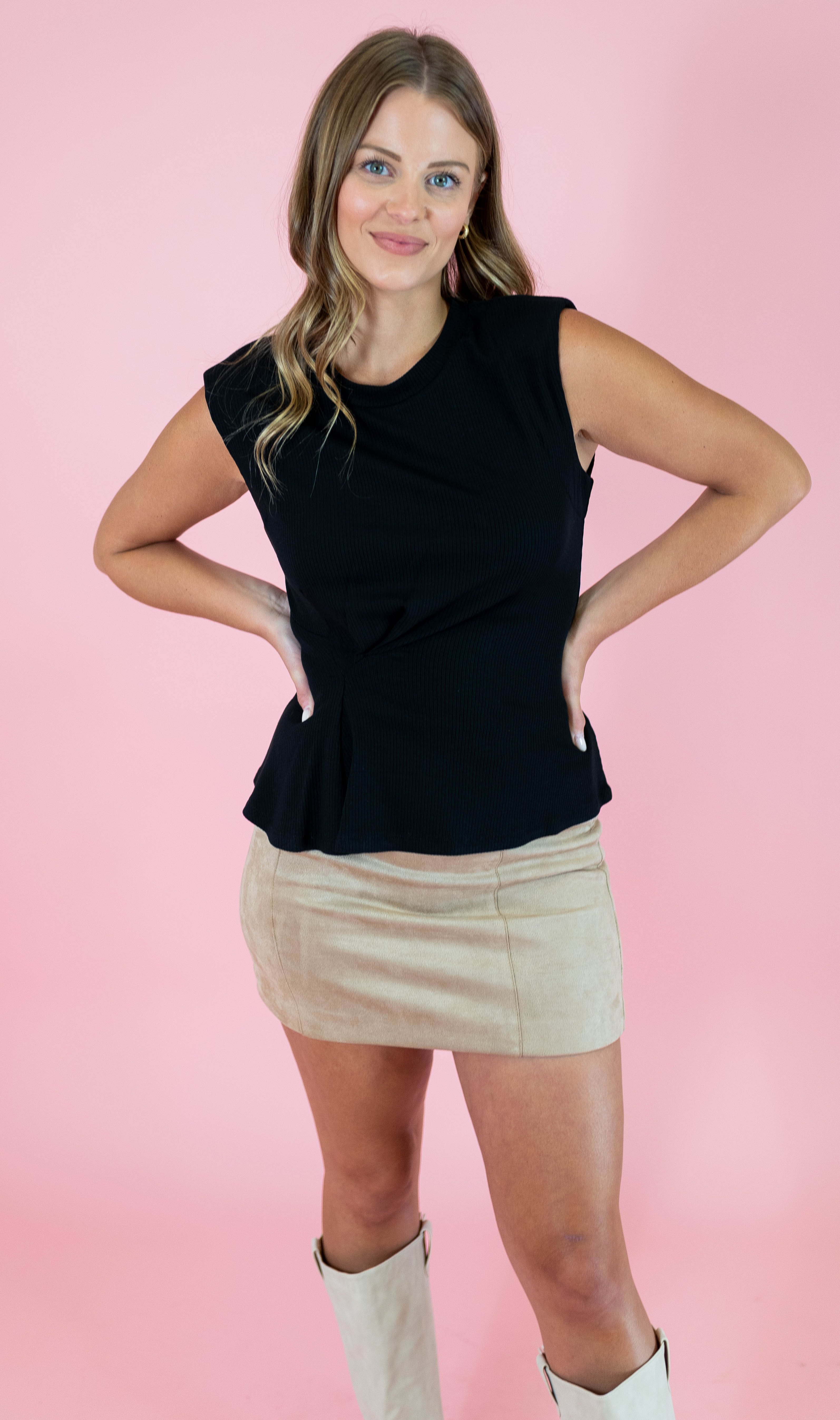 Shoulder Padded Rib Asymmetrical Pleat Top