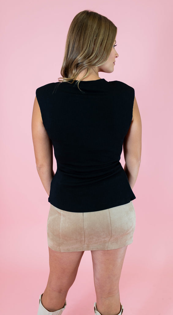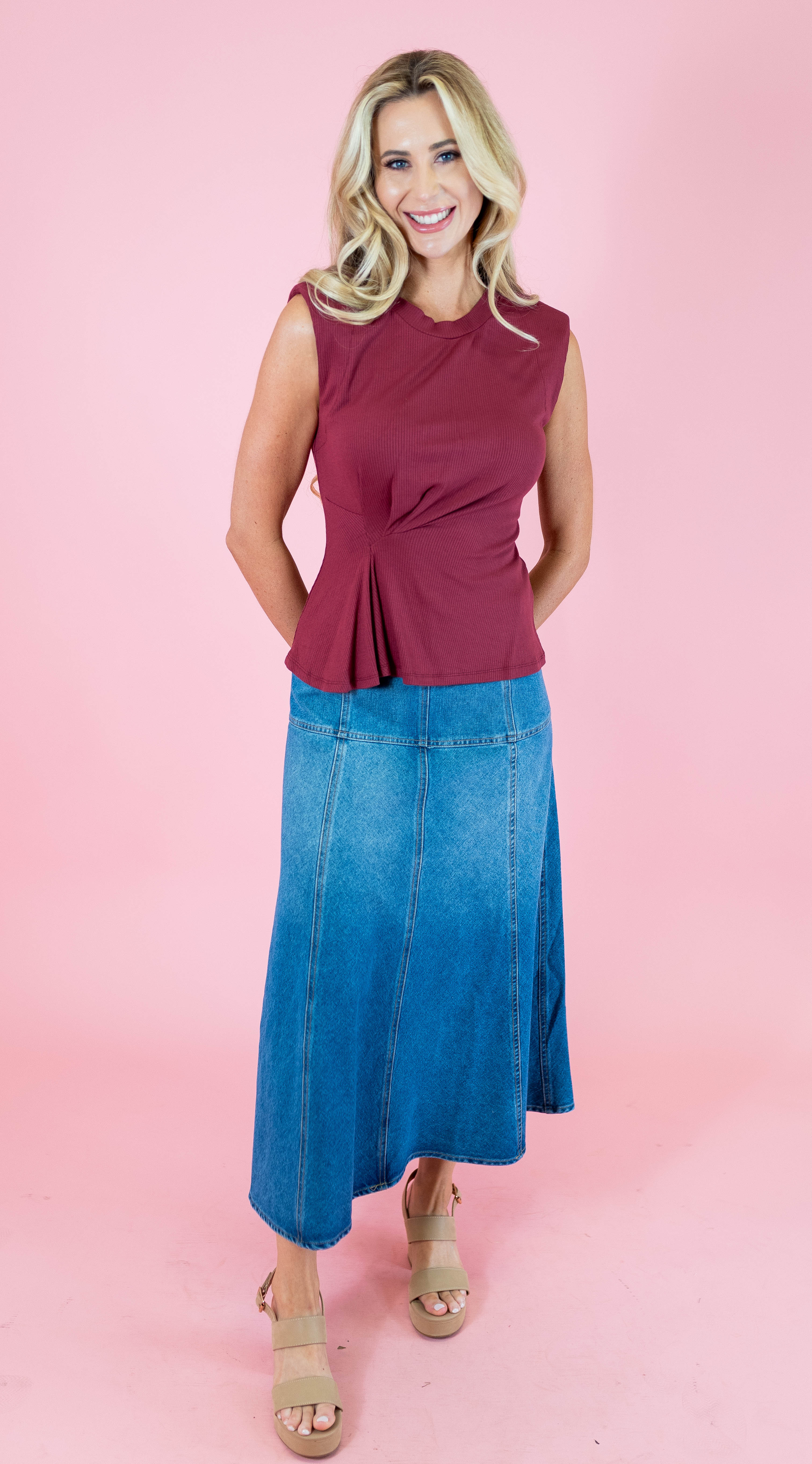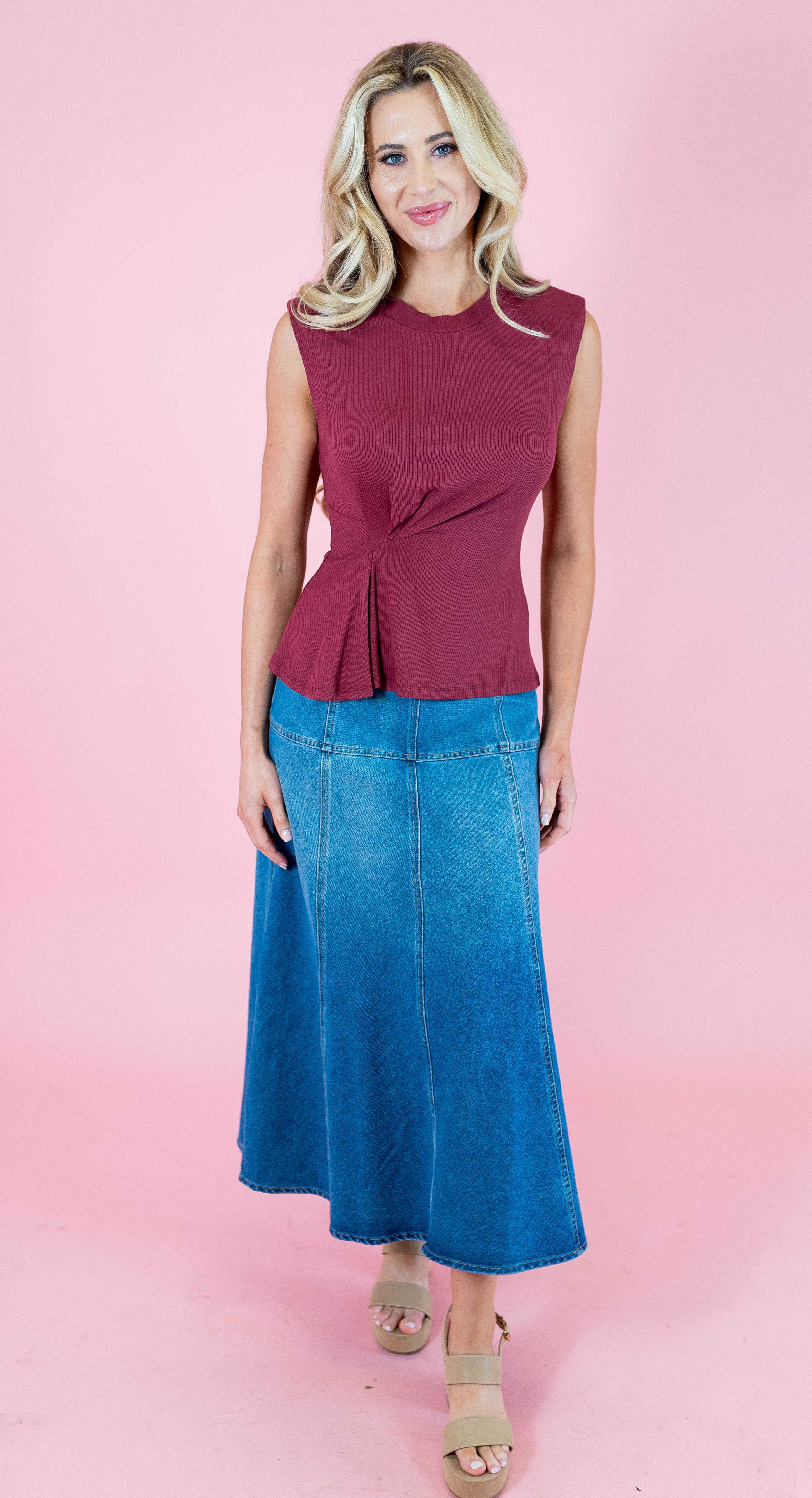 Sleek and modern, the Shoulder Padded Rib Asymmetrical Pleat Top adds an elevated edge to your wardrobe. Designed in a soft ribbed knit with just the right amount of stretch, this sleeveless top features structured shoulder pads, and gathered side pleating for a flattering fit. Available in merlot and black, it’s the perfect piece to dress up denim or style with skirts and trousers for a chic night-out look.
