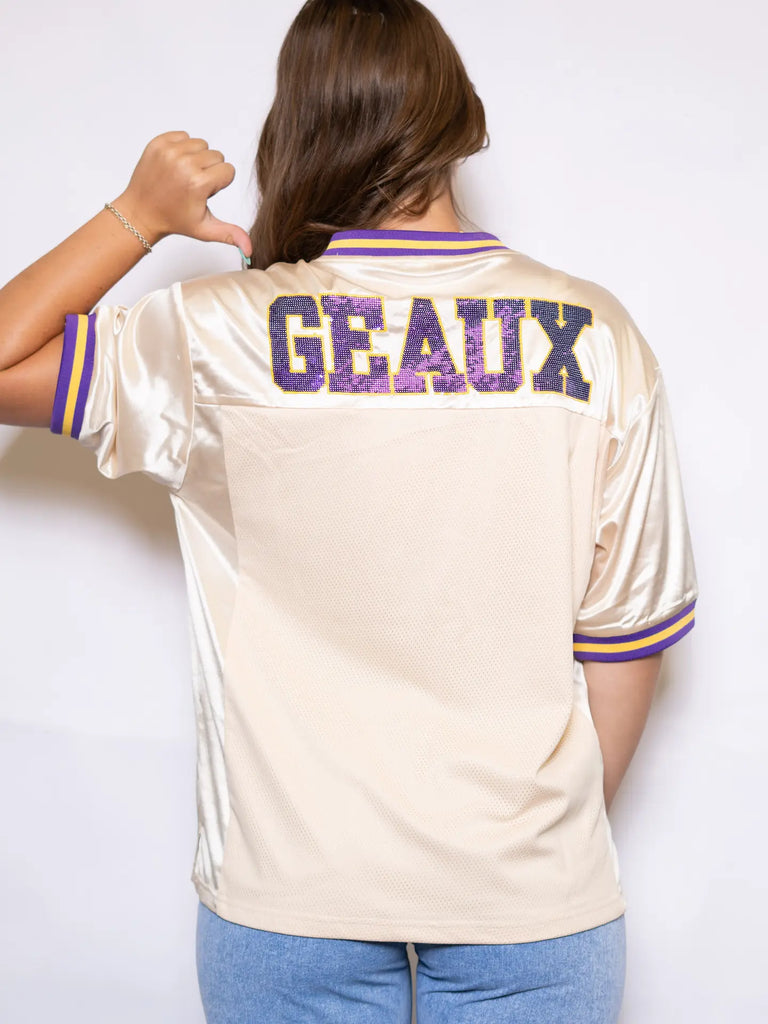 Get ready for nights in Death Valley in our OFFICIALLY LICENSED Football Jersey! The front features the iconic LSU Vintage Tiger in sequin embroidery, and Geaux on the back!
