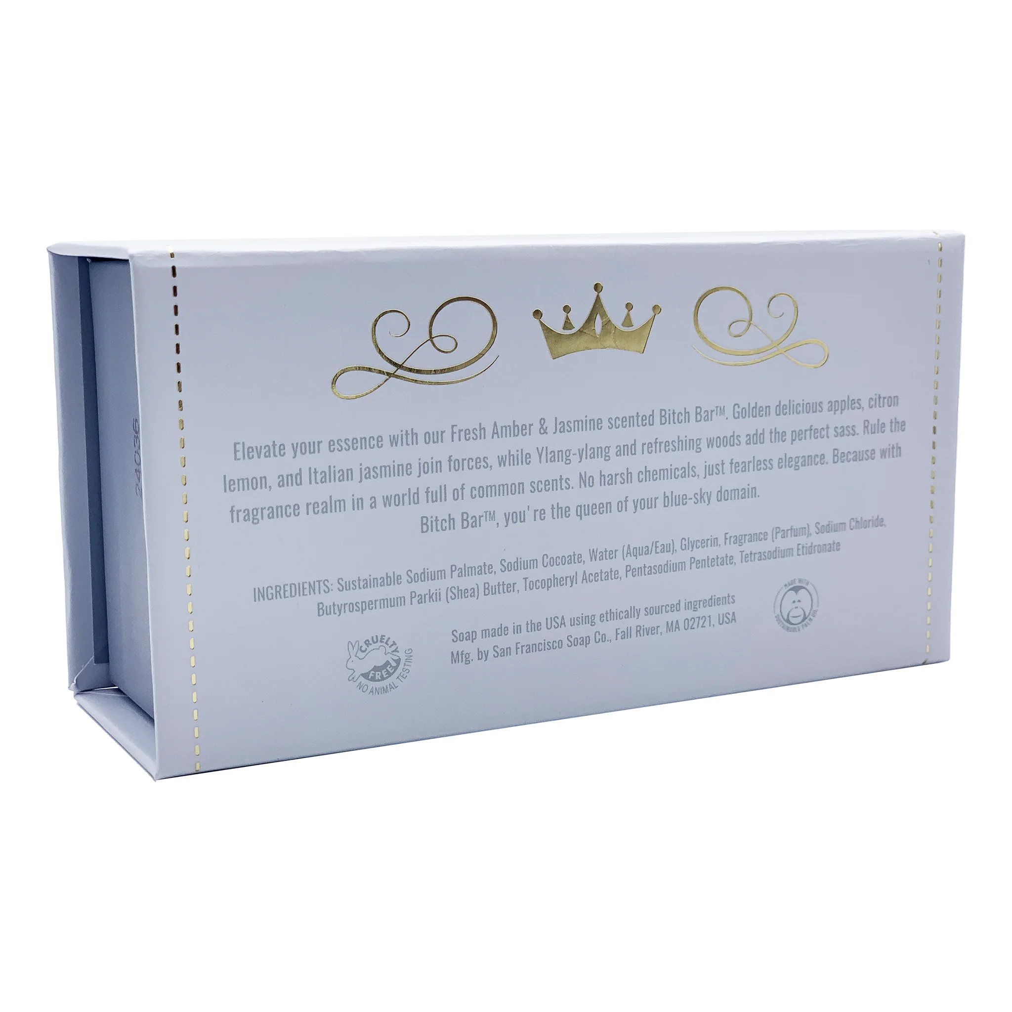 Elevate your essence with our Fresh Amber & Jasmine scented Bitch Bar. Golden delicious apples, citron lemon, and Italian jasmine join forces, while ylang-ylang and refreshing woods add the perfect sass. Rule the fragrance realm in a world full of common scents. No harsh chemicals, just fearless elegance. Because with Bitch Bar, you're the queen of your blue-sky domain.