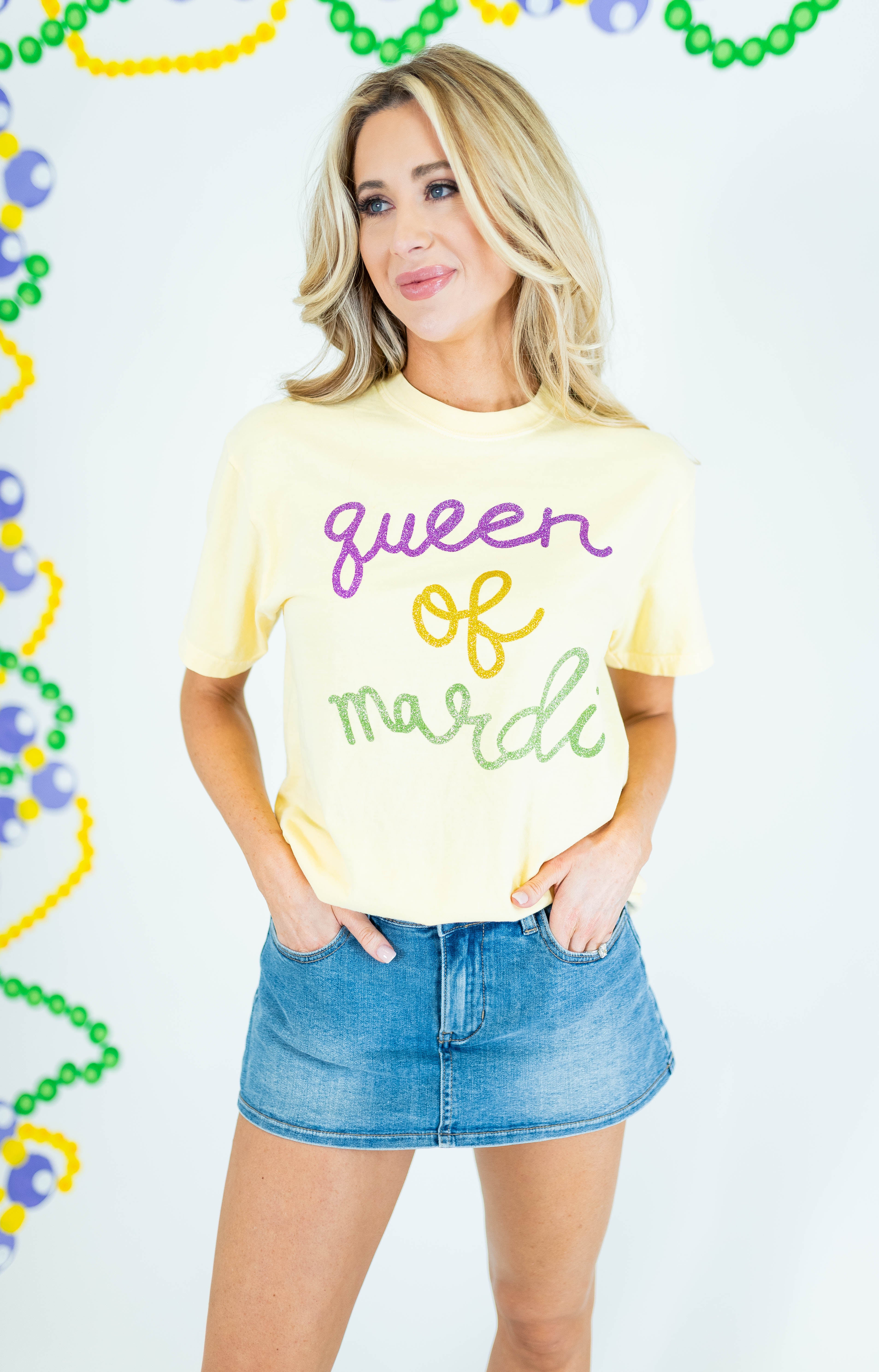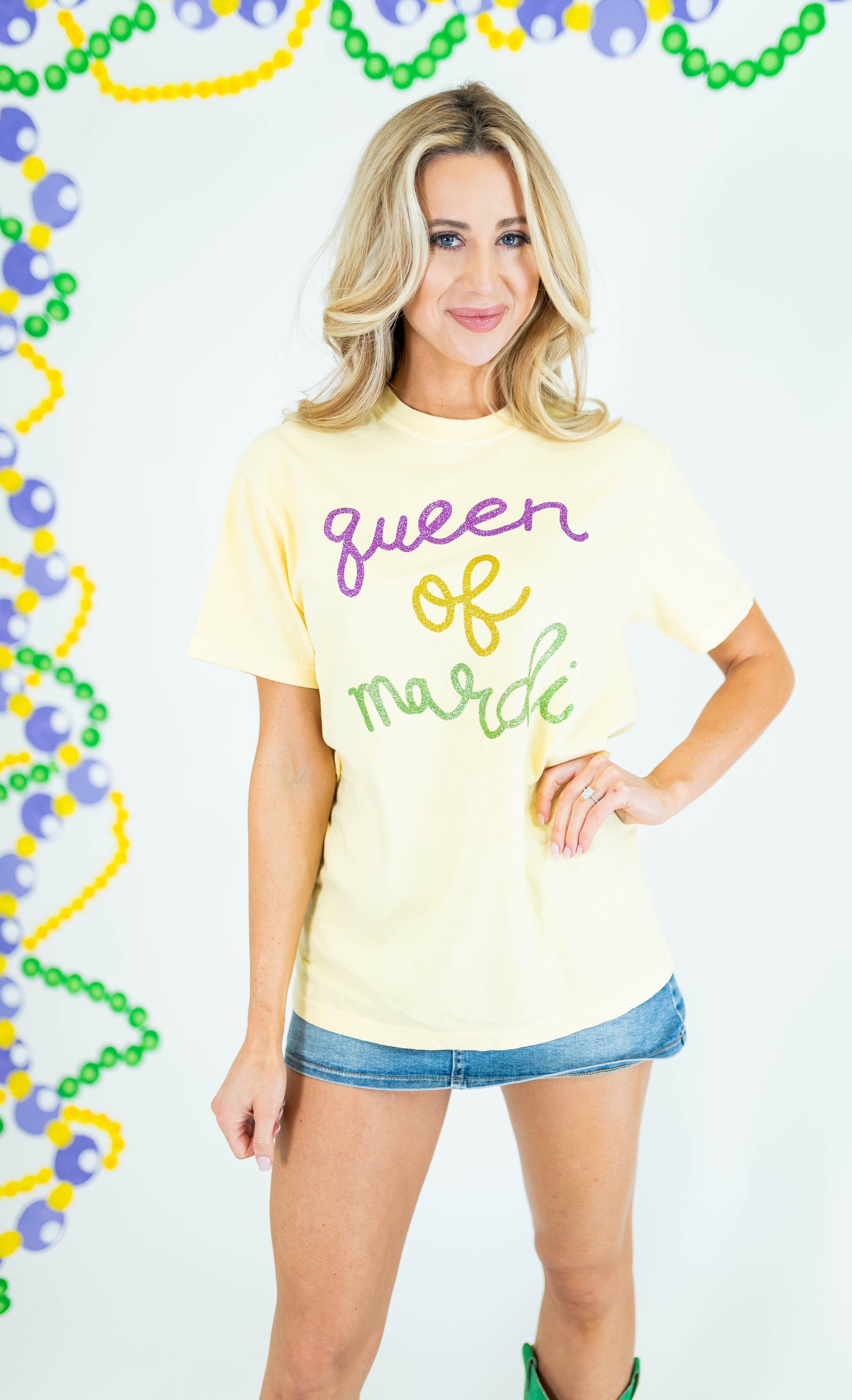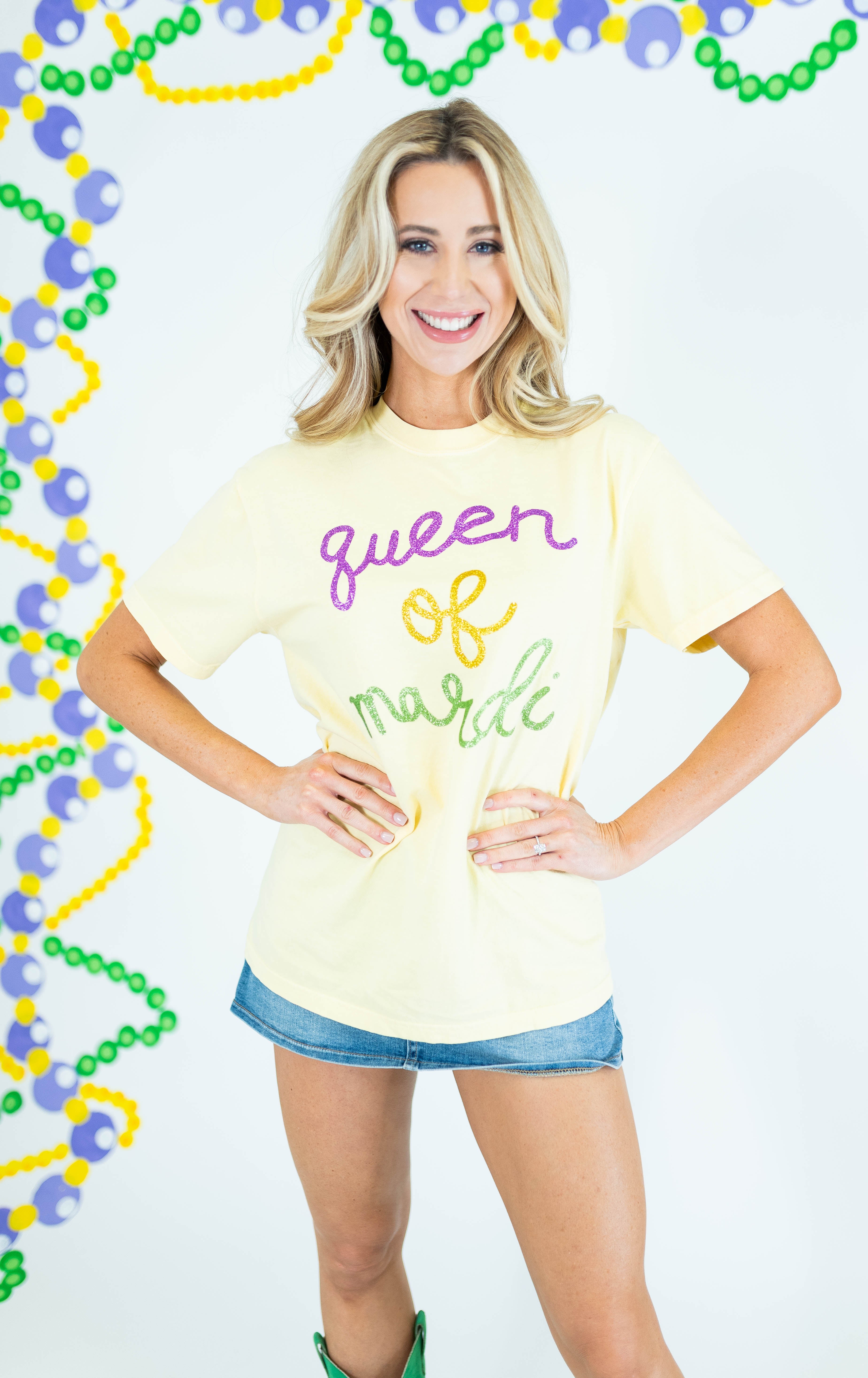 Celebrate Mardi Gras in style with this butter yellow Comfort Colors tee featuring eye-catching glitter detailing. The "Queen Of Mardi" design captures the festive spirit of the season with bold, shimmering graphics that stand out. Crafted from soft, breathable Comfort Colors fabric, this tee offers all-day wearability whether you're hitting the parade route or showing your Mardi Gras pride at a party. Perfect for collectors, party-goers, and anyone who loves festival fashion with a touch of sparkle.