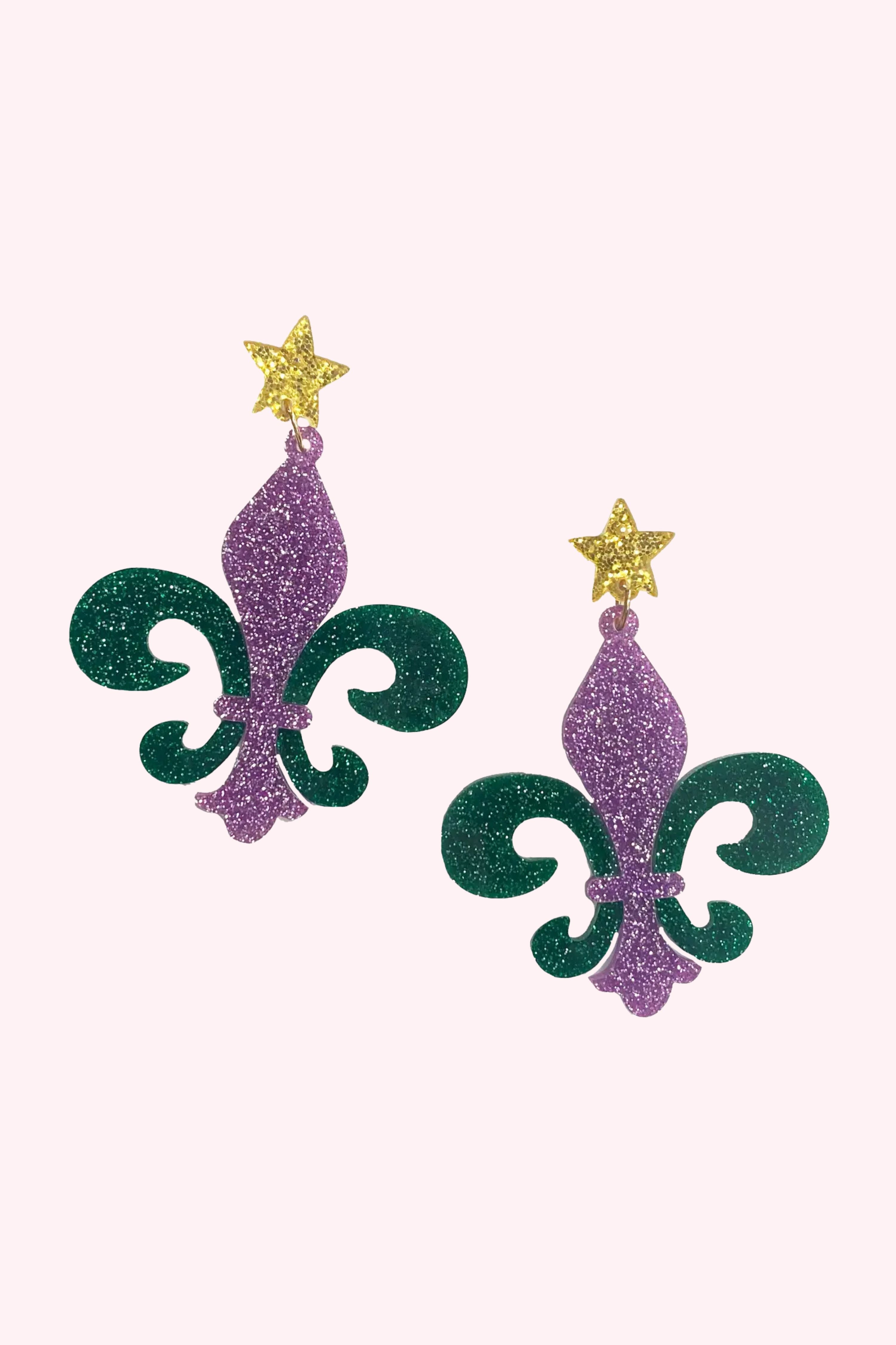 Accessorize your Mardi Gras look with these stylish Acrylic Fleur de Lis Earrings. Crafted from sturdy acrylic, these earrings feature colorful fleur de lis designs with a star on top, in the traditional purple, green and gold colors. Pair them with your favorite outfit for a fun, festive twist.