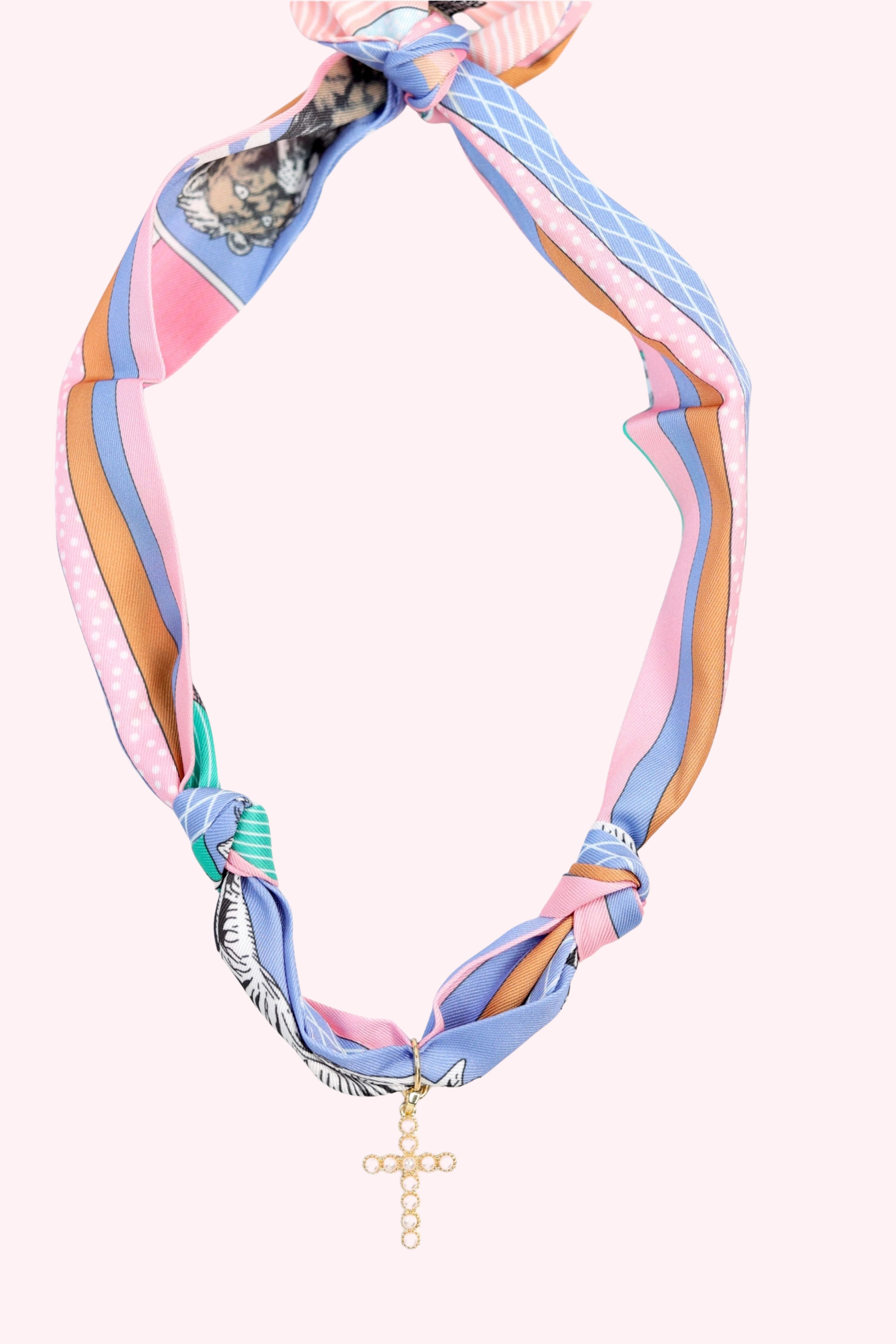 Add a touch of elegance with the Bekah Scarf Charm Necklace in Pink Multi. Featuring a delicate pearl cross charm, this fashionable accessory combines soft colors with a chic scarf design, making it perfect to elevate any outfit effortlessly. A must-have statement piece for your wardrobe.