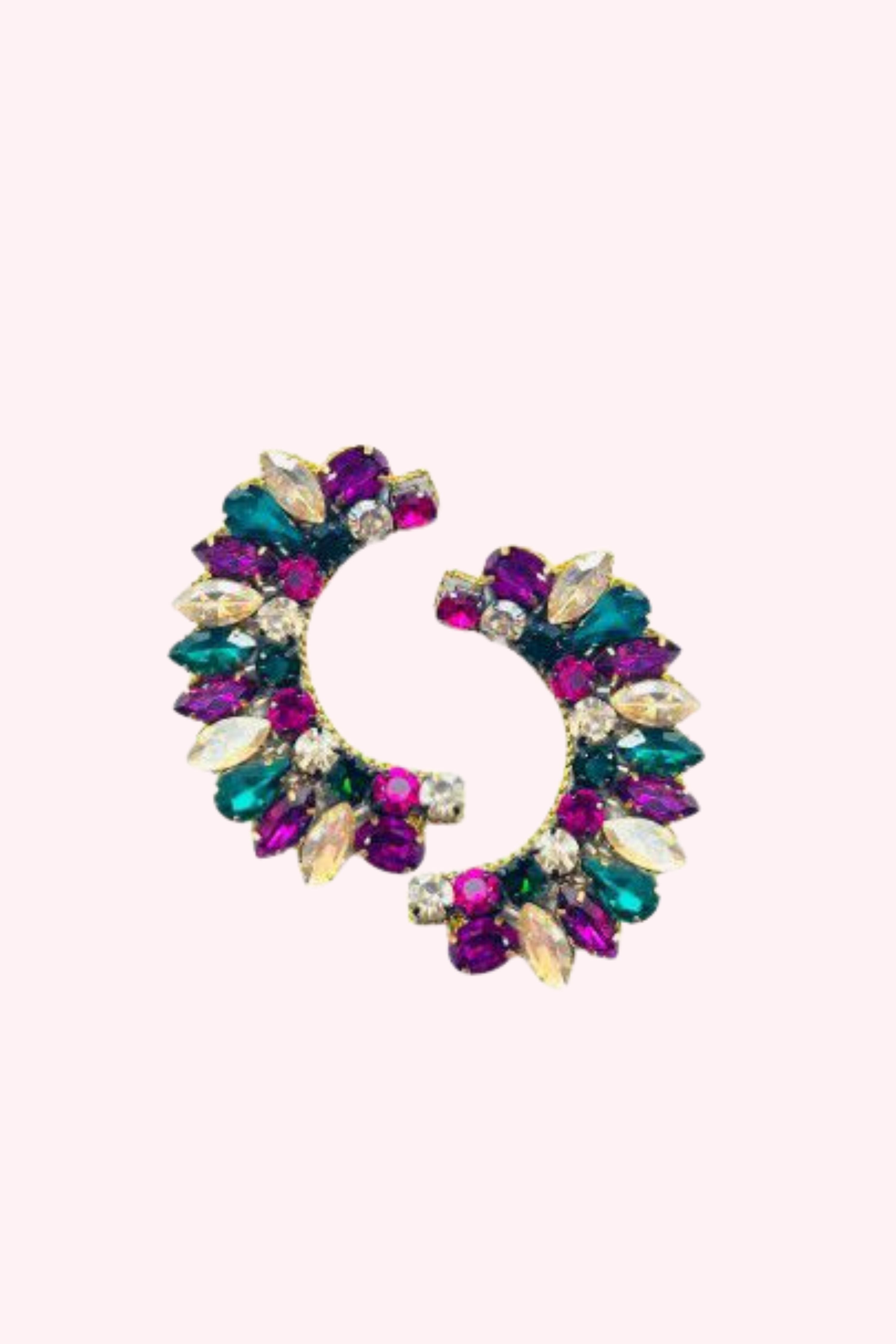Each stud is finished with a fan-style purple gemstone accent that adds dimension, shine, and a dramatic pop of color. Lightweight yet eye-catching, these earrings are the perfect finishing touch for parade outfits, parties, and festive celebrations.
