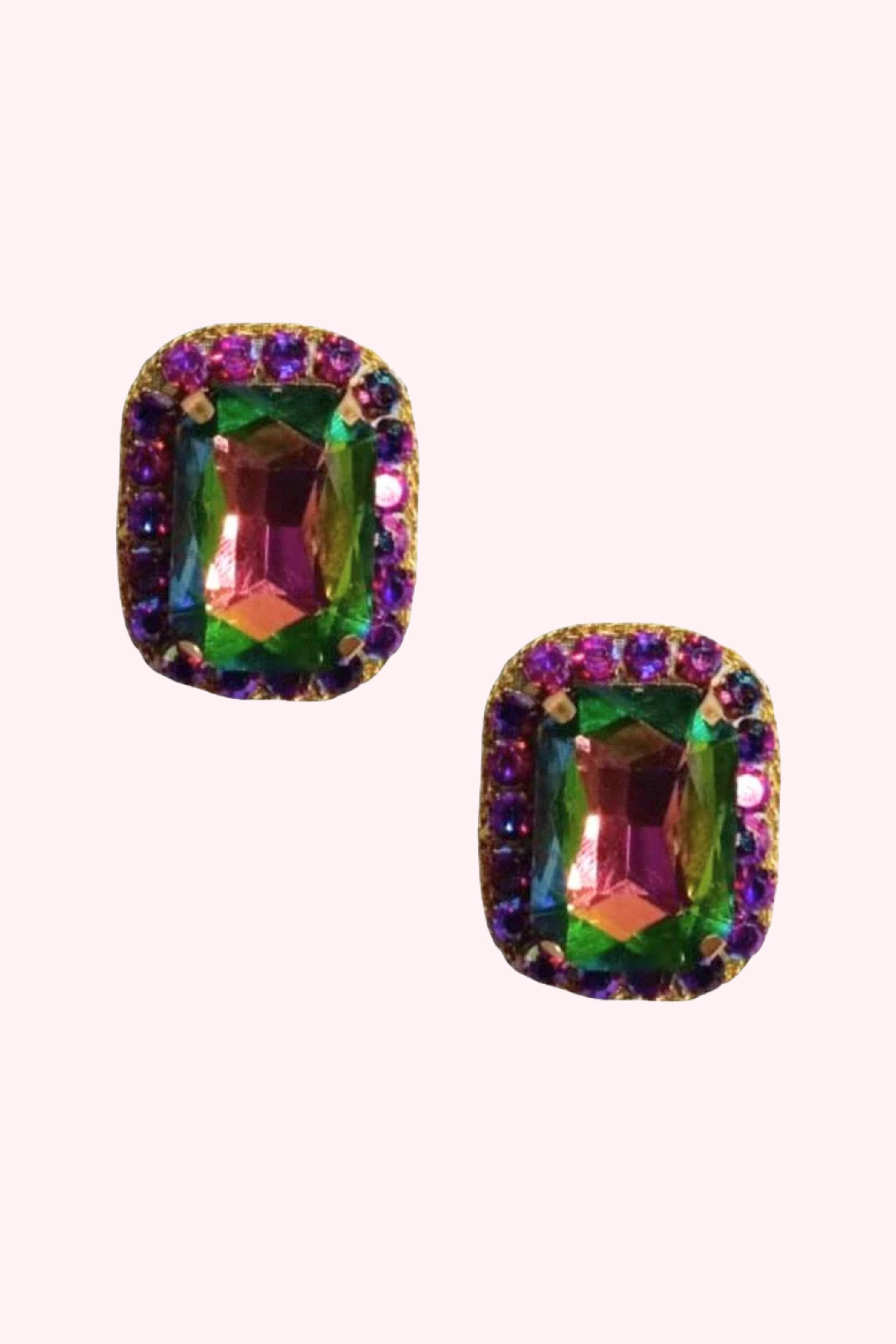 Bring bold sparkle to your Carnival look with our Mardi Gras Statement Stud Earrings. These vibrant studs feature a radiant emerald-cut gemstone that shifts beautifully between green, pink, and gold tones—perfectly capturing the magic of Mardi Gras.