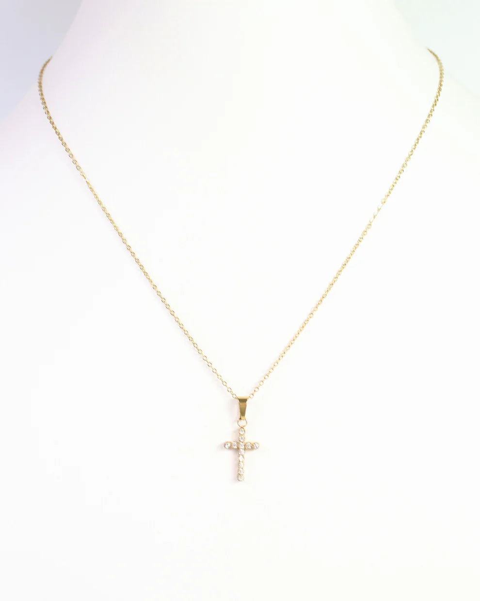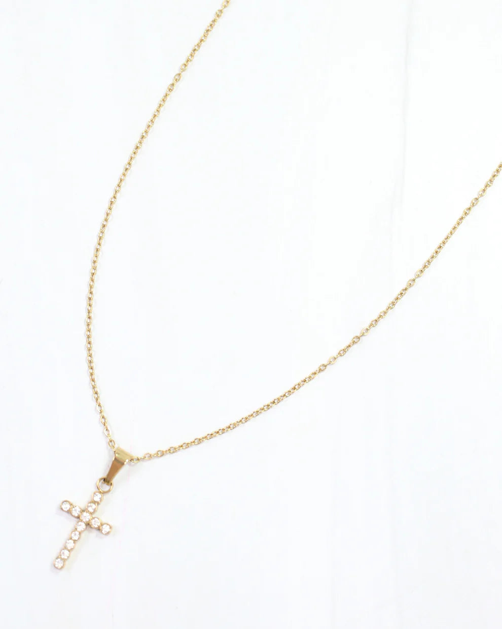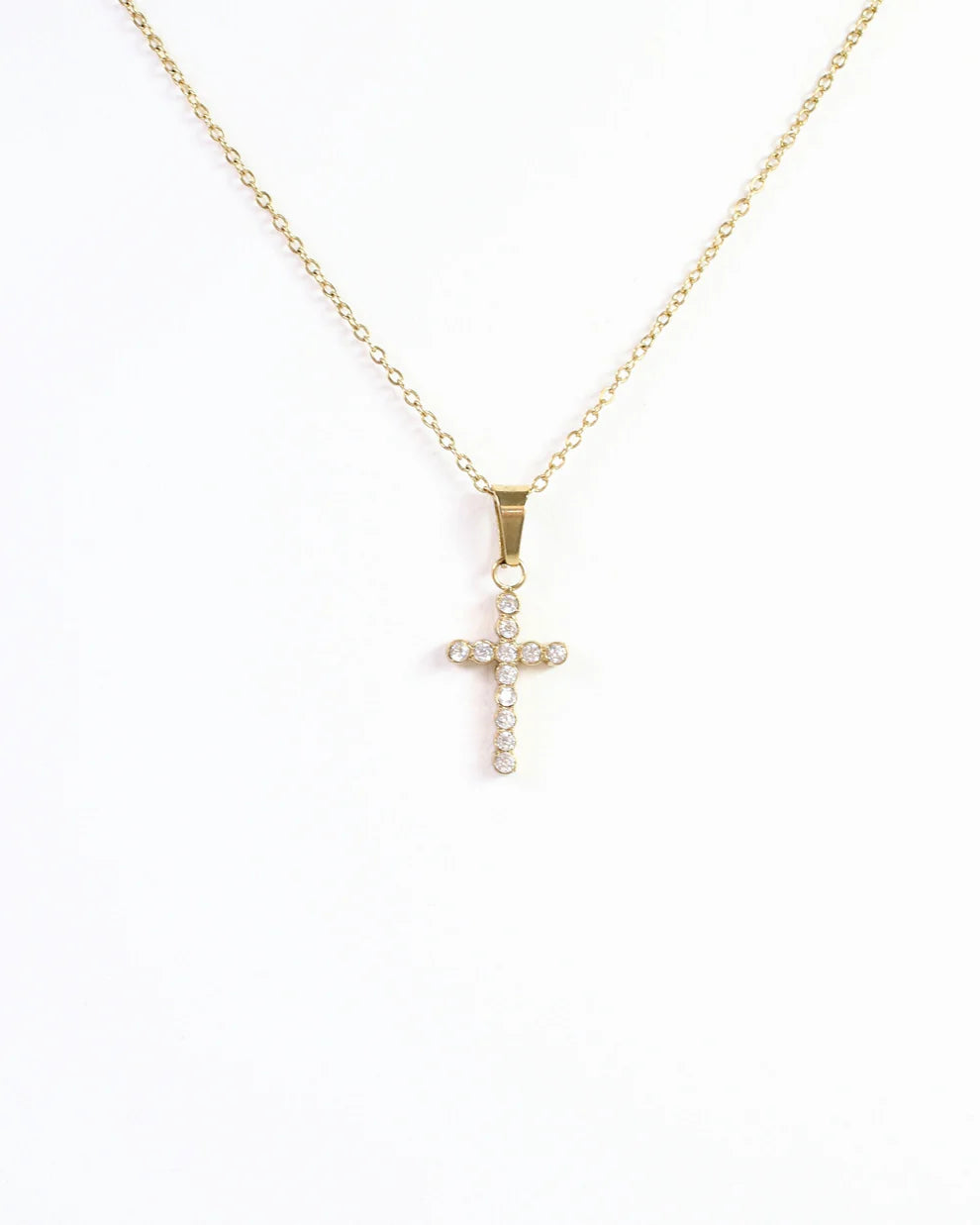 The Jamey CZ Cross Necklace in Gold features a dazzling pave CZ cross on a delicate, shiny chain. This elegant piece adds a refined sparkle and modern edge to your jewelry collection.