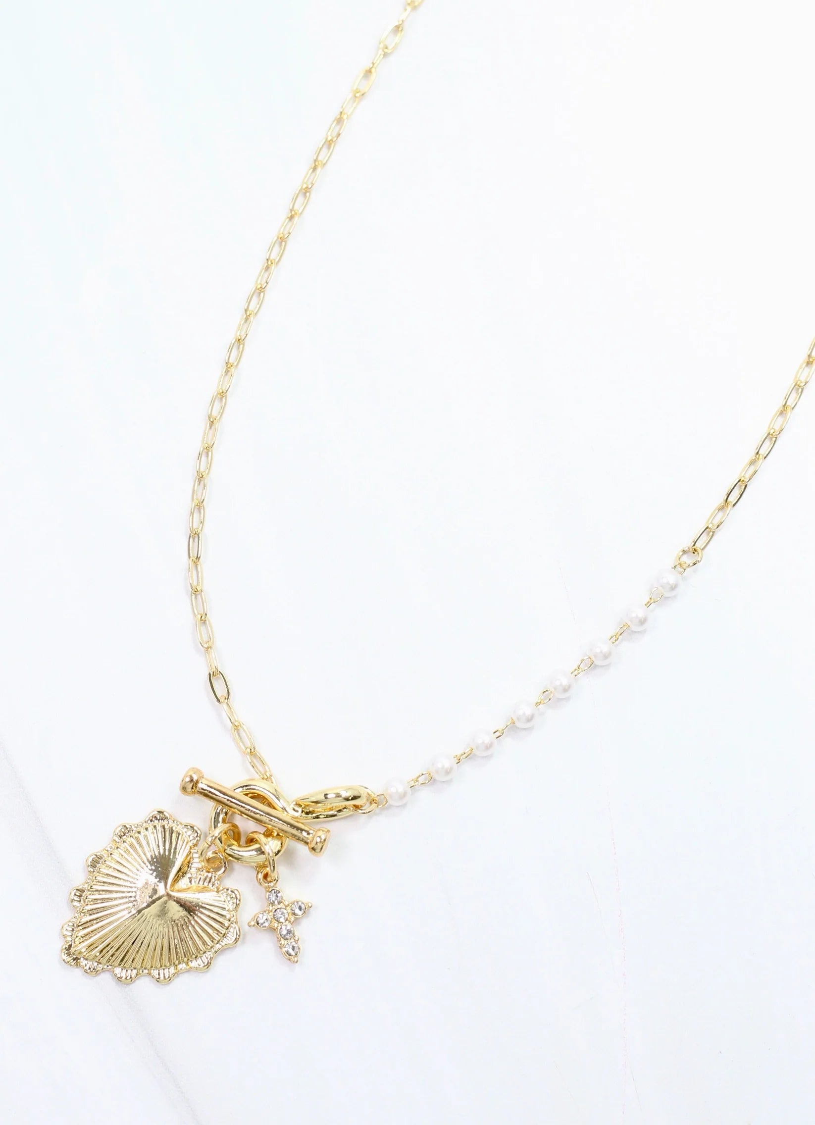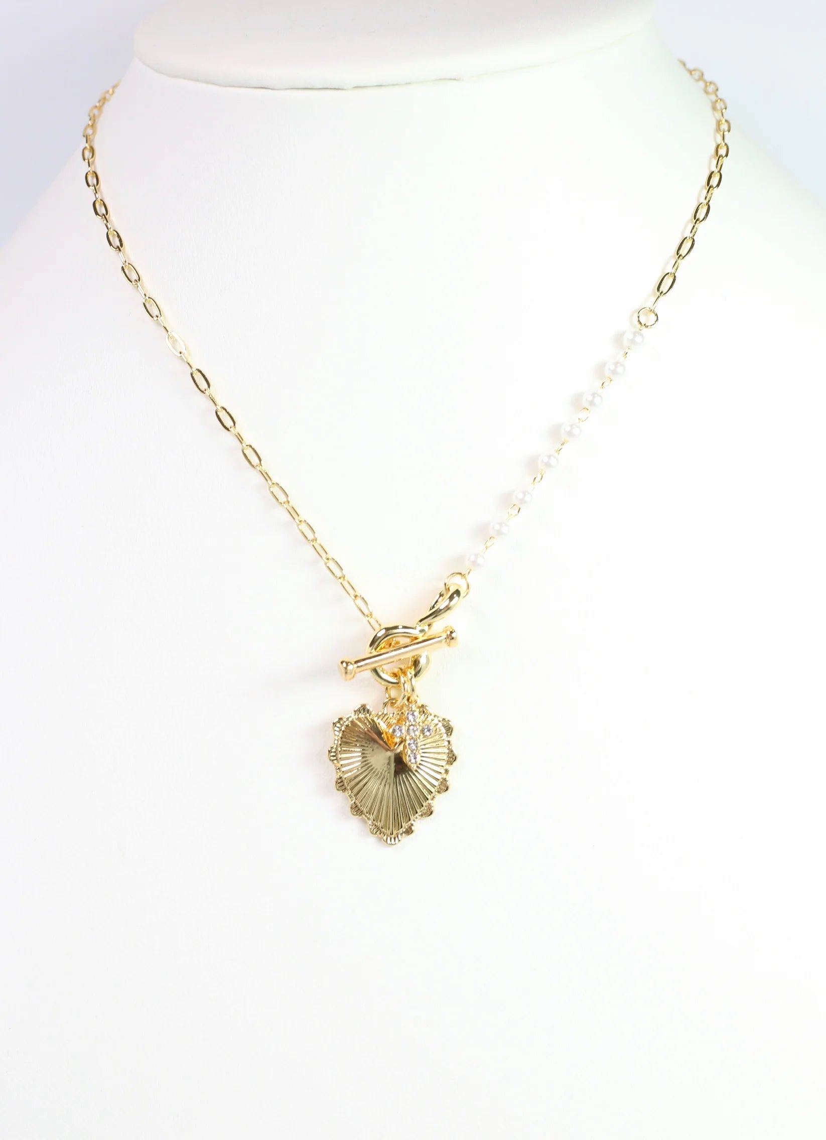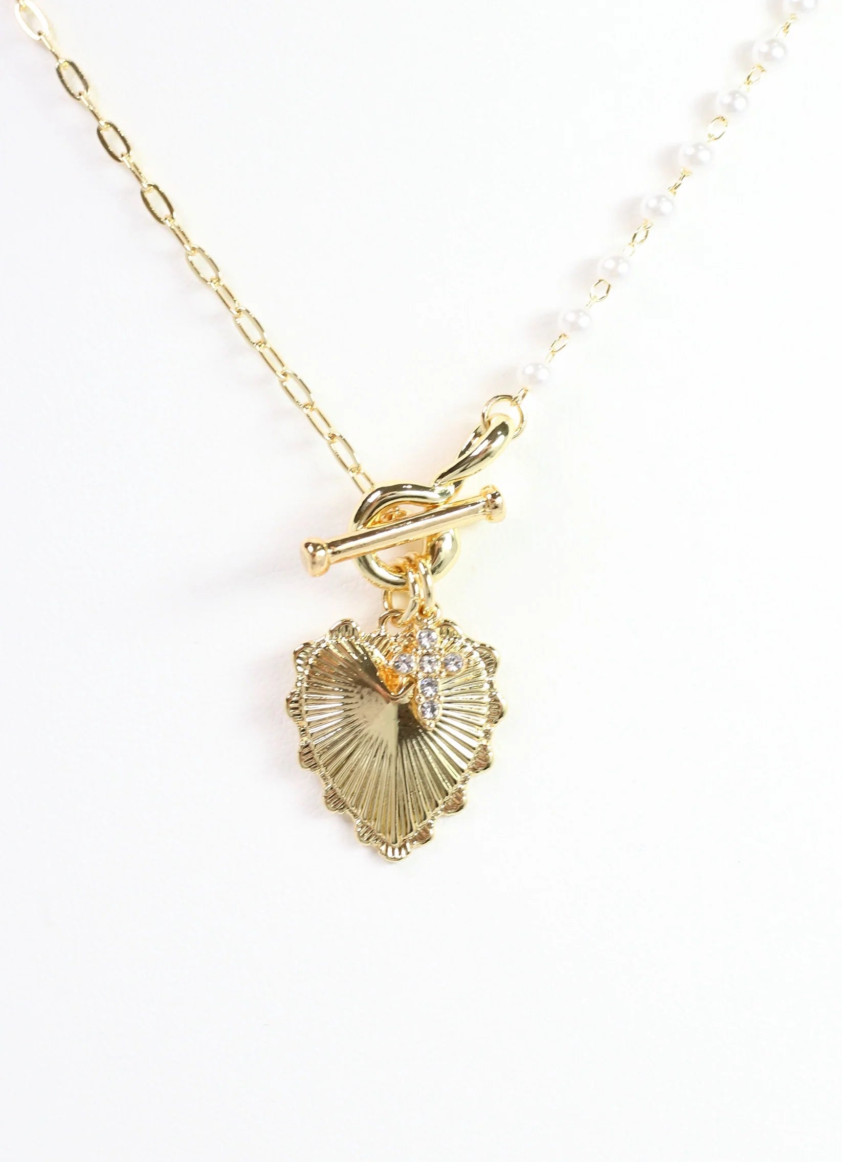This thin link necklace has an accent row of pearls on the chain as well as a front toggle closure. It features a ribbed heart charm with a scalloped edge and a CZ lined petite cross as well.