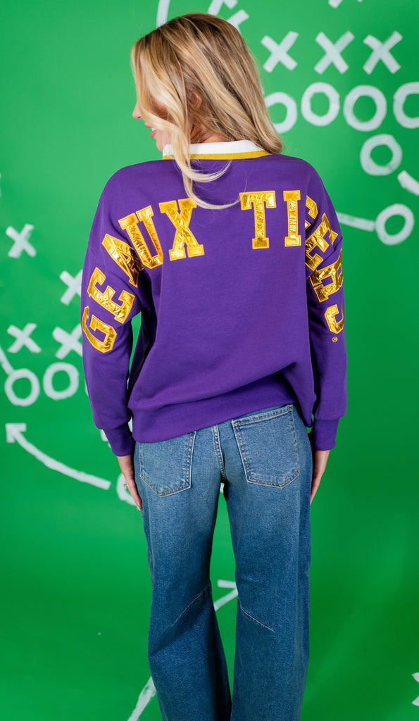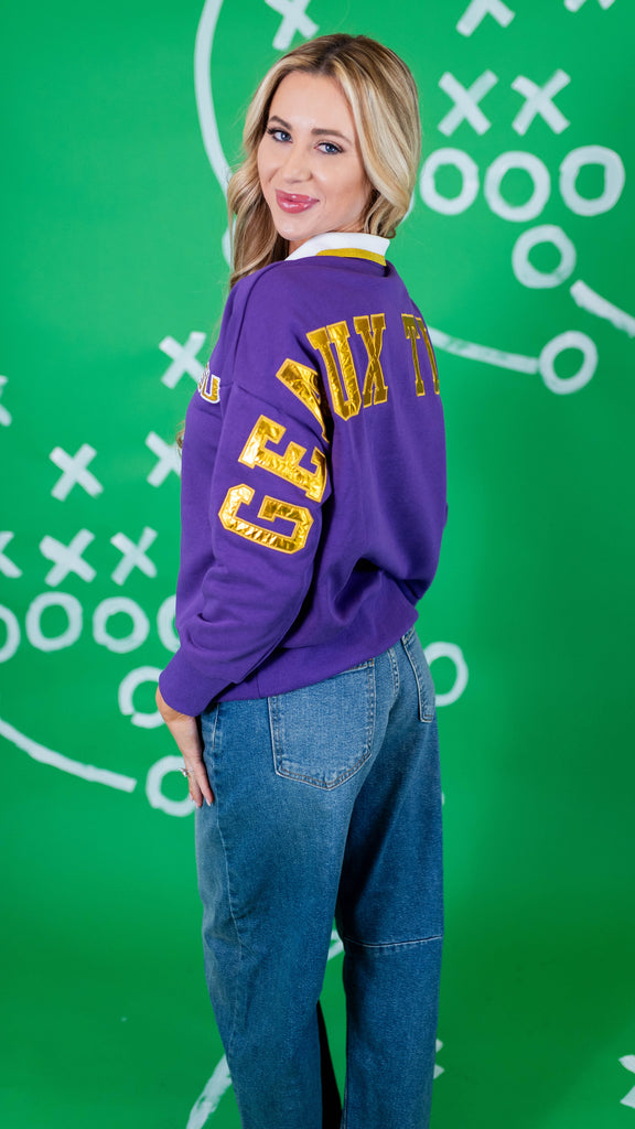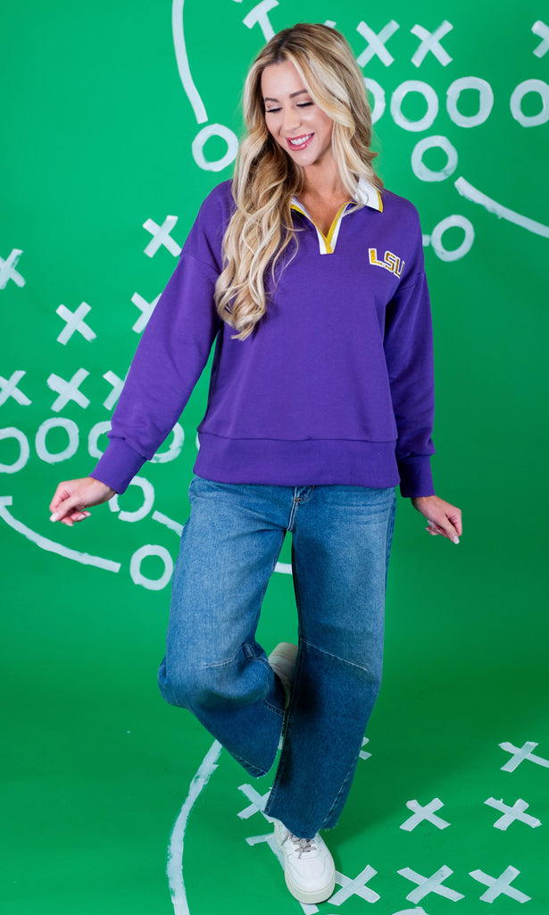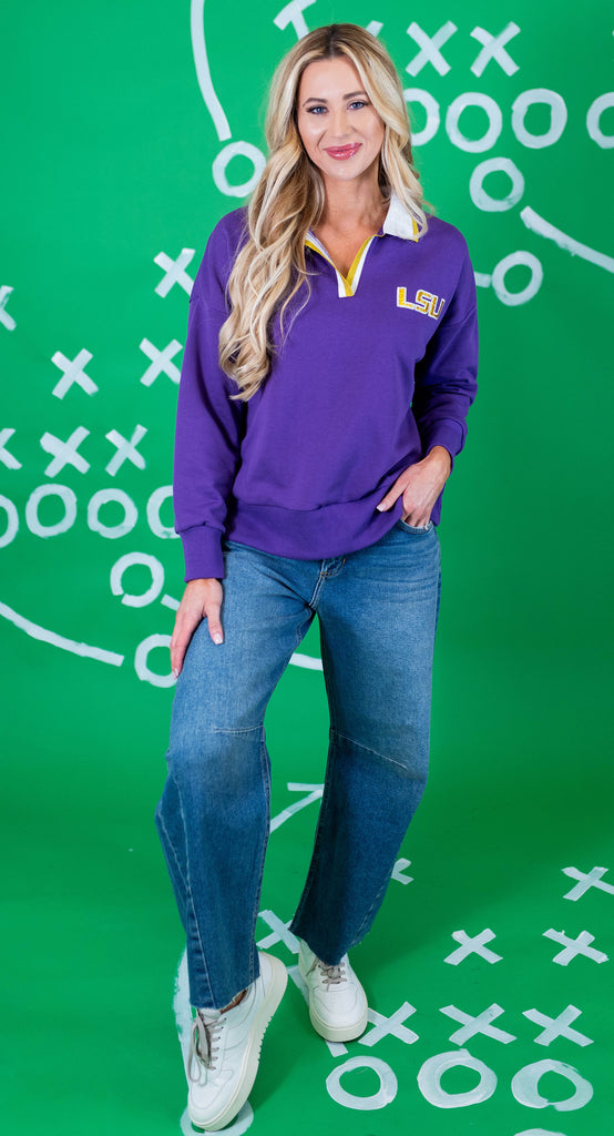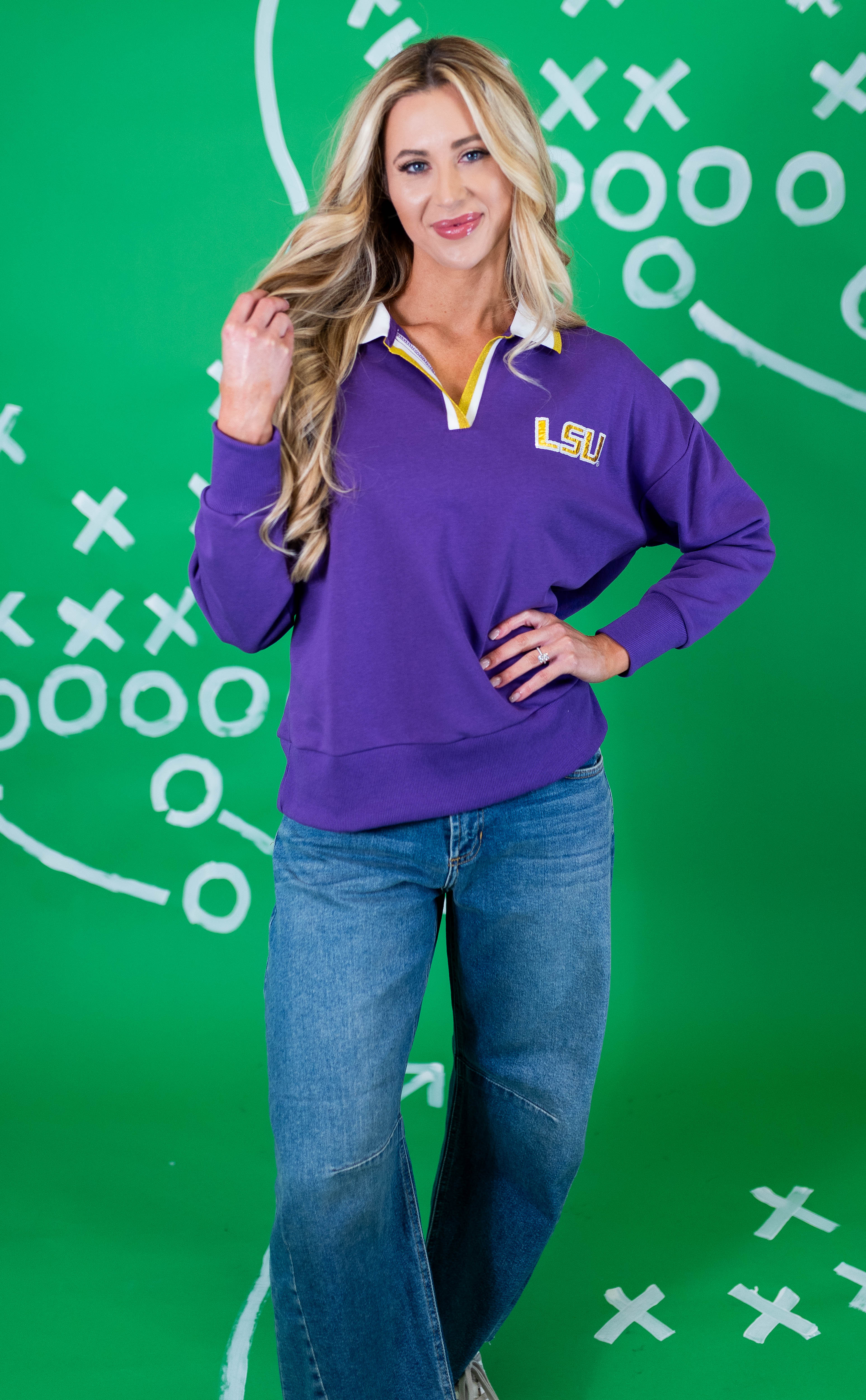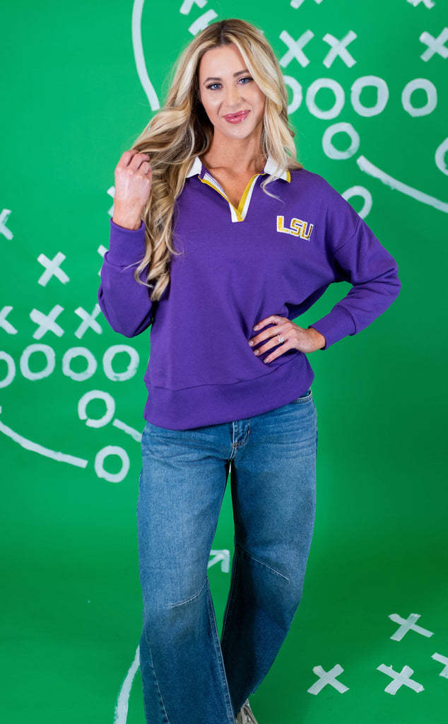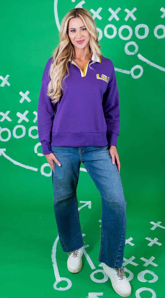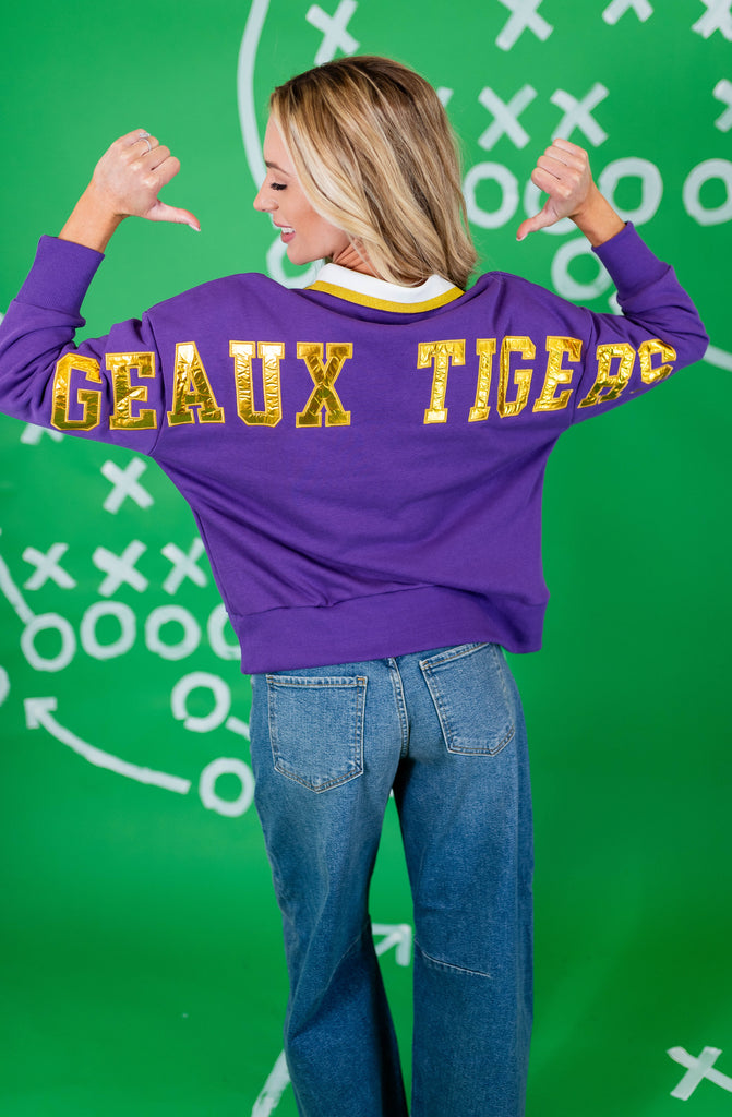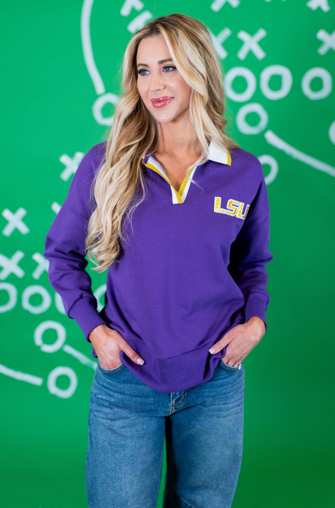 Show your Tigers pride in comfort and style with the Brianna Cannon LSU Club Sweatshirt. Featuring the iconic LSU logo prominently on the front and the spirited "Geaux Tiger" across the back, this sweatshirt lets you cheer on your team wherever you go. Perfect for chilly game days or casual wear, it combines bold design with cozy fabric to keep you warm and connected to your LSU roots. Elevate your fan gear and celebrate your loyalty in authentic colors and standout style.