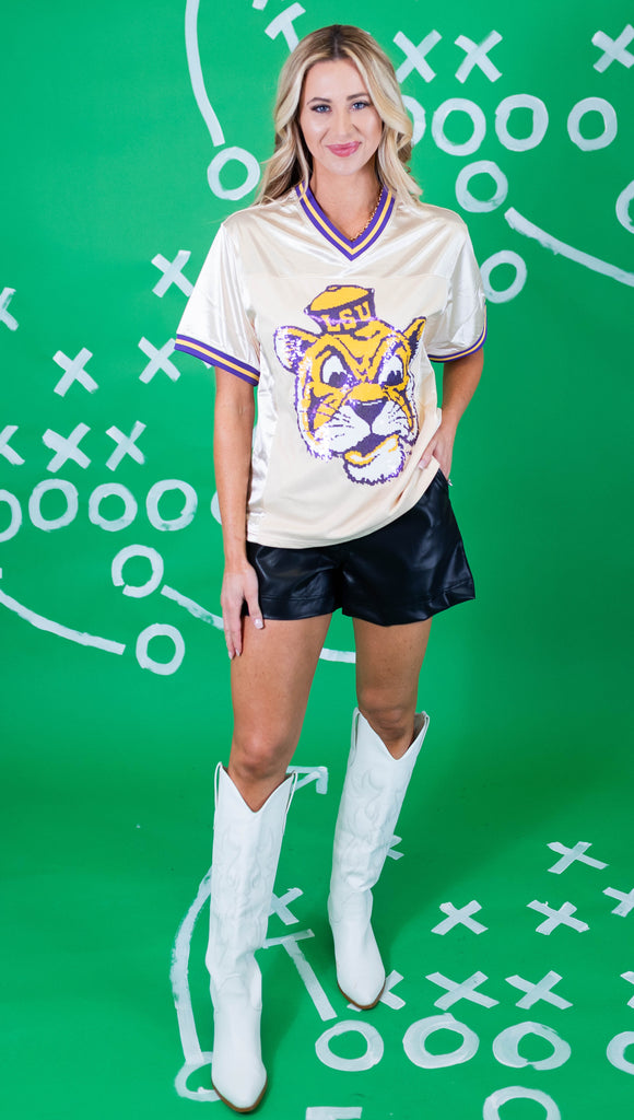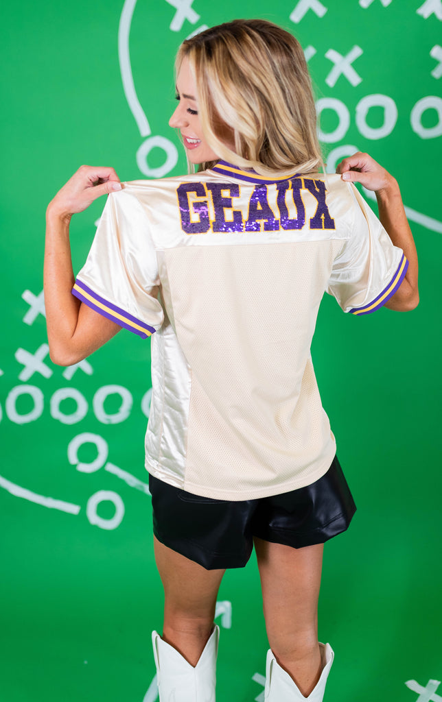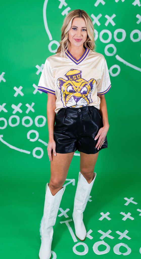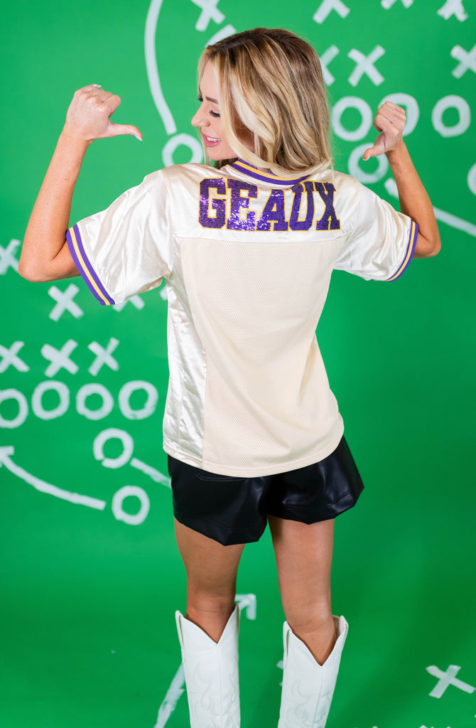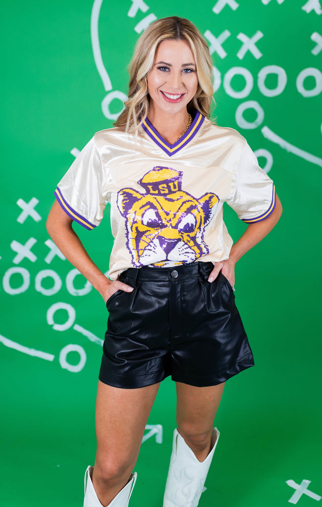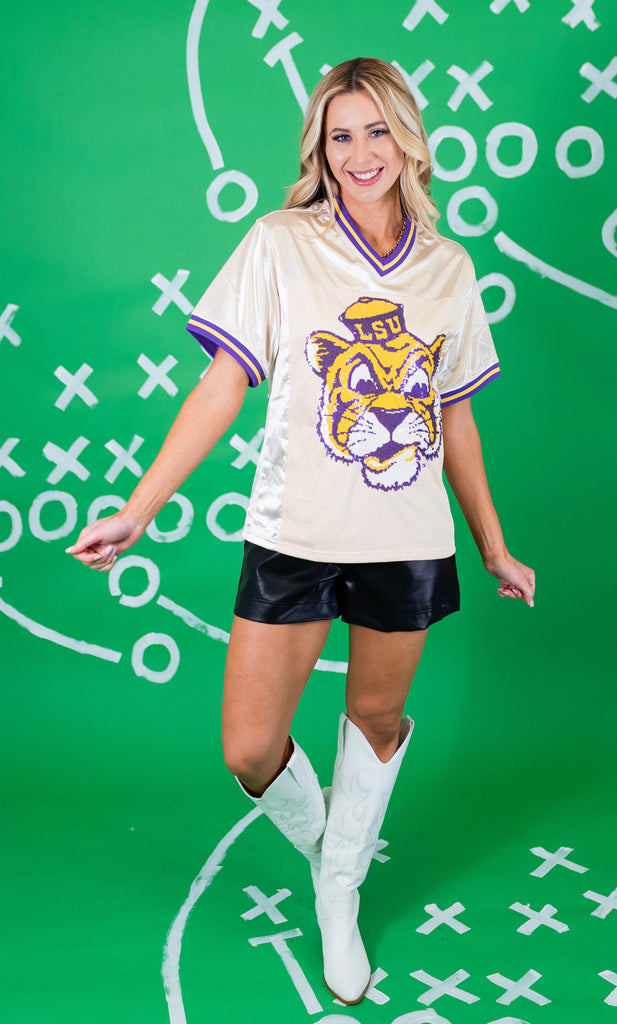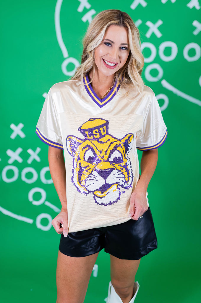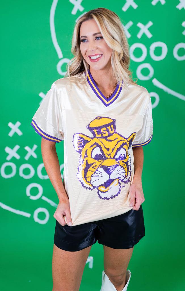 Get ready for nights in Death Valley in our OFFICIALLY LICENSED Football Jersey! The front features the iconic LSU Vintage Tiger in sequin embroidery, and Geaux on the back!