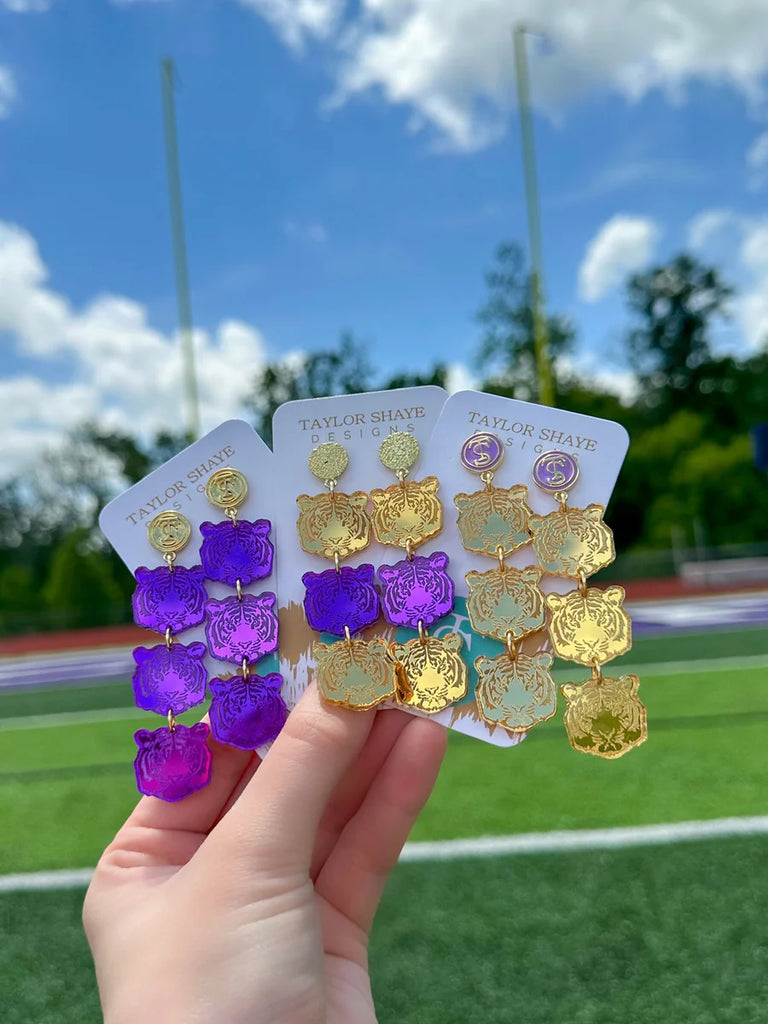 Taylor Shaye: Triple Tiger Head Drop Earrings - Purple/Gold Tiger