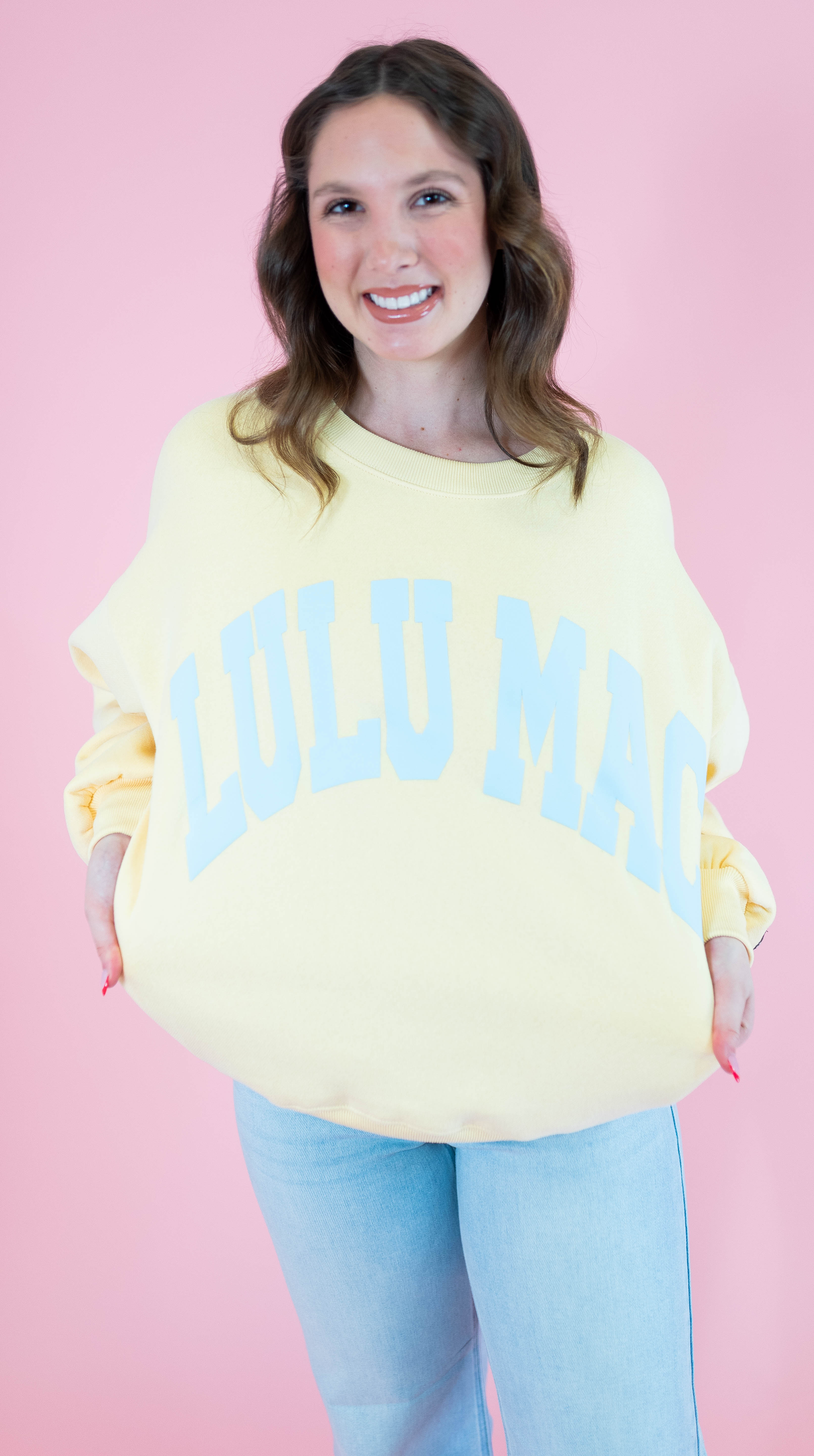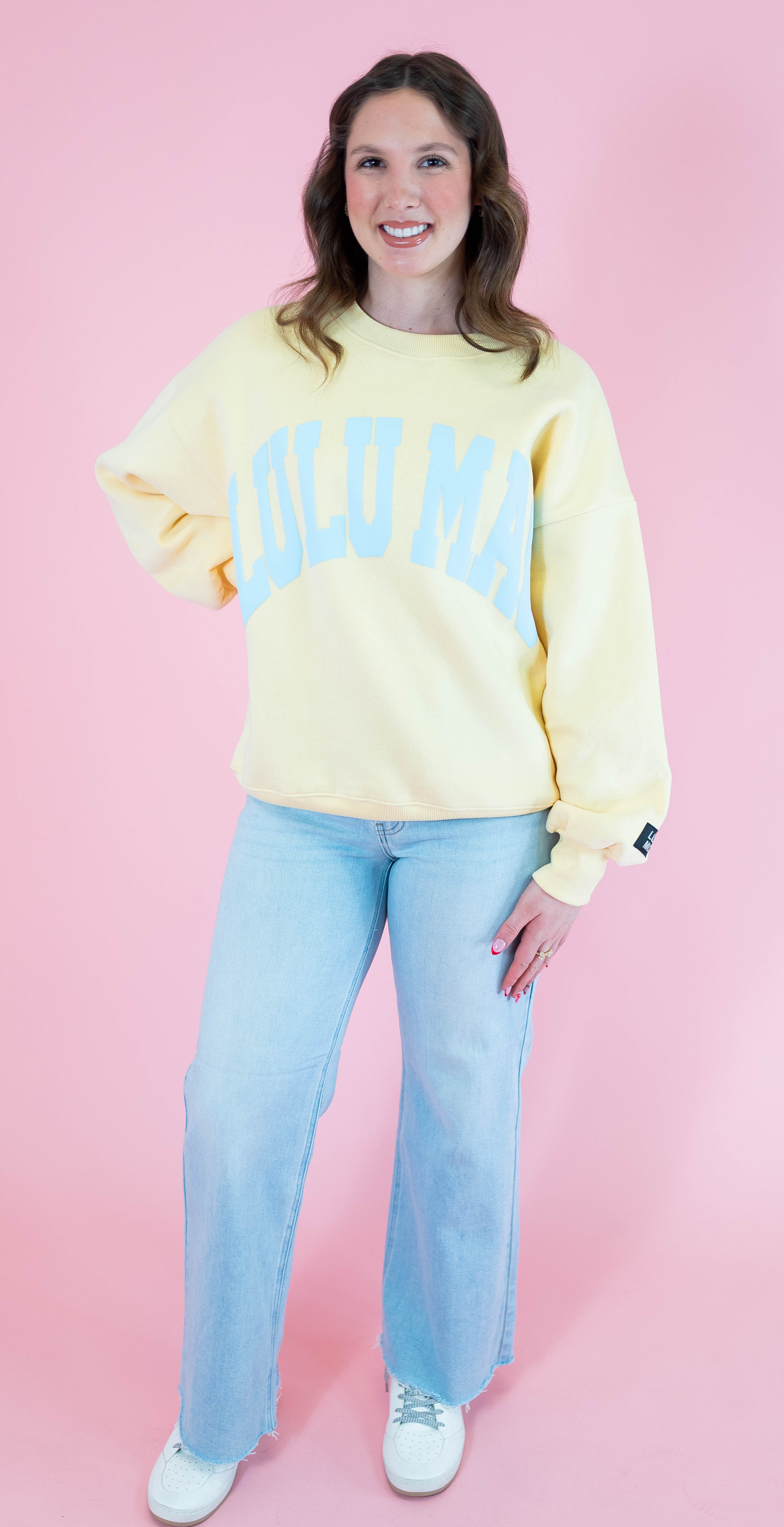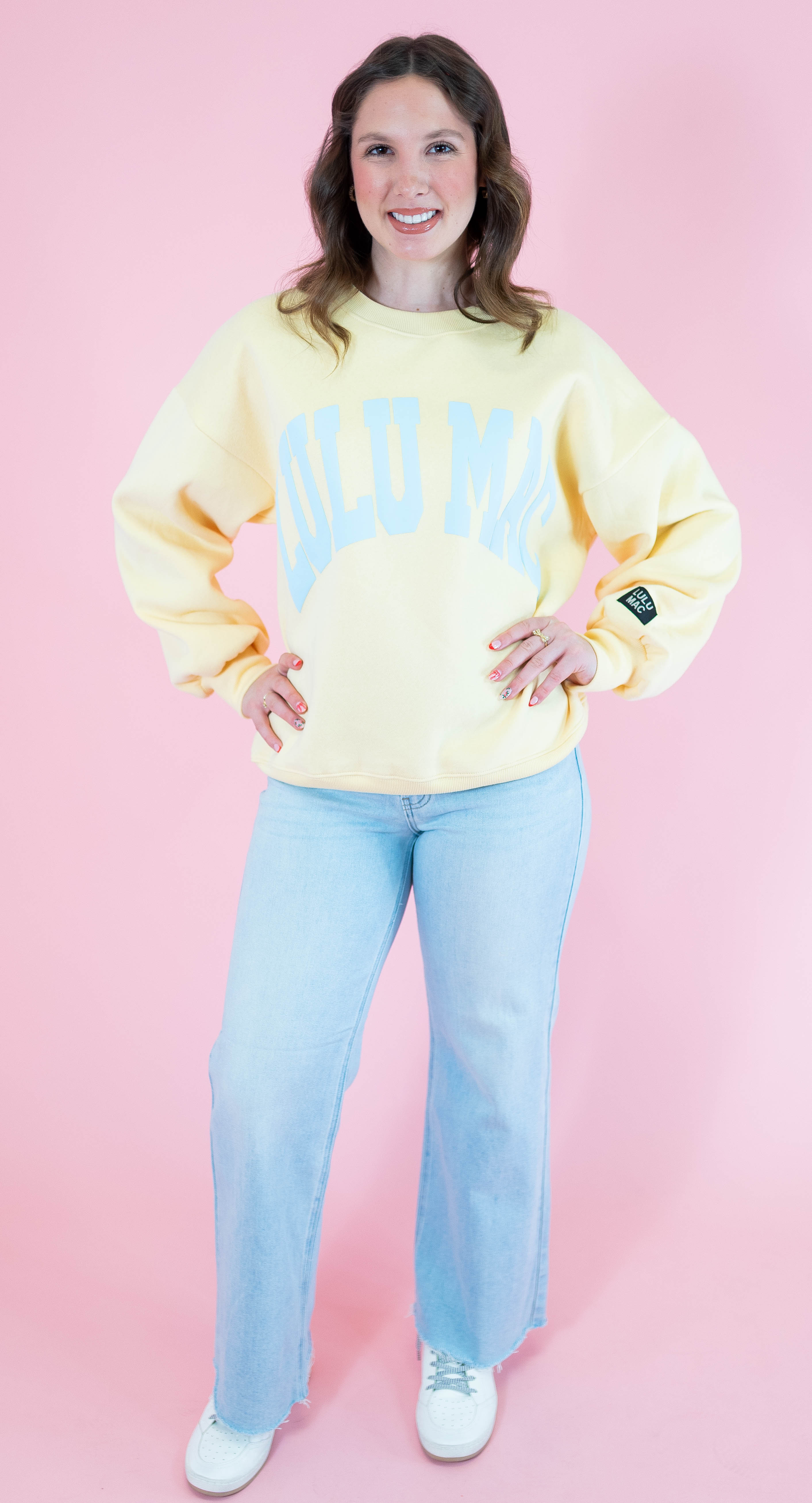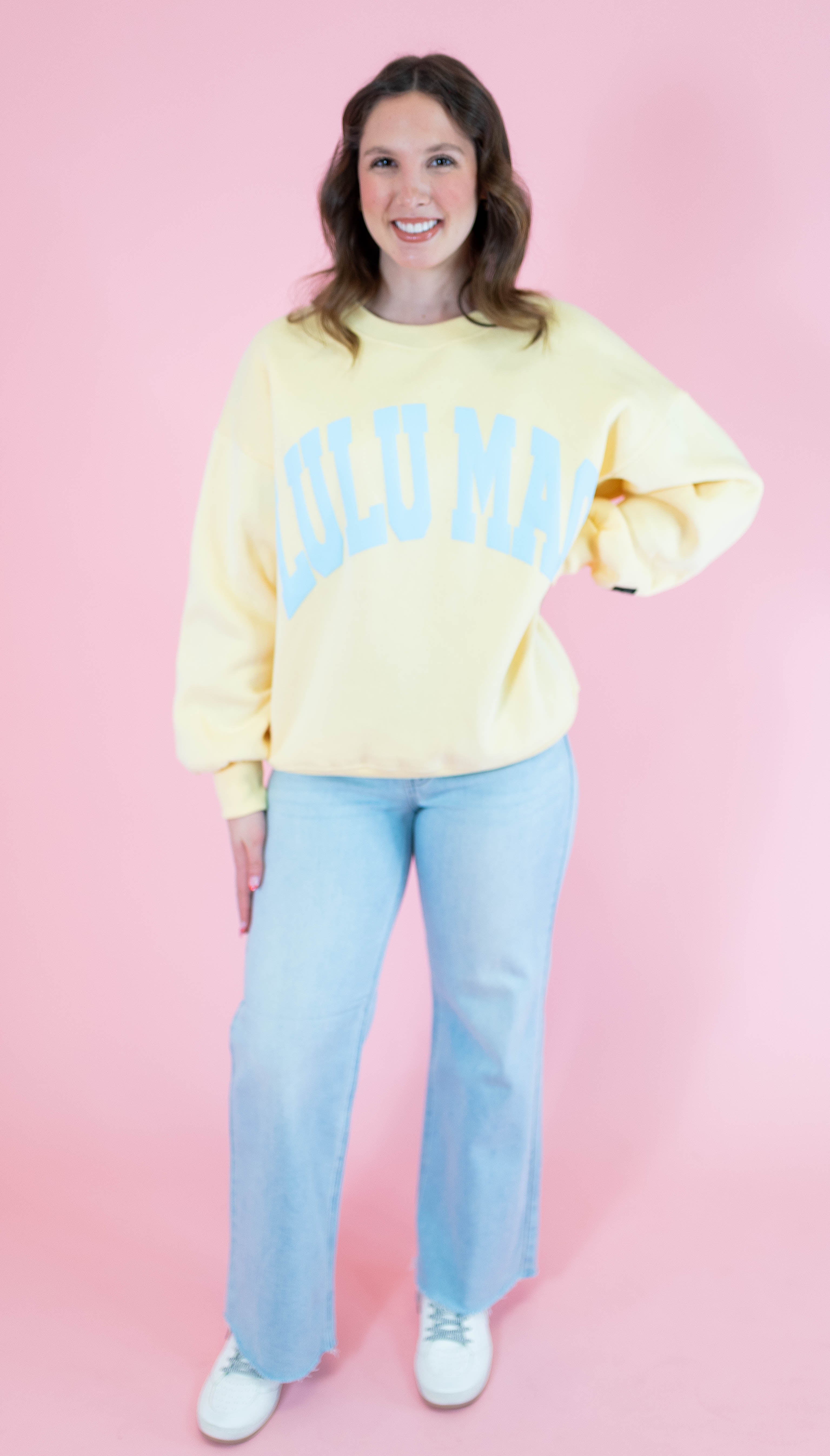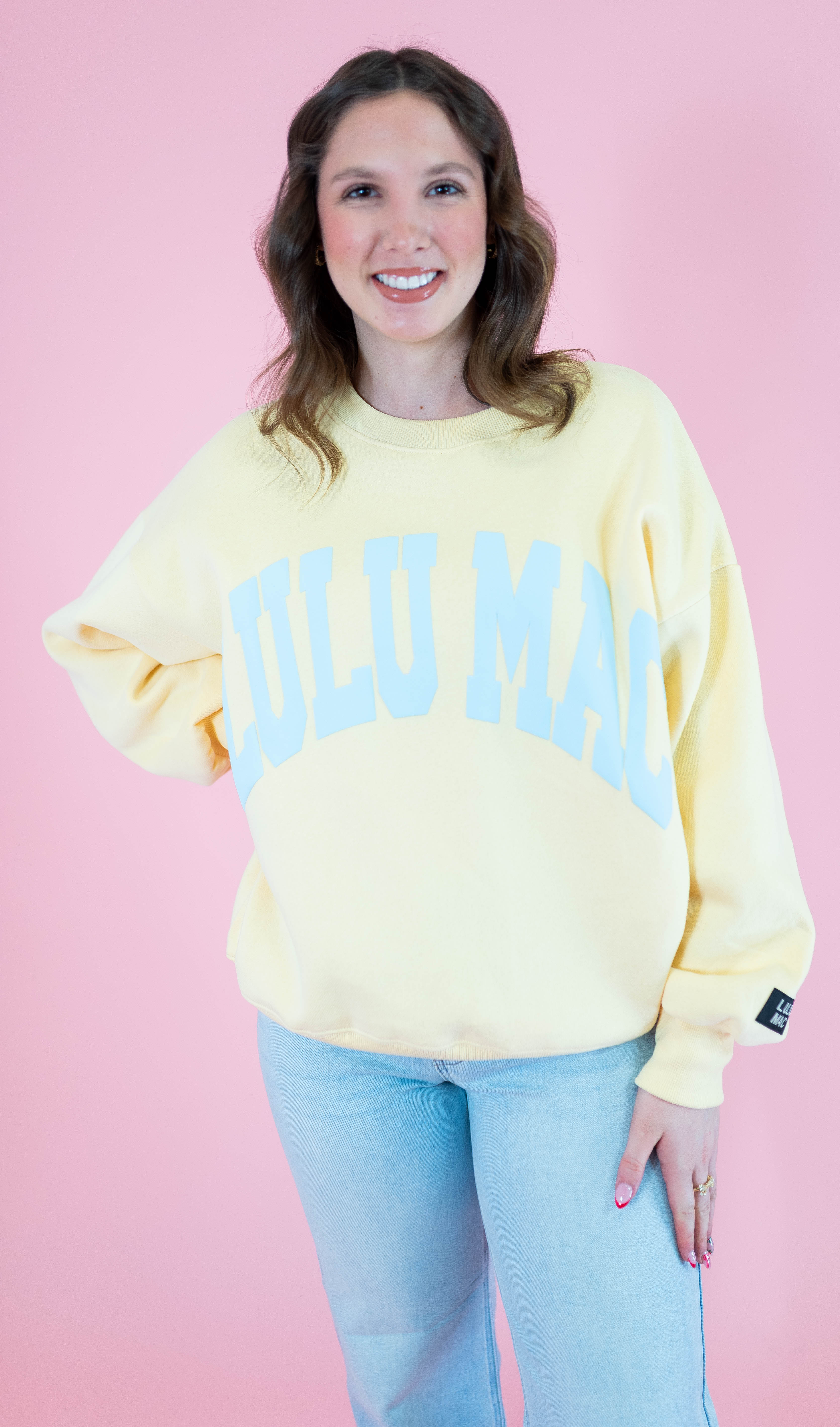 Snuggle into the Lulu Mac Sweatshirt in Butter/Light Blue! Crafted from a cozy 50% cotton and 50% polyester blend, it features playful puff letter detailing that adds a fun, textured twist to your comfy everyday look. Perfect for bright days and cozy play!