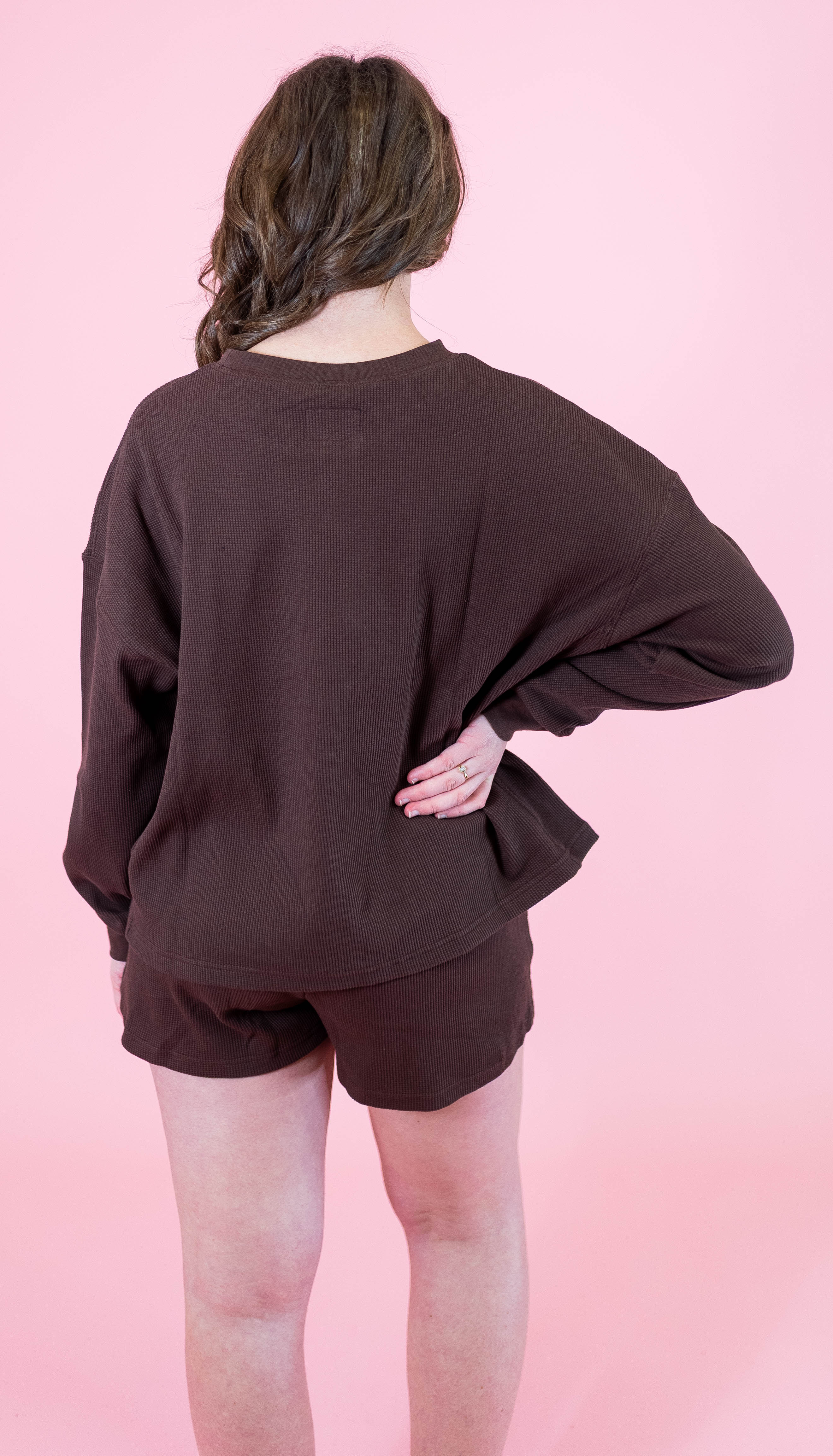 Stay cozy and cute in our Waffle Pop Collection Long Sleeve Top! Made from soft, breathable waffle knit fabric(95% Cotton and 5% Spandex), this relaxed, oversized fit is perfect for lounging, layering, or pairing with the matching pants for the ultimate comfy set. The easy slip-on style makes it effortless, while the timeless design keeps it chic and versatile.