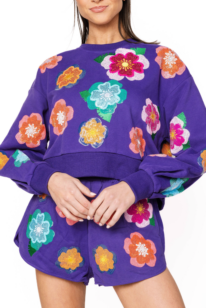 Queen Of Sparkles: Bright Purple Multi Float Flower Sweatshirt